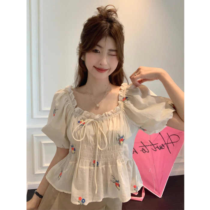 플러스 사이즈 꽃무늬 티셔츠 퍼프 슬리브 셔츠 여성 여름 새로운 디자인 틈새 달콤한 프렌치 반팔 탑 여성용