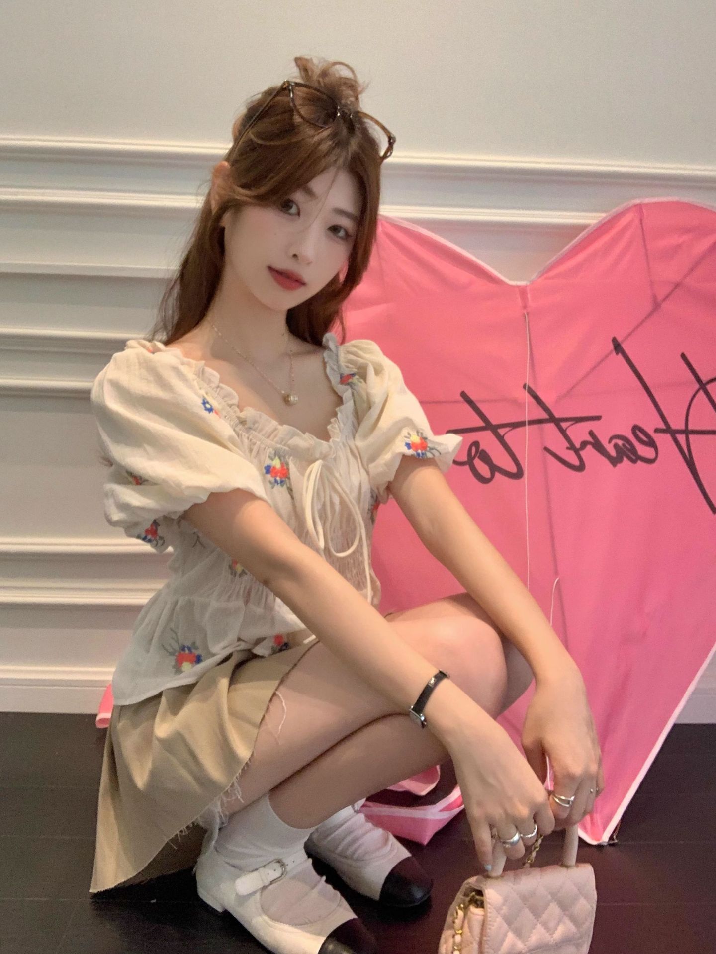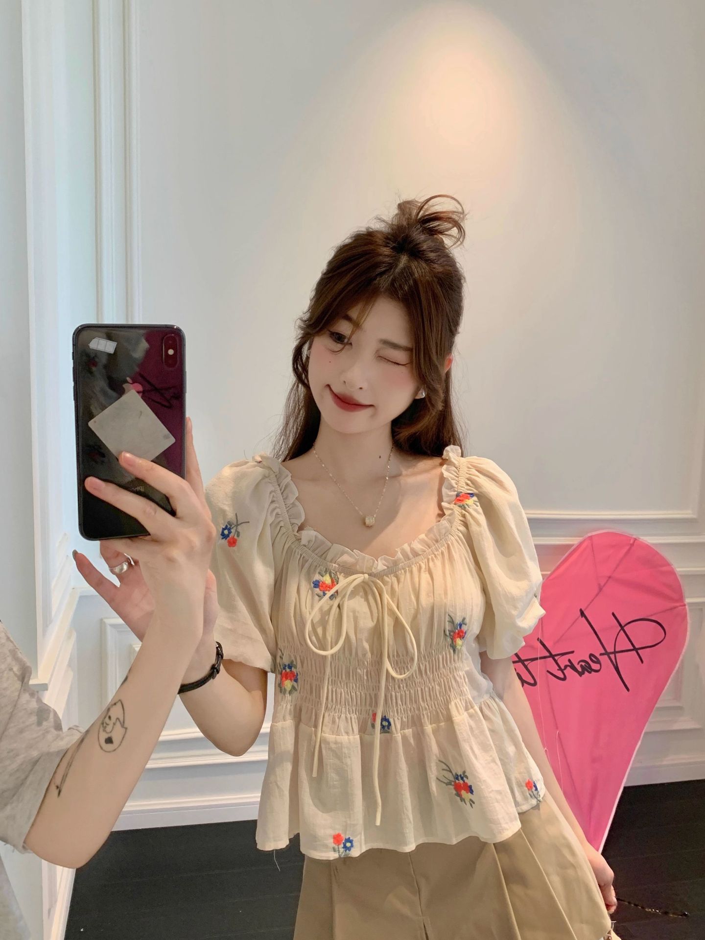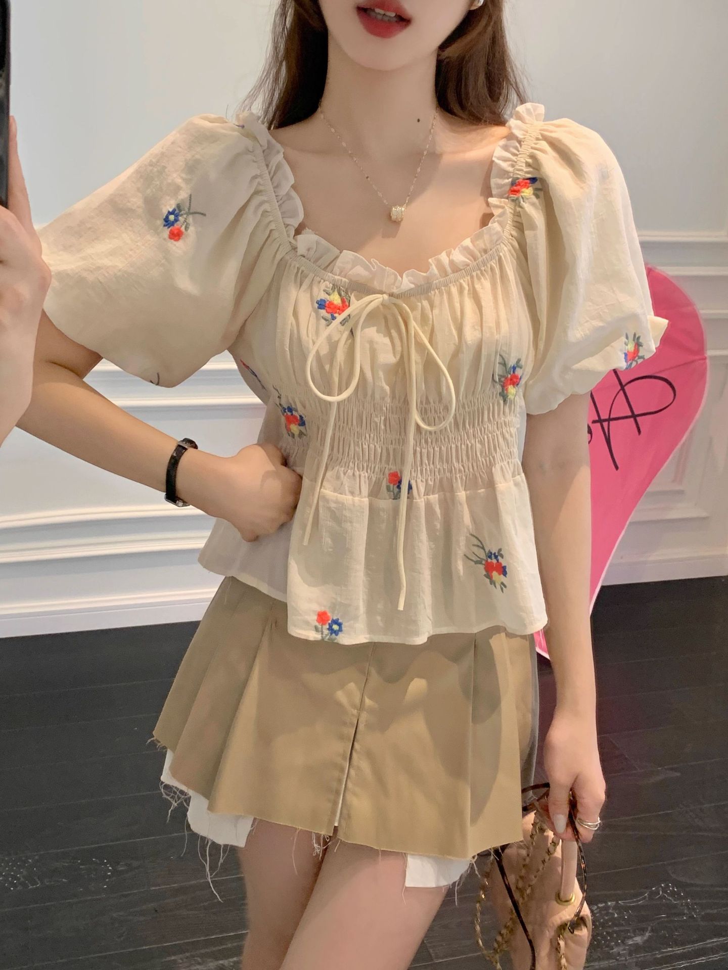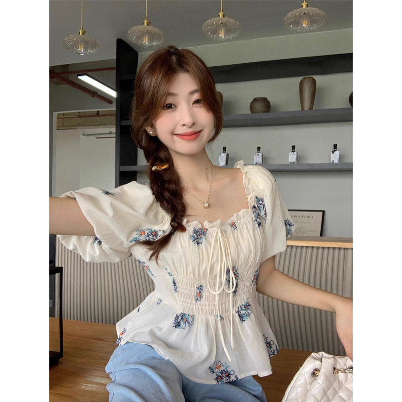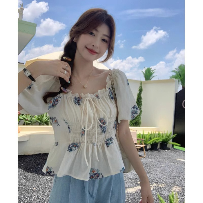 플러스 사이즈 꽃무늬 티셔츠 퍼프 슬리브 셔츠 여성 여름 새로운 디자인 틈새 달콤한 프렌치 반팔 탑 여성용스토어 가기