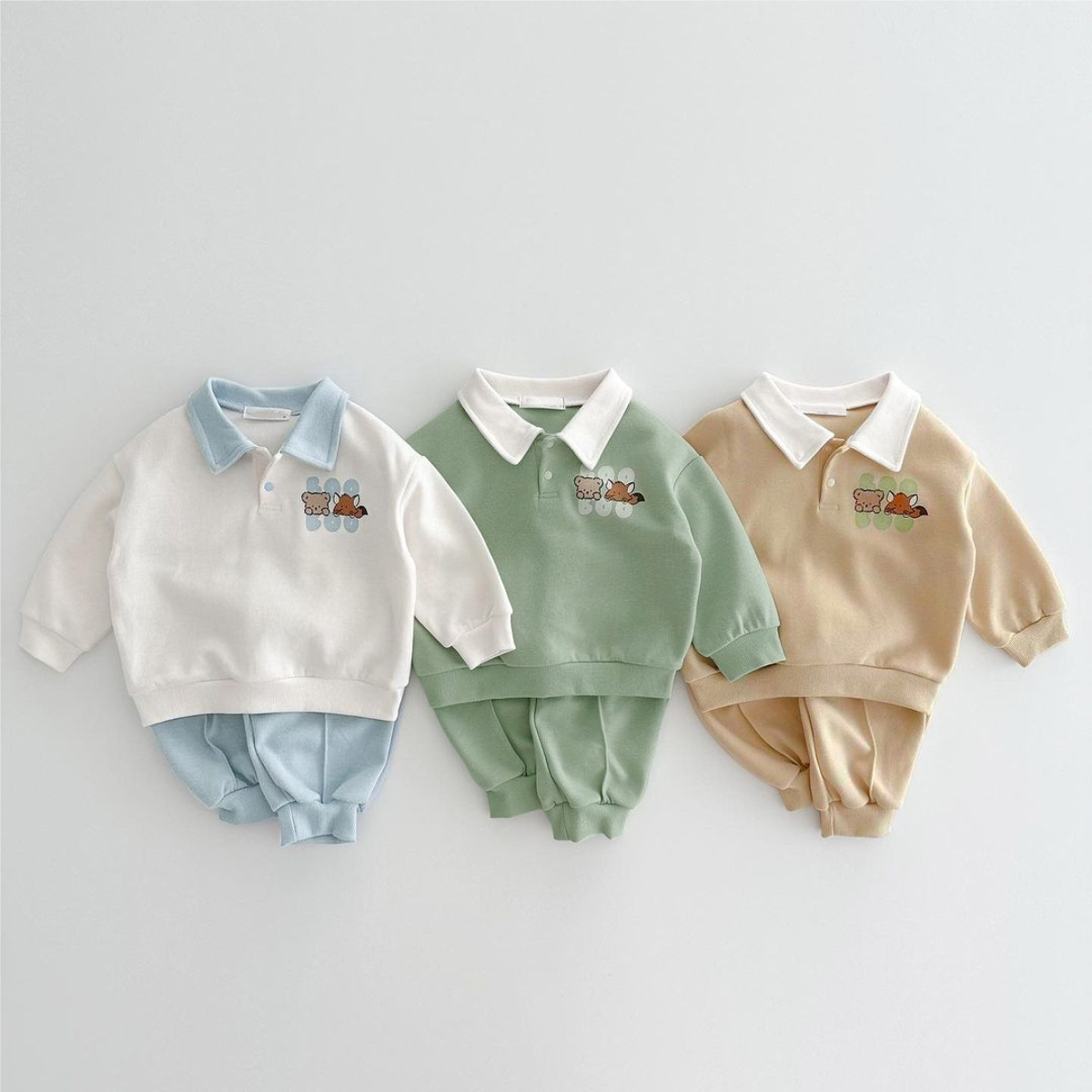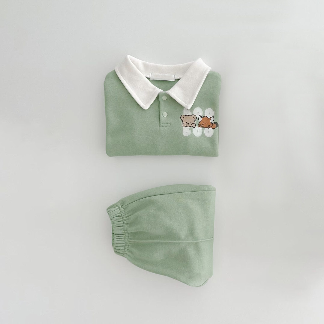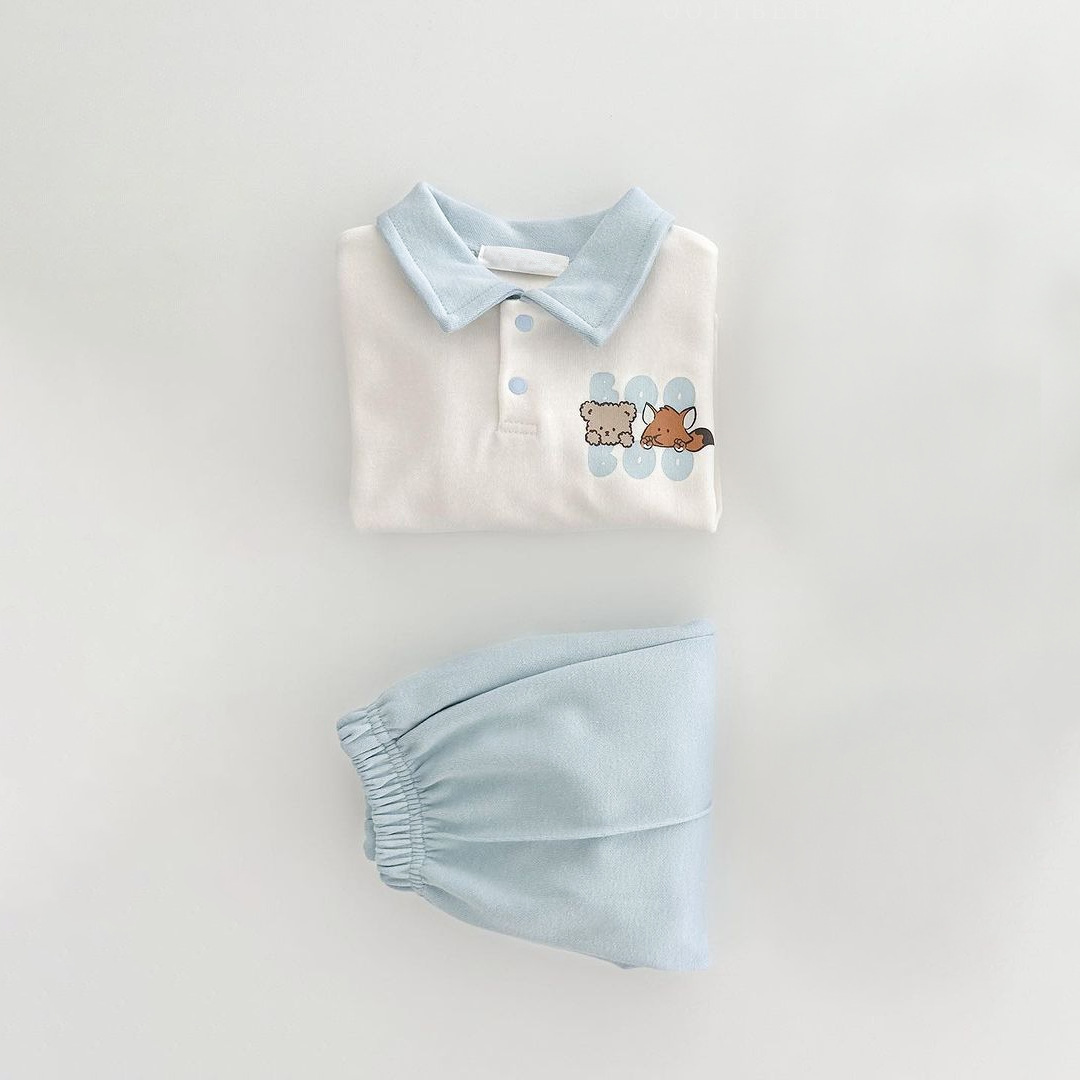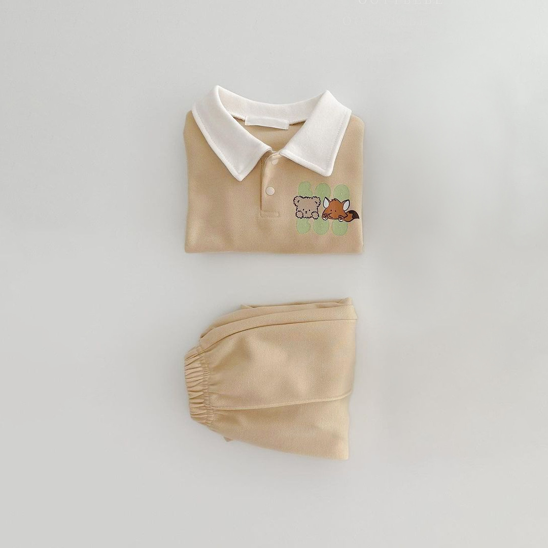 2025 한국 봄, 가을 만화 프린트 폴로 셔츠 칼라 탑 티셔츠 + 캐주얼 바지 정장 소년 소녀 정장 베이비 코튼스토어 가기