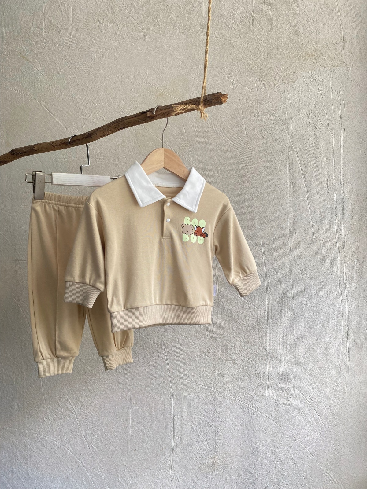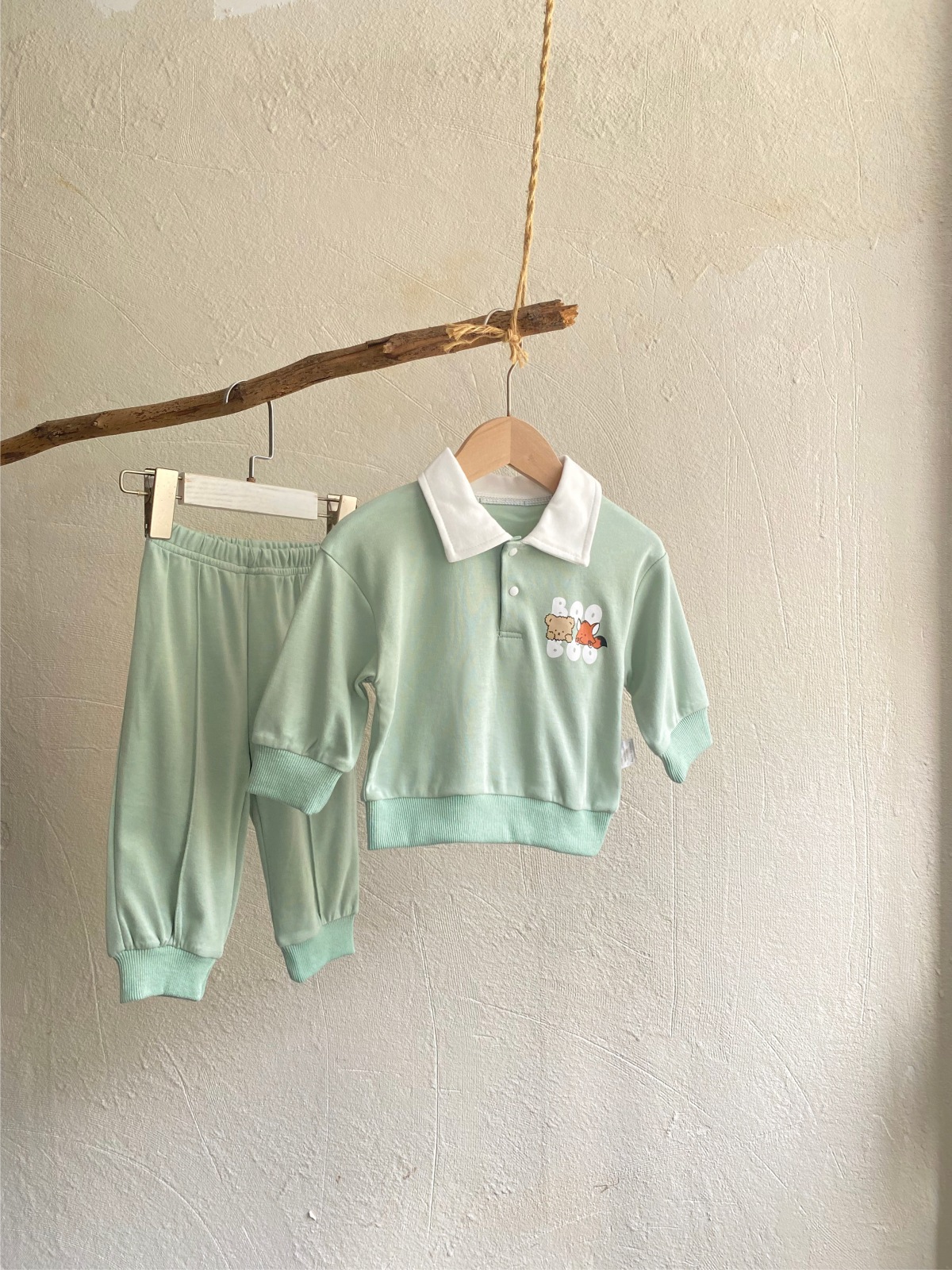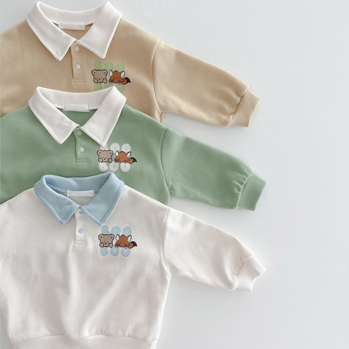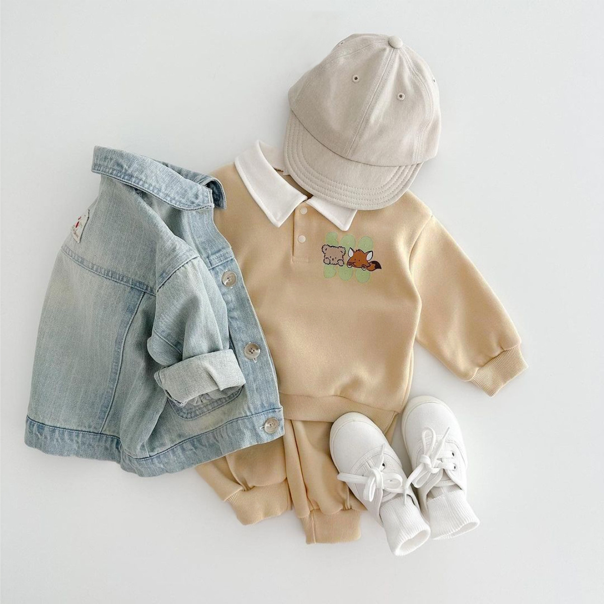 2025 한국 봄, 가을 만화 프린트 폴로 셔츠 칼라 탑 티셔츠 + 캐주얼 바지 정장 소년 소녀 정장 베이비 코튼스토어 가기