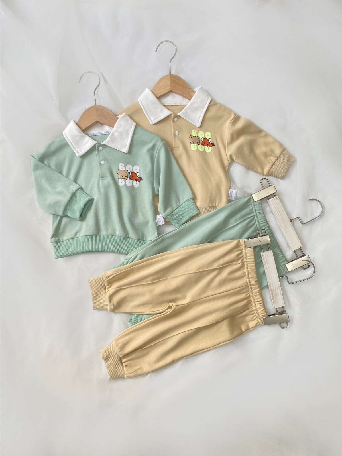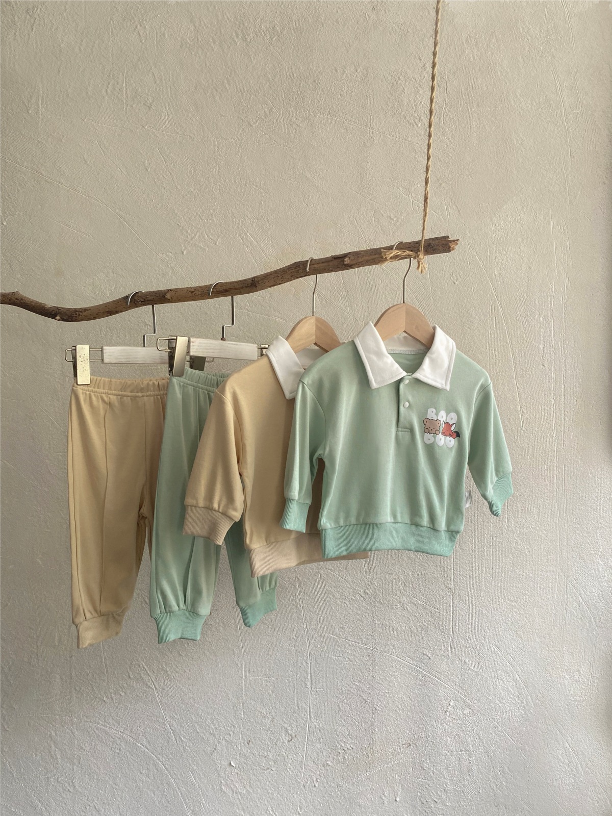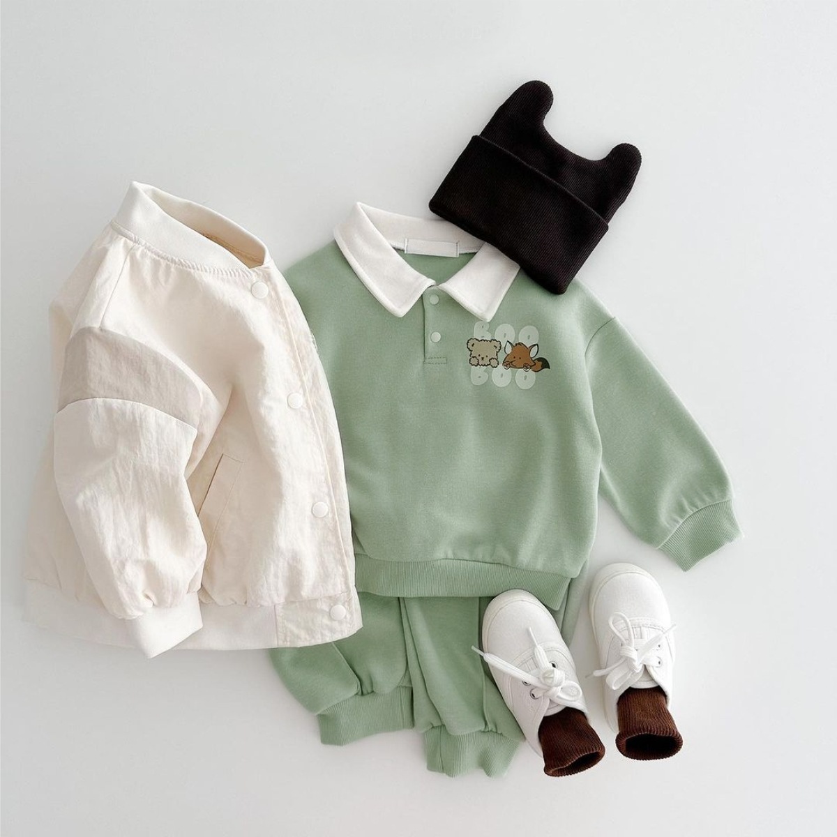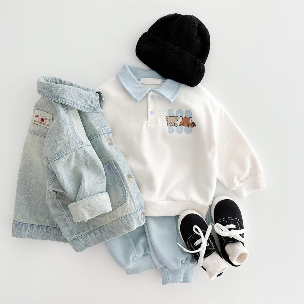 2025 한국 봄, 가을 만화 프린트 폴로 셔츠 칼라 탑 티셔츠 + 캐주얼 바지 정장 소년 소녀 정장 베이비 코튼스토어 가기