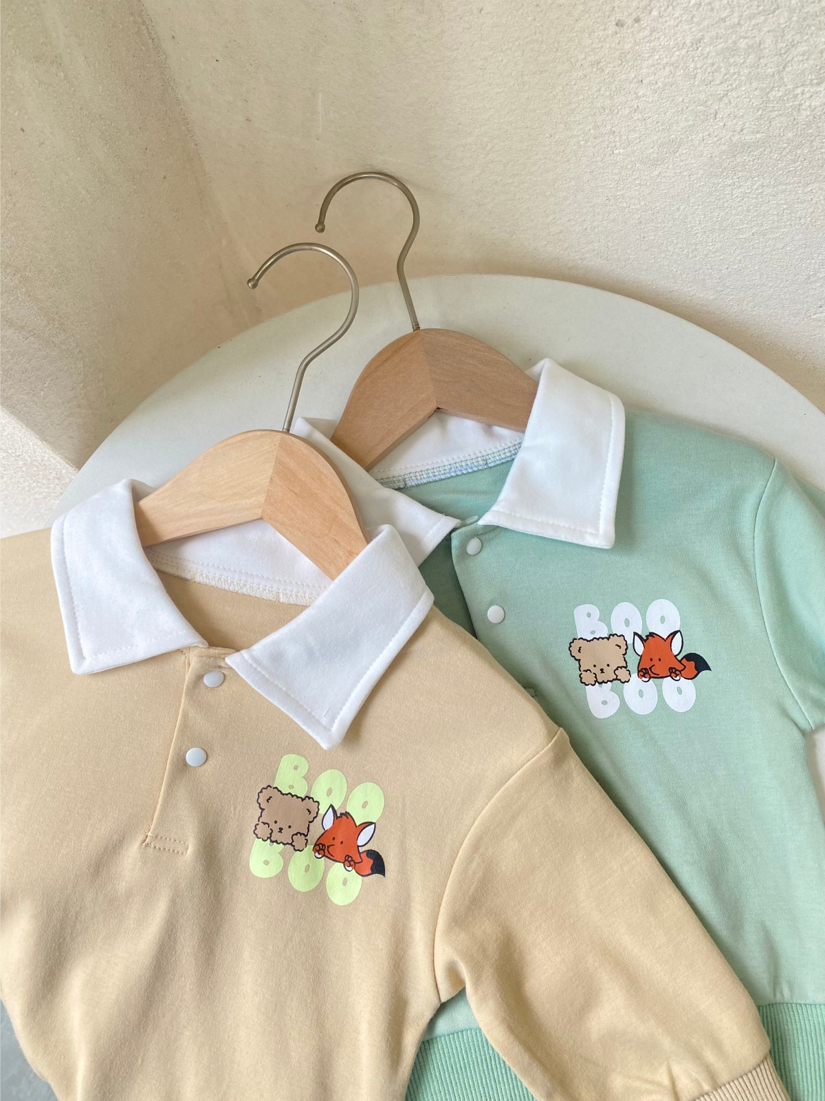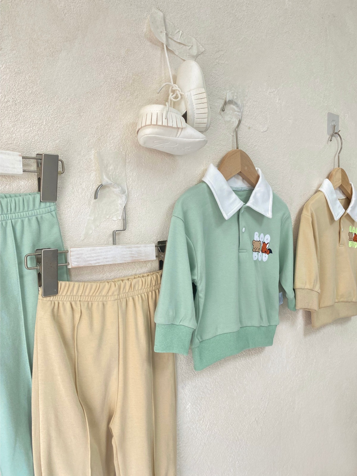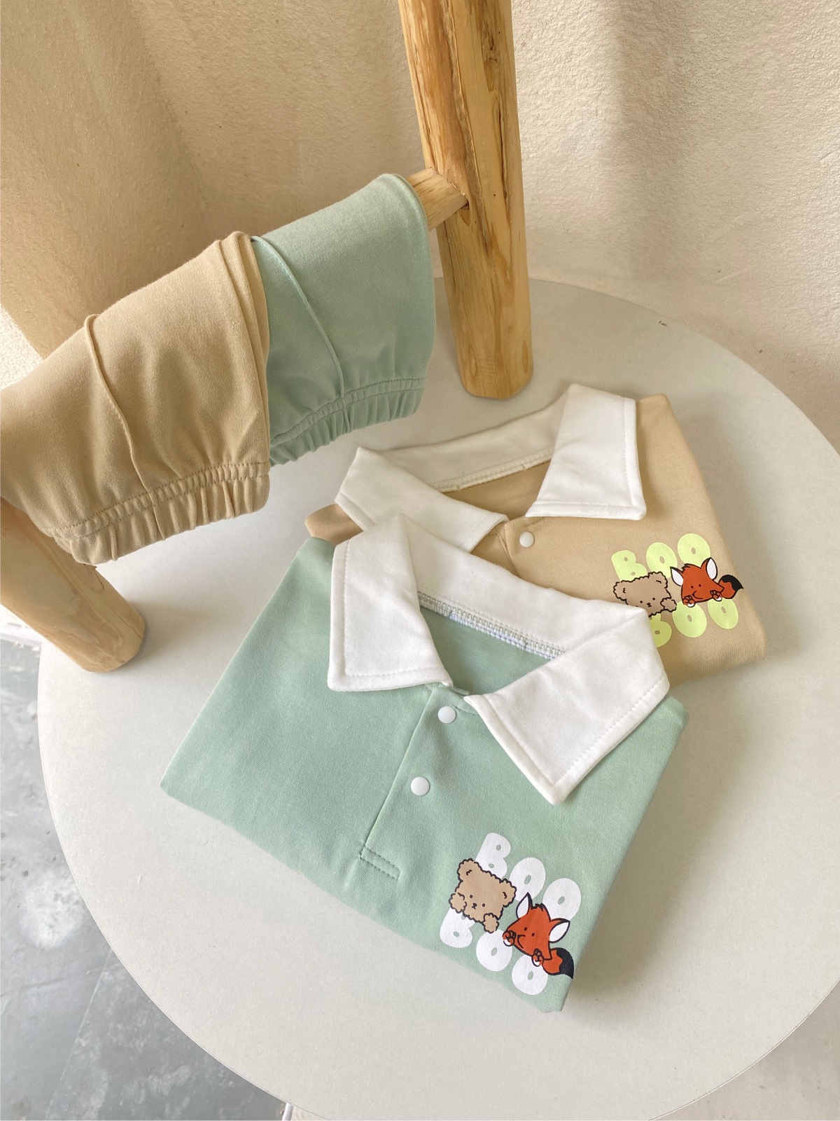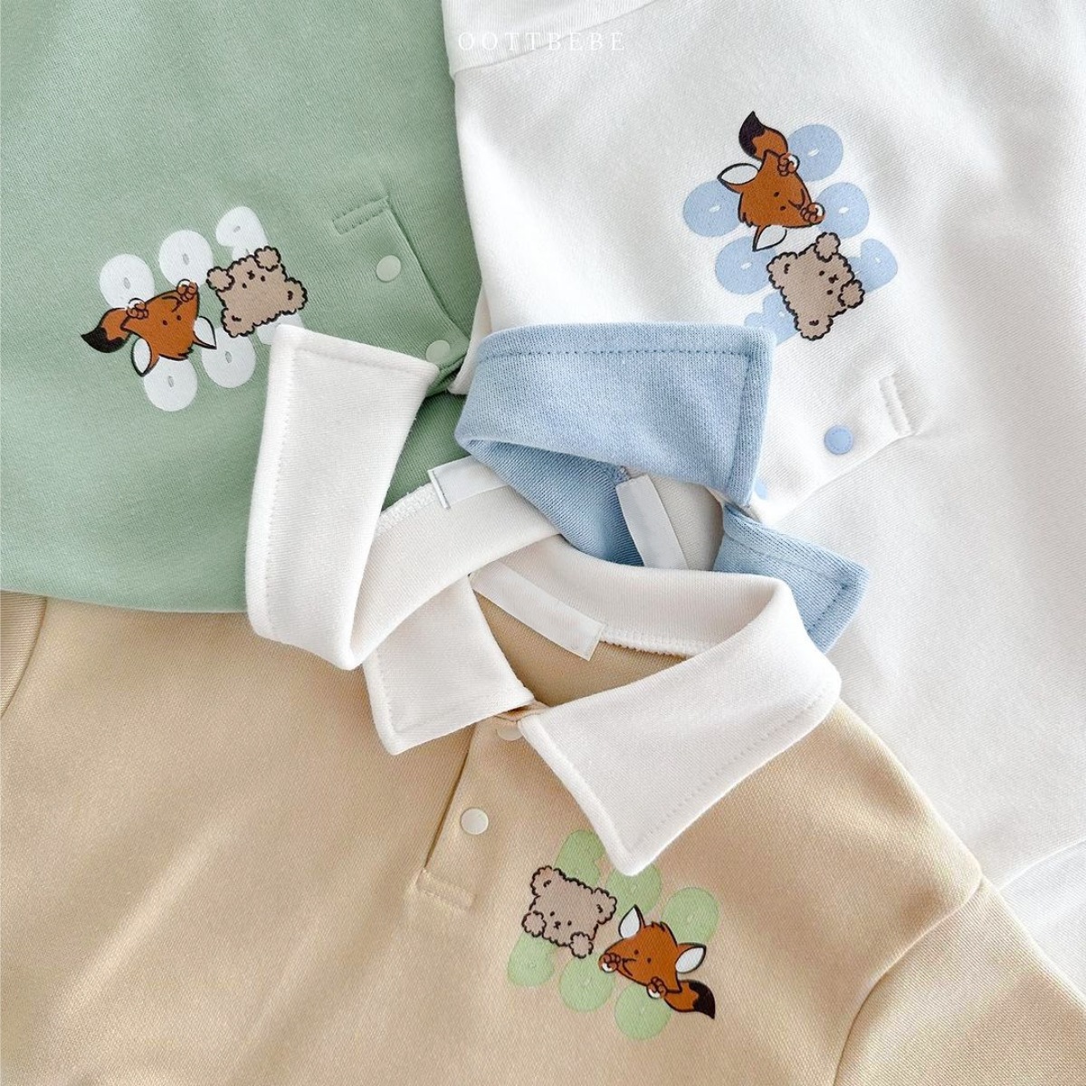2025 한국 봄, 가을 만화 프린트 폴로 셔츠 칼라 탑 티셔츠 + 캐주얼 바지 정장 소년 소녀 정장 베이비 코튼스토어 가기