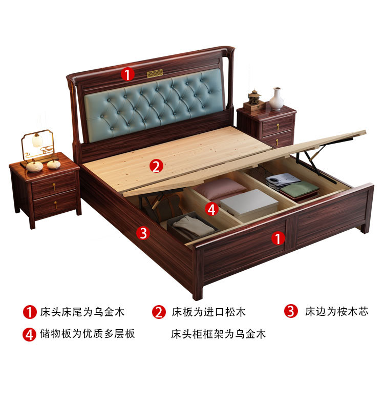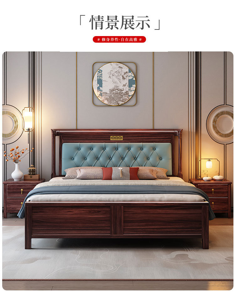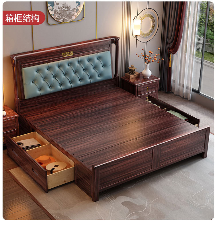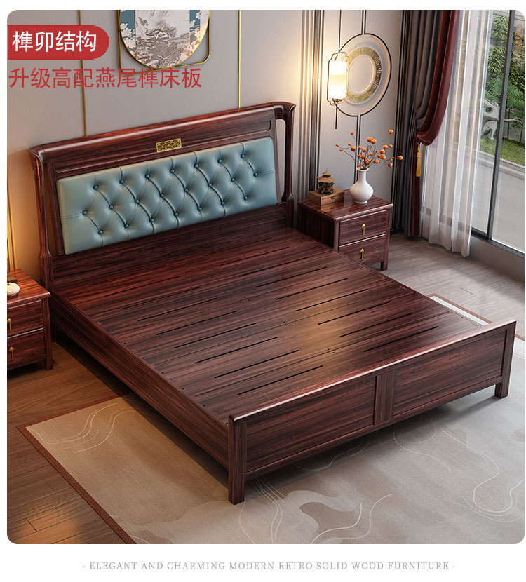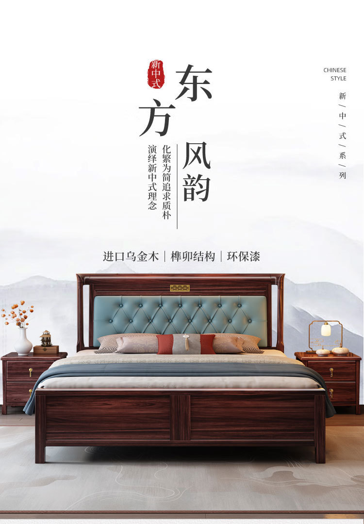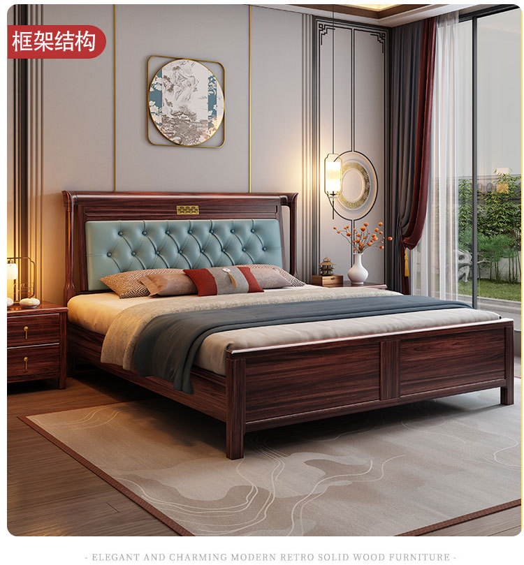 새로운 중국 스타일의 검은 금색 나무 원목 침대 현대적인 단순 1.8m 부드러운 더블 침대 마스터 침실 하이 엔드 분위기 침실 침대스토어 가기