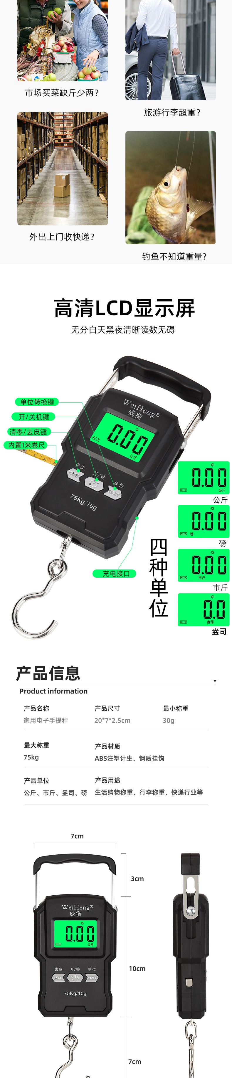 웨이헹 전자 휴대용 저울 도매 배송 75kg 택배 저울 눈금자 포함 채소 구매 및 노점용 휴대용 전자 저울스토어 가기