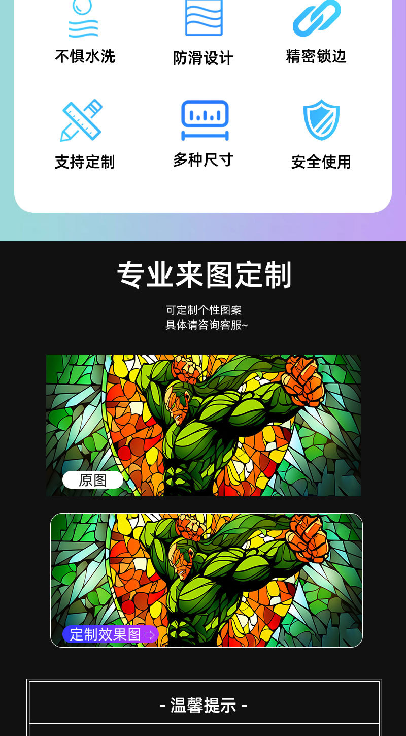 不能以电脑屏幕颜色来要求成品鼠标垫的颜色,印刷的色彩和显示色彩是两个完全不同的色彩概念范畴。所以印刷出来的产品与电脑显示的色彩会有所不同;鼠标垫就是鼠标垫,并不是艺术品。