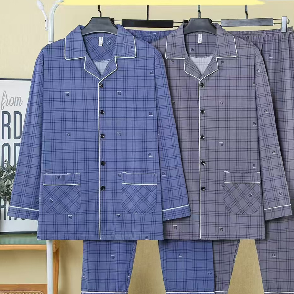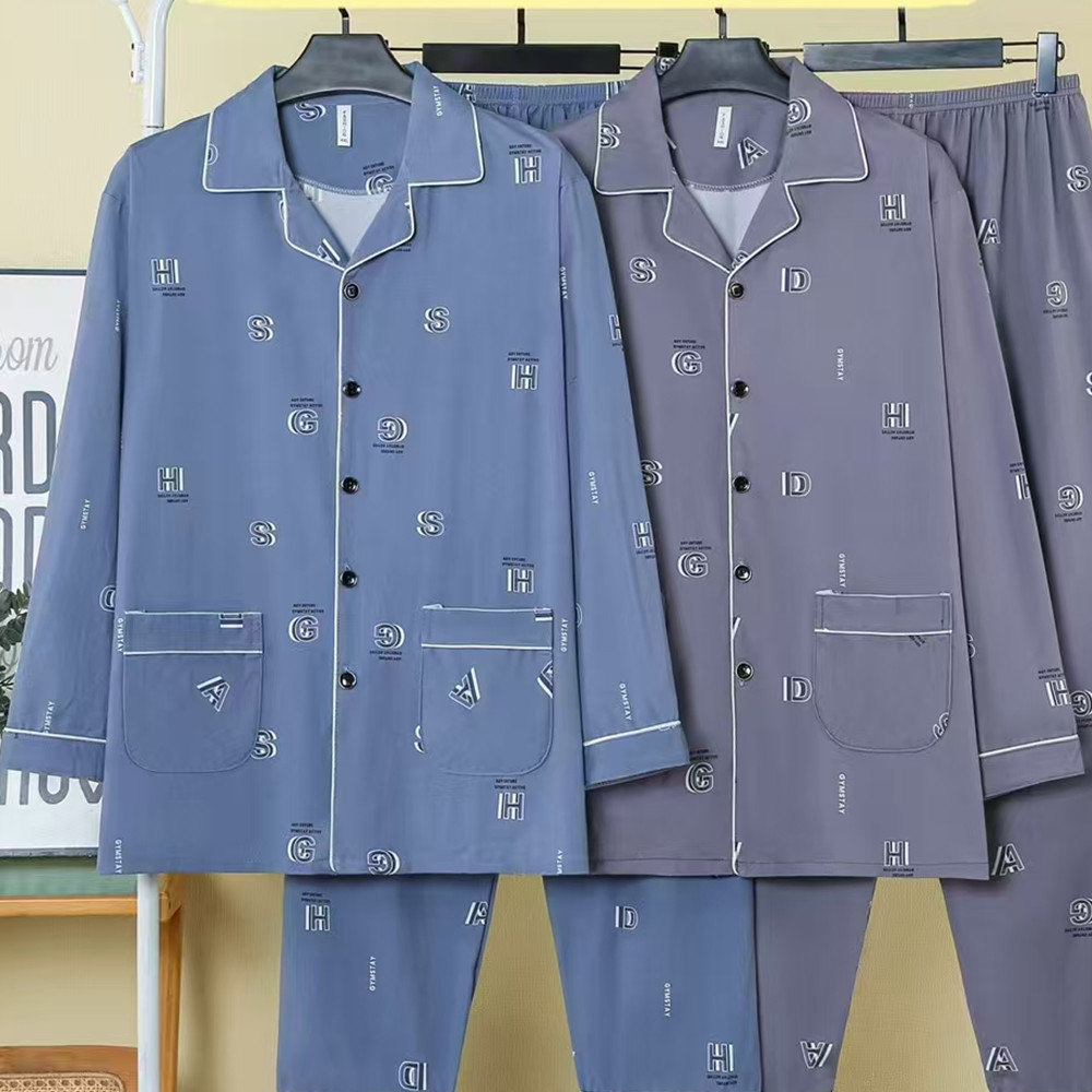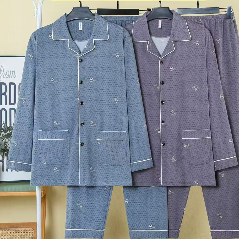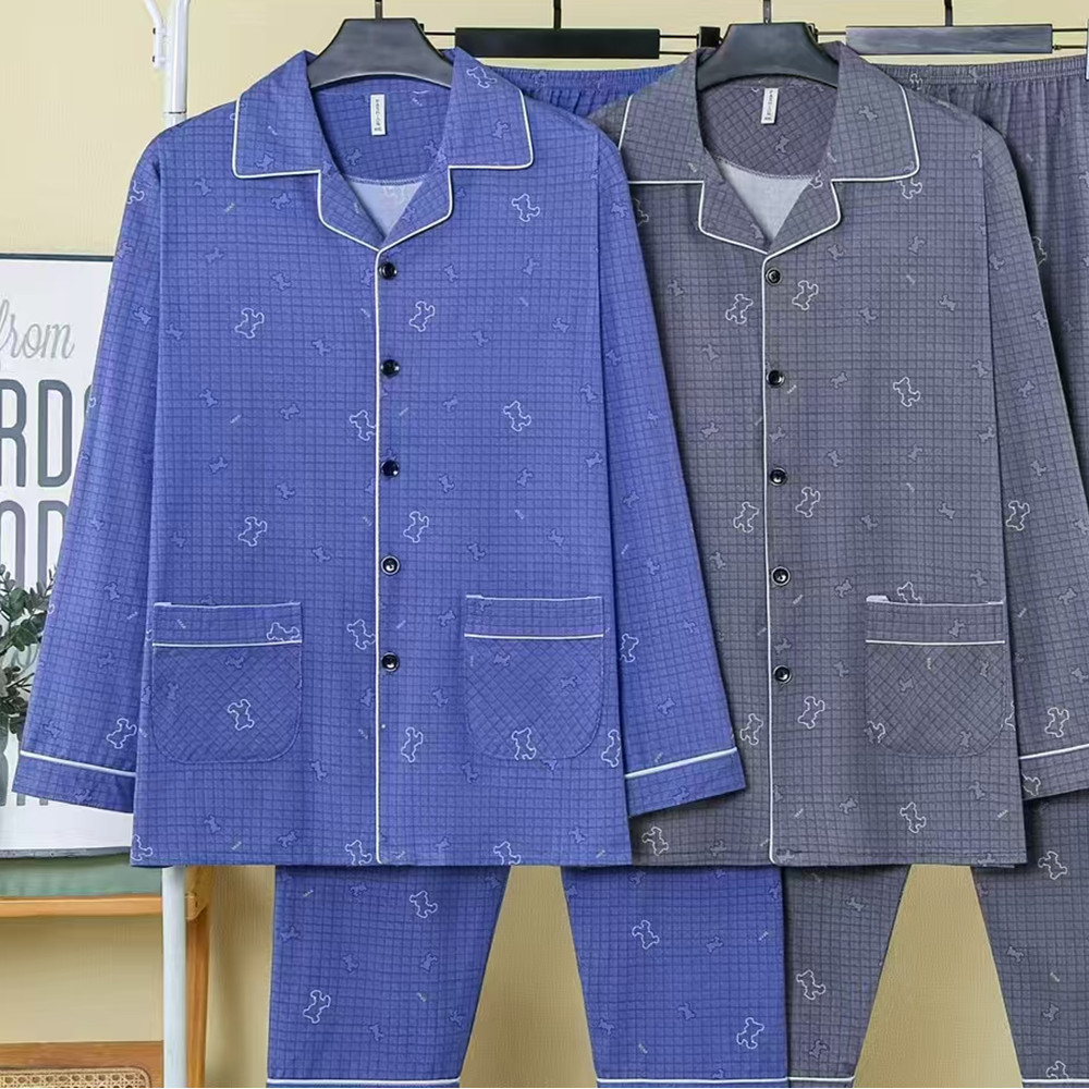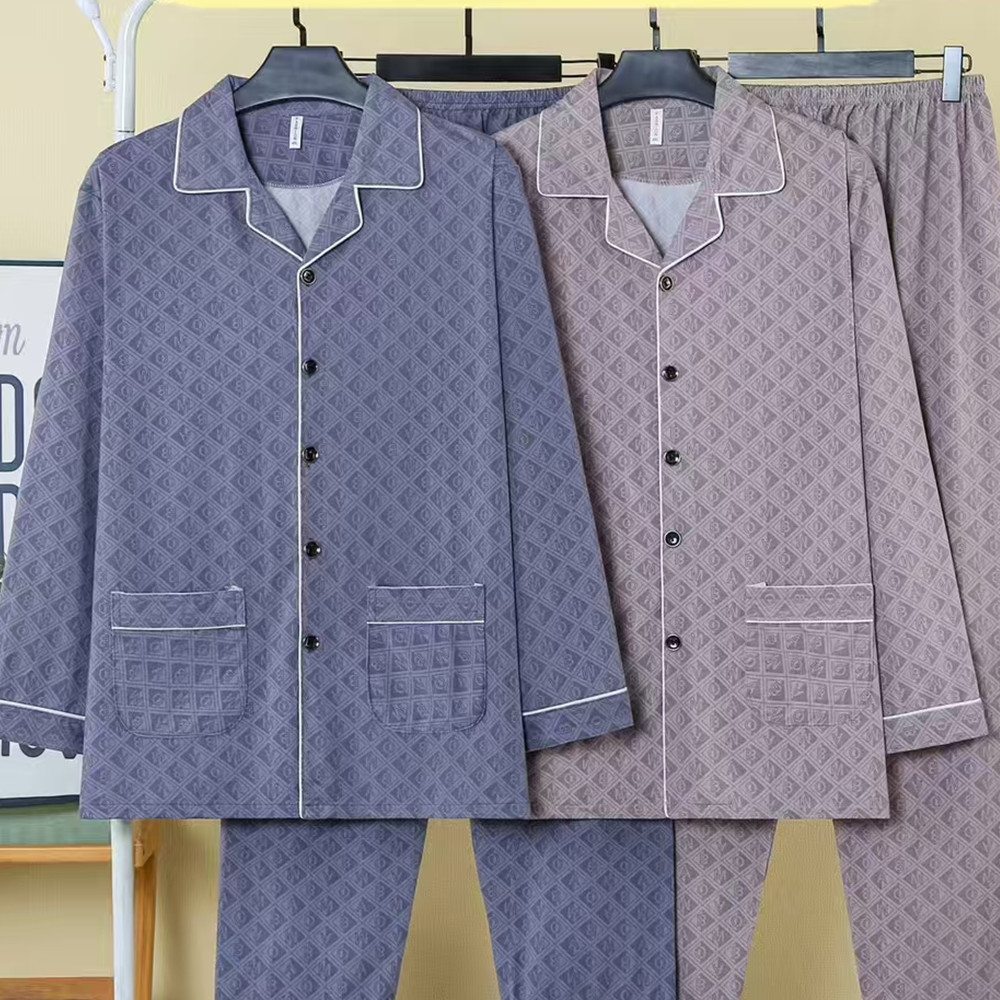 봄, 가을 남성 잠옷 모조 면화 긴팔 바지 정장 카디건 라펠 중년 및 노인 남성 대형 가정복스토어 가기