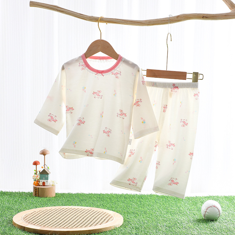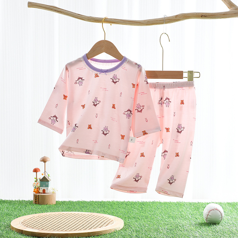 아기 잠옷 여름 얇은 7부 소매 에어컨 의류 중소형 어린이 텐셀 시원한 느낌 소년 소녀 가정복 세트