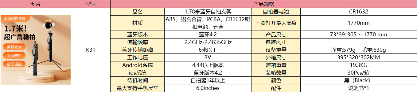 • K31 블랙 (170cm+블루투스 리모컨+알루미늄 합금 튜브)