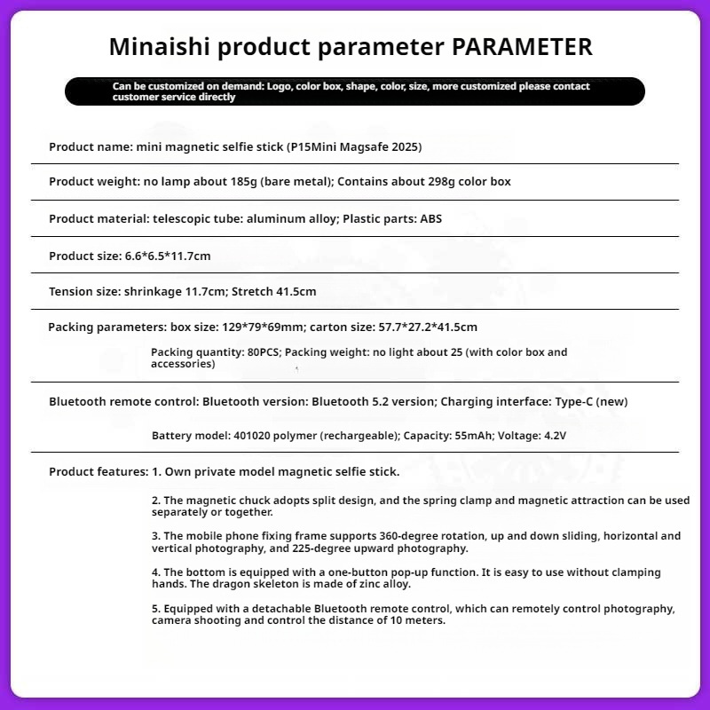 2025 신제품 셀카봉 P15mini 자기 셀카봉 개폐식 미니 여행 휴대용 셀카봉