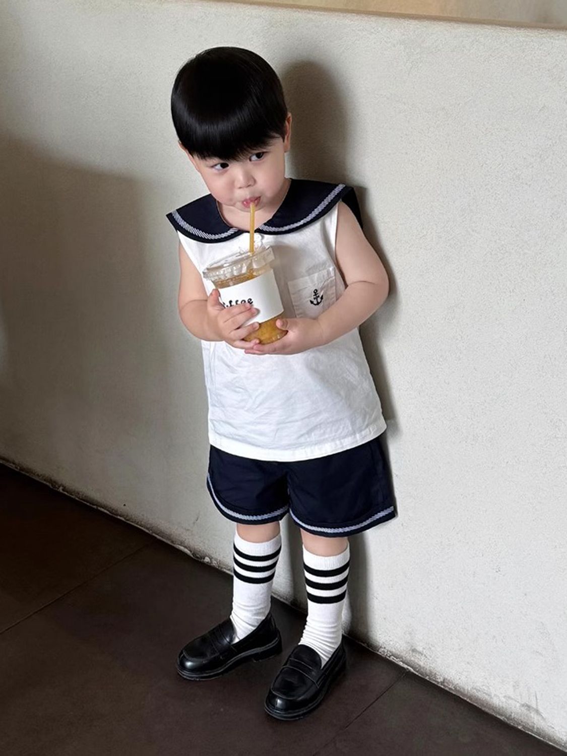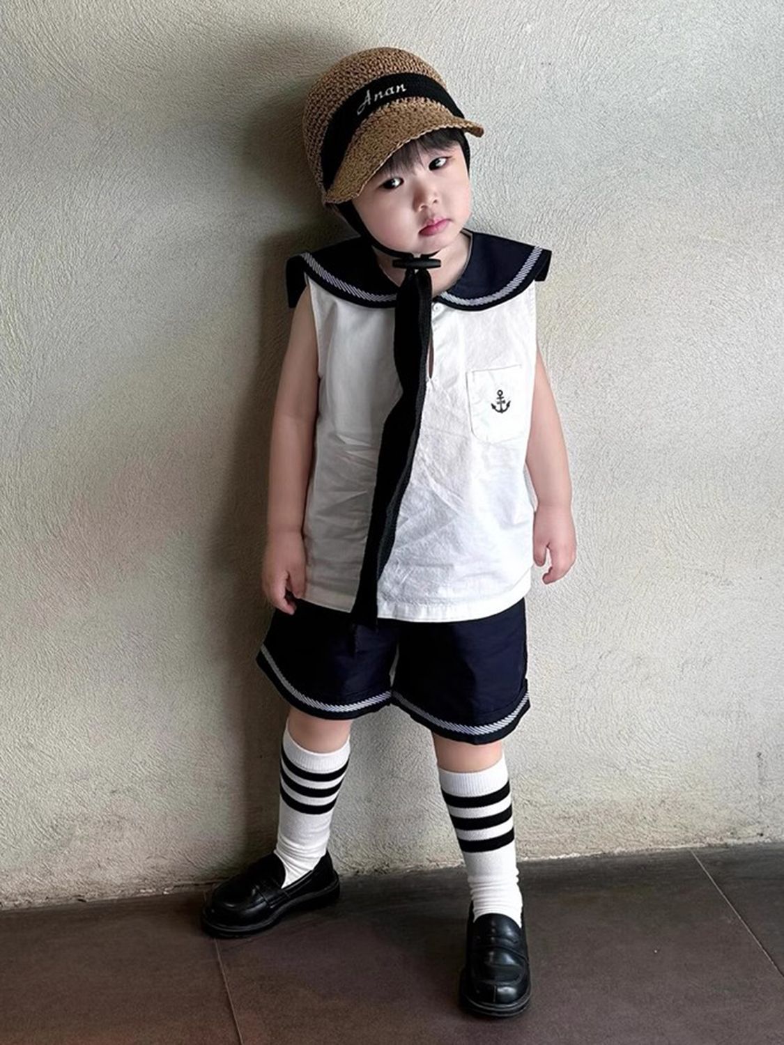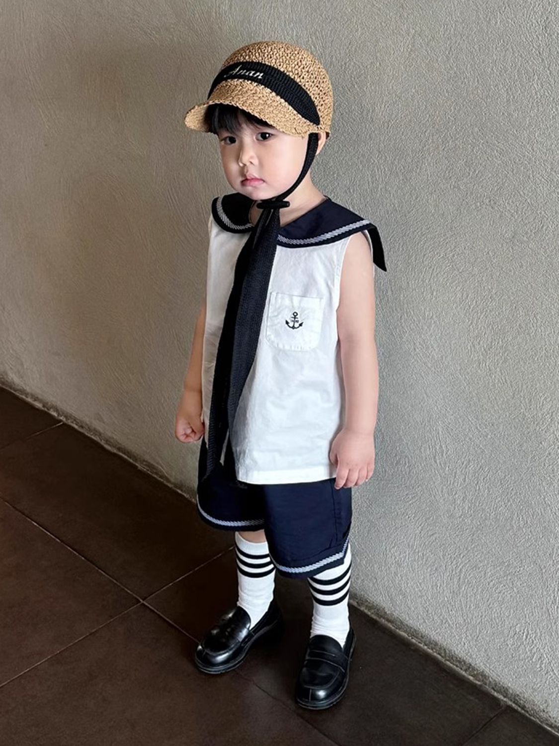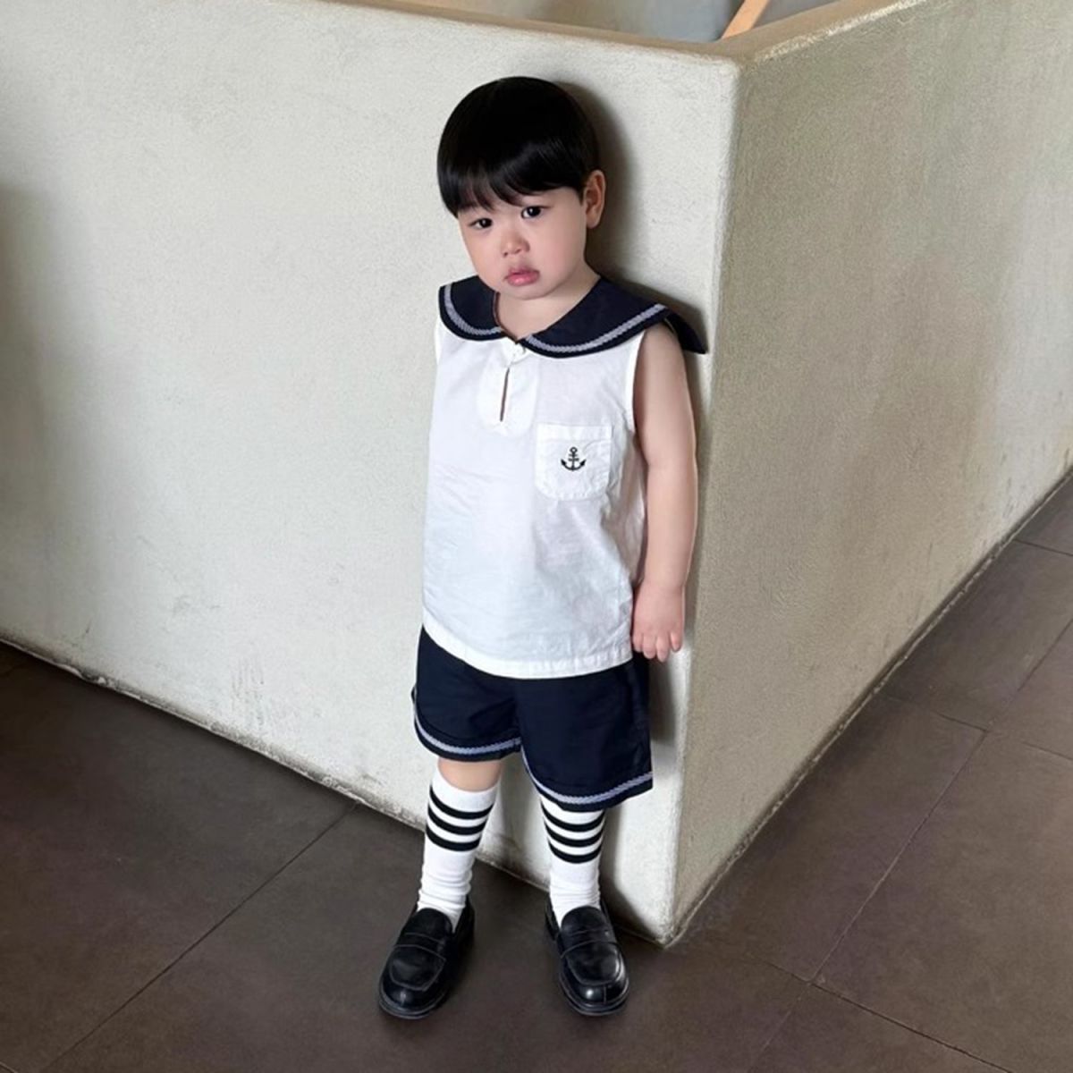 소년 여름 정장 2025 새로운 소년 한국 대학 스타일 해군 옷깃 컬러 블록 조끼 어린이 캐주얼 반바지스토어 가기