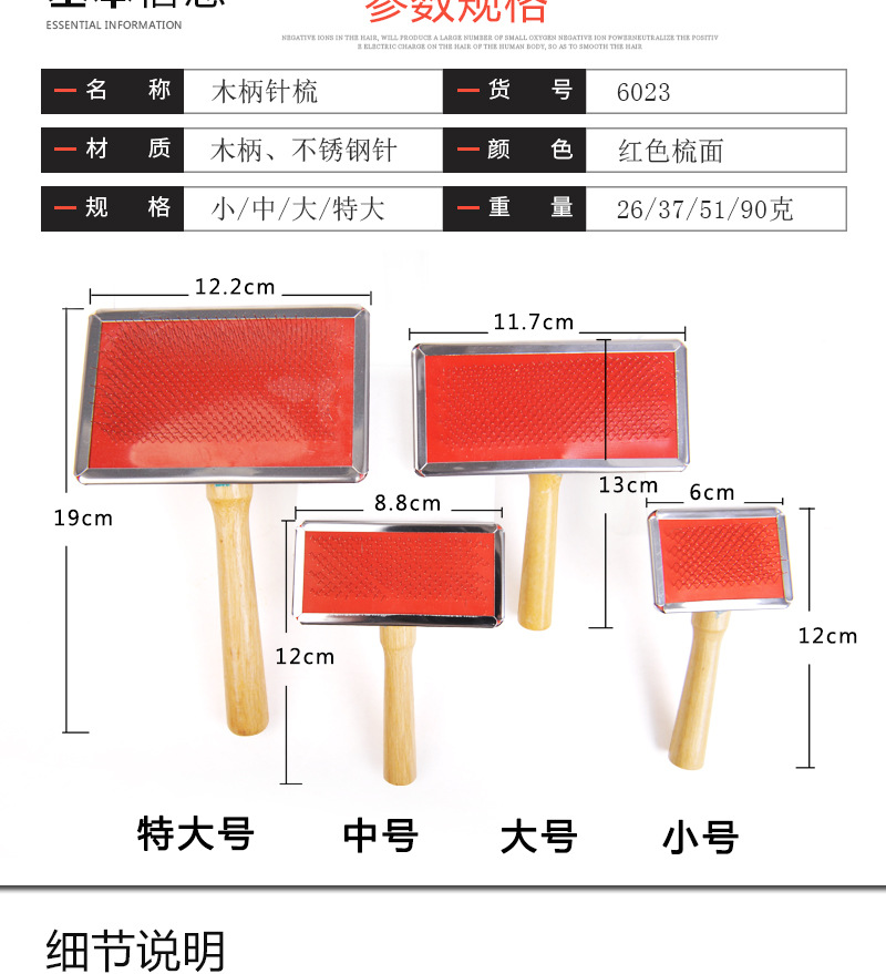 特大号:总长19cm,宽12.2cm, 梳面12.2*7.9cm,针长约1cm