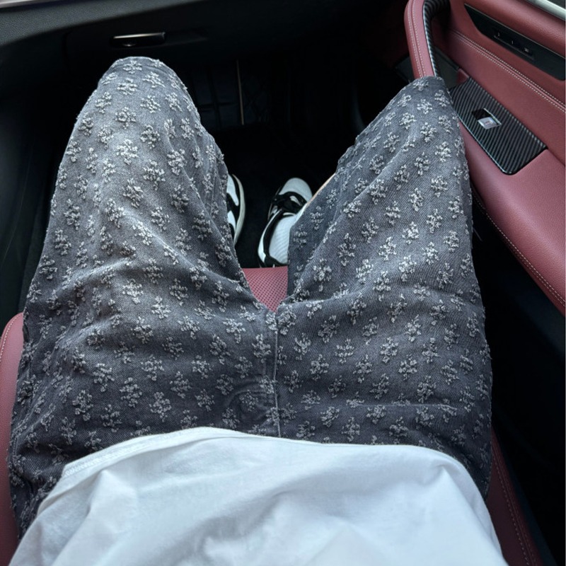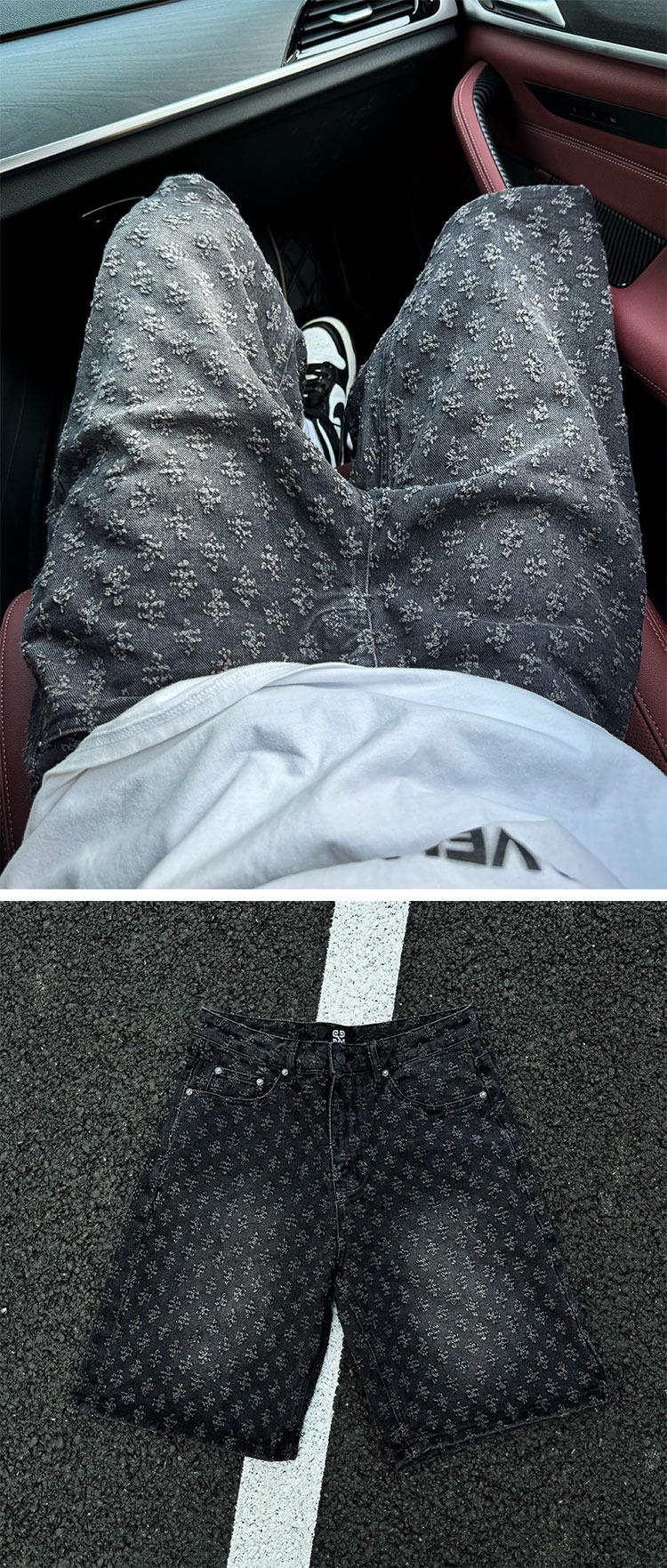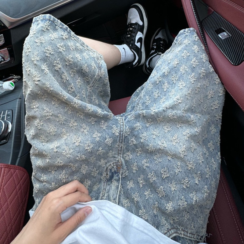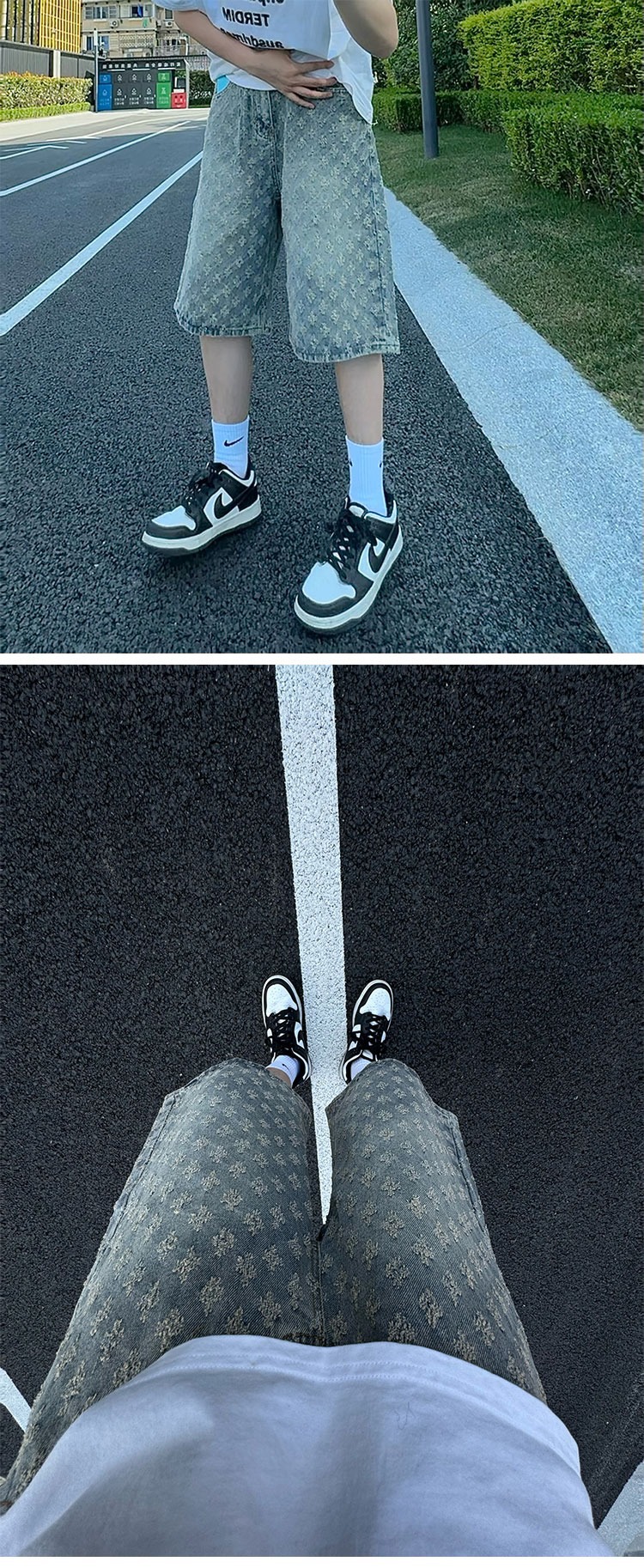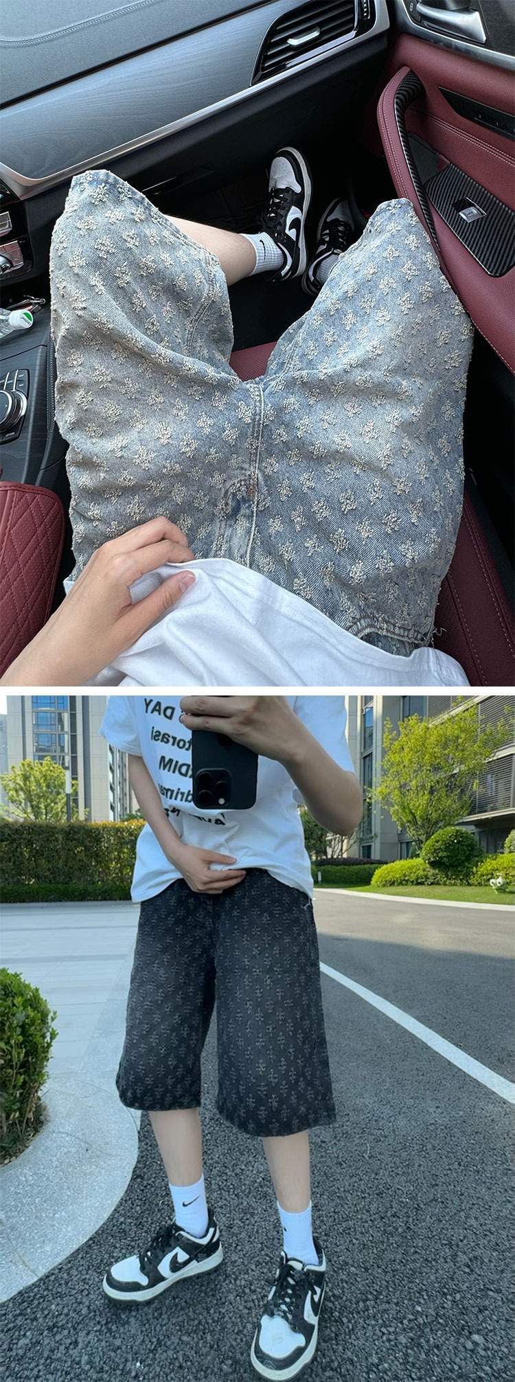 풀 프린트 자카드 아메리칸 레트로 데님 반바지 남성 여름 얇은 힙합 바지 트렌디 브랜드 디자인 5부 바지스토어 가기