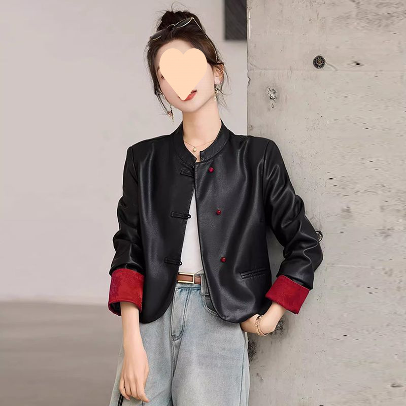 여성을위한 새로운 중국 스타일 가죽 자켓 2025 봄과 가을 새로운 짧은 중국 스타일 디자인 기질 슬림 피트 가죽 자켓