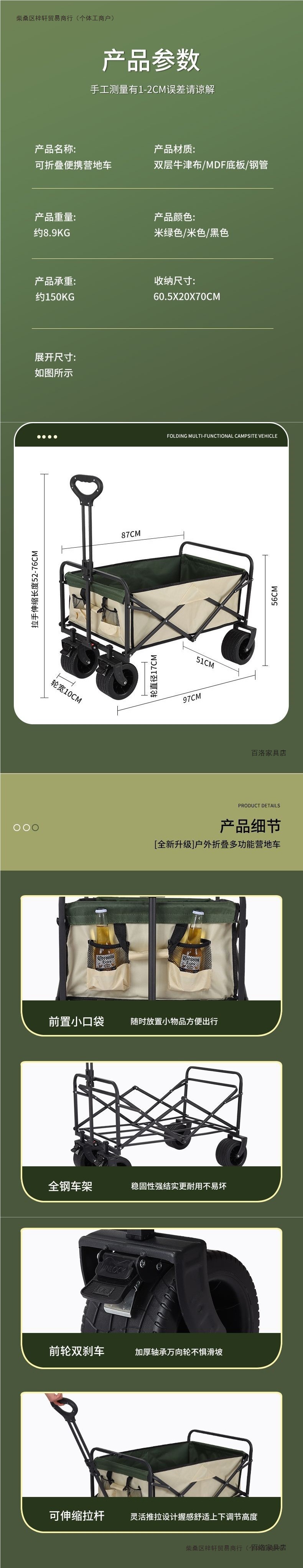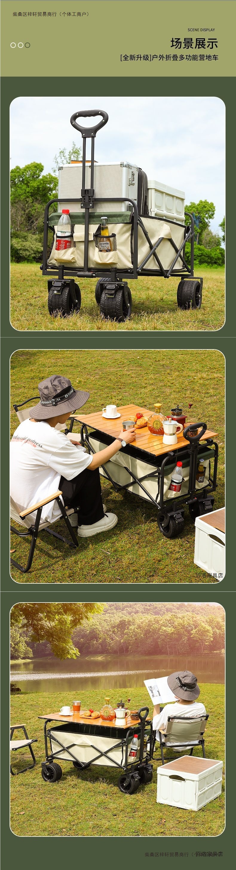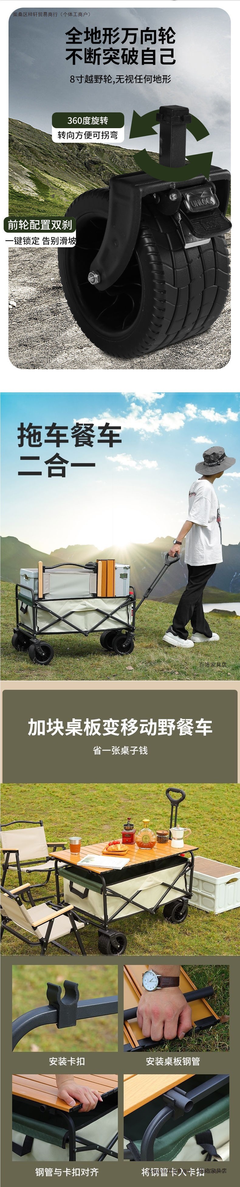 • 캠프카 + 접이식 테이블 - 브레이크가 장착된 대형 오프로드 휠(카키색)