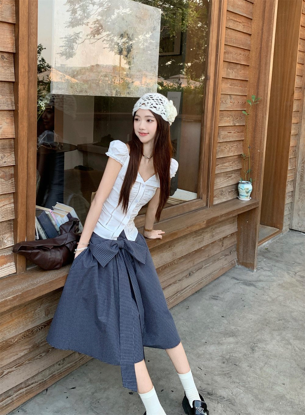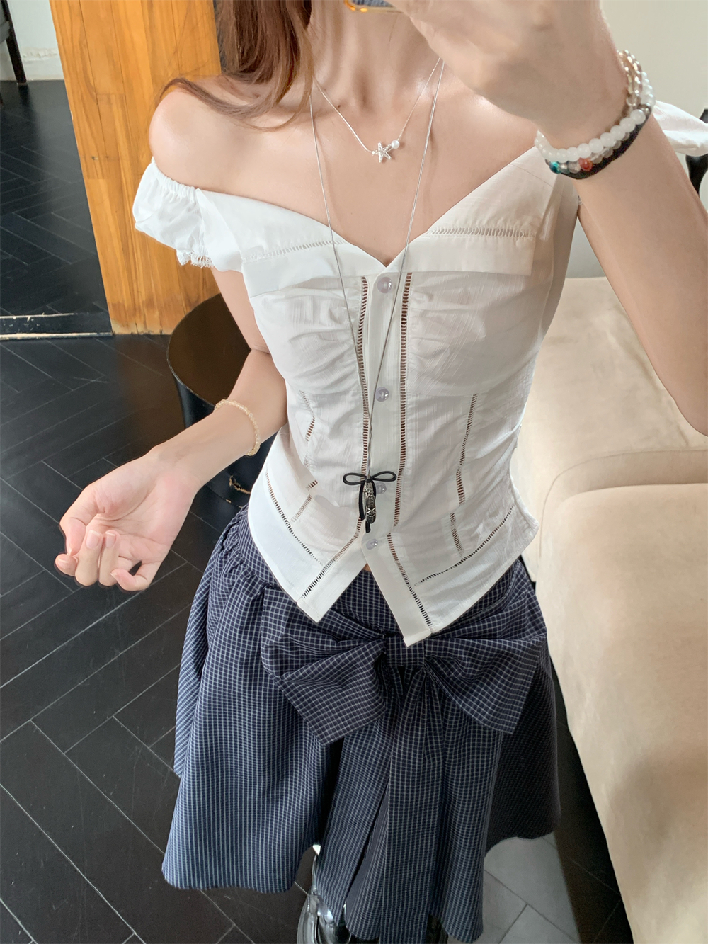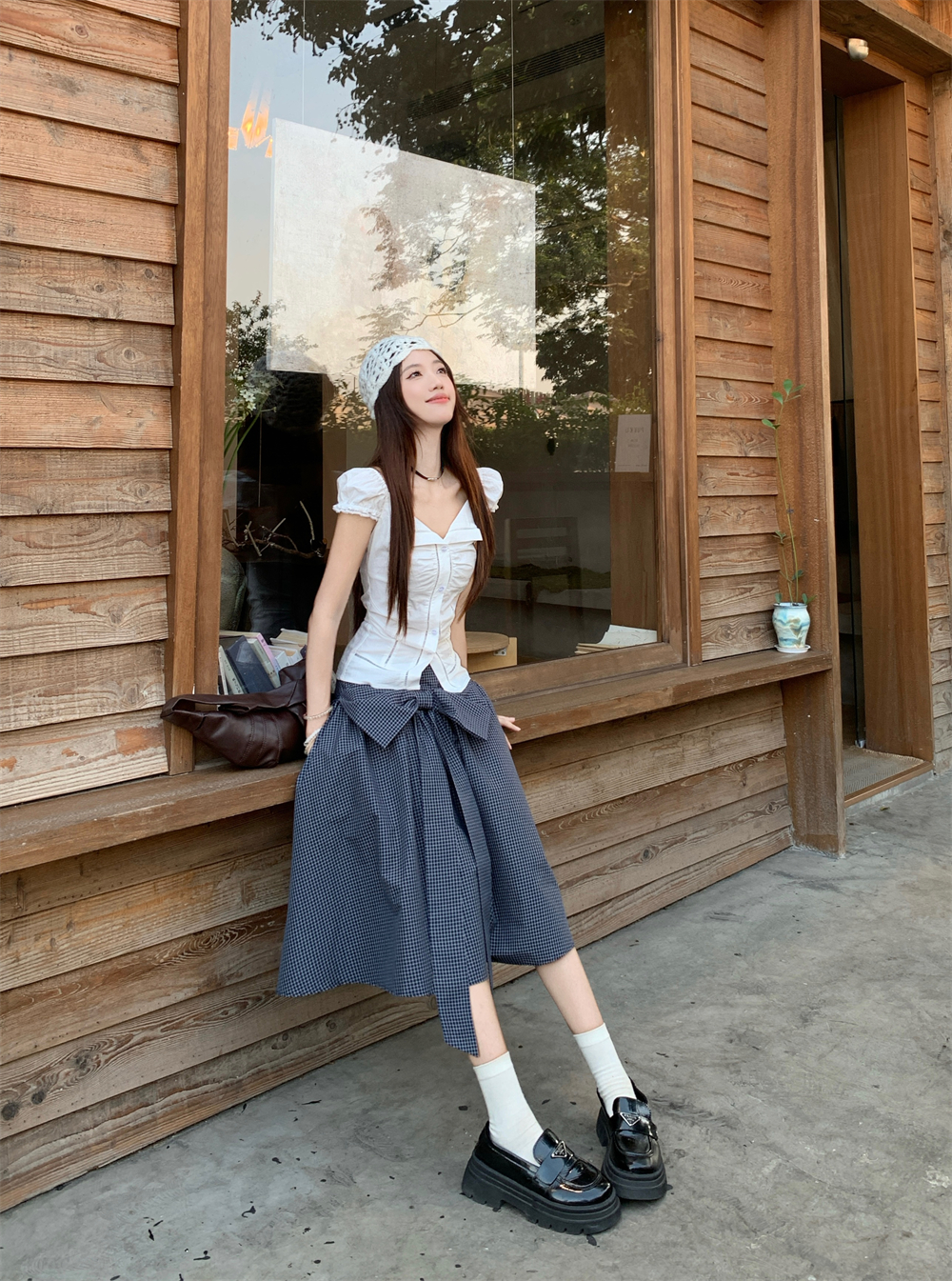 디자인 라펠 퍼프 슬리브 화이트 셔츠 여성 여름 보우 체크 무늬 스커트 A 라인 스커트 투피스 세트스토어 가기