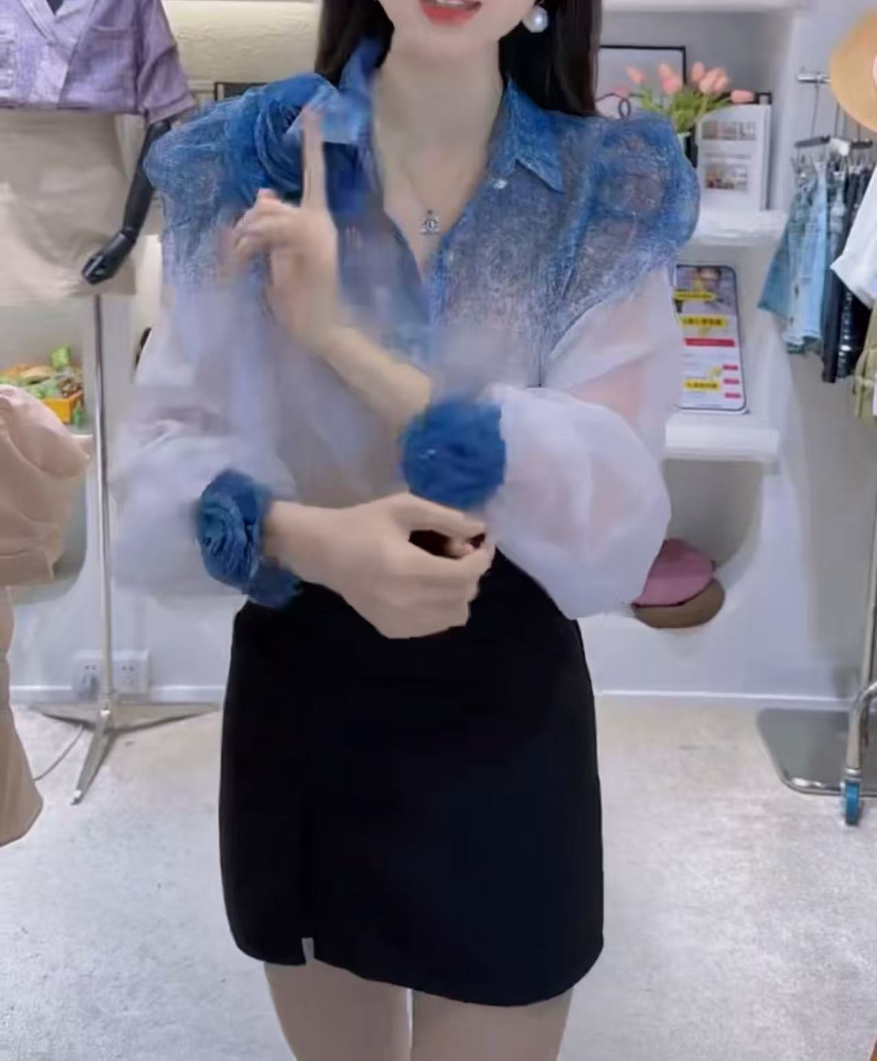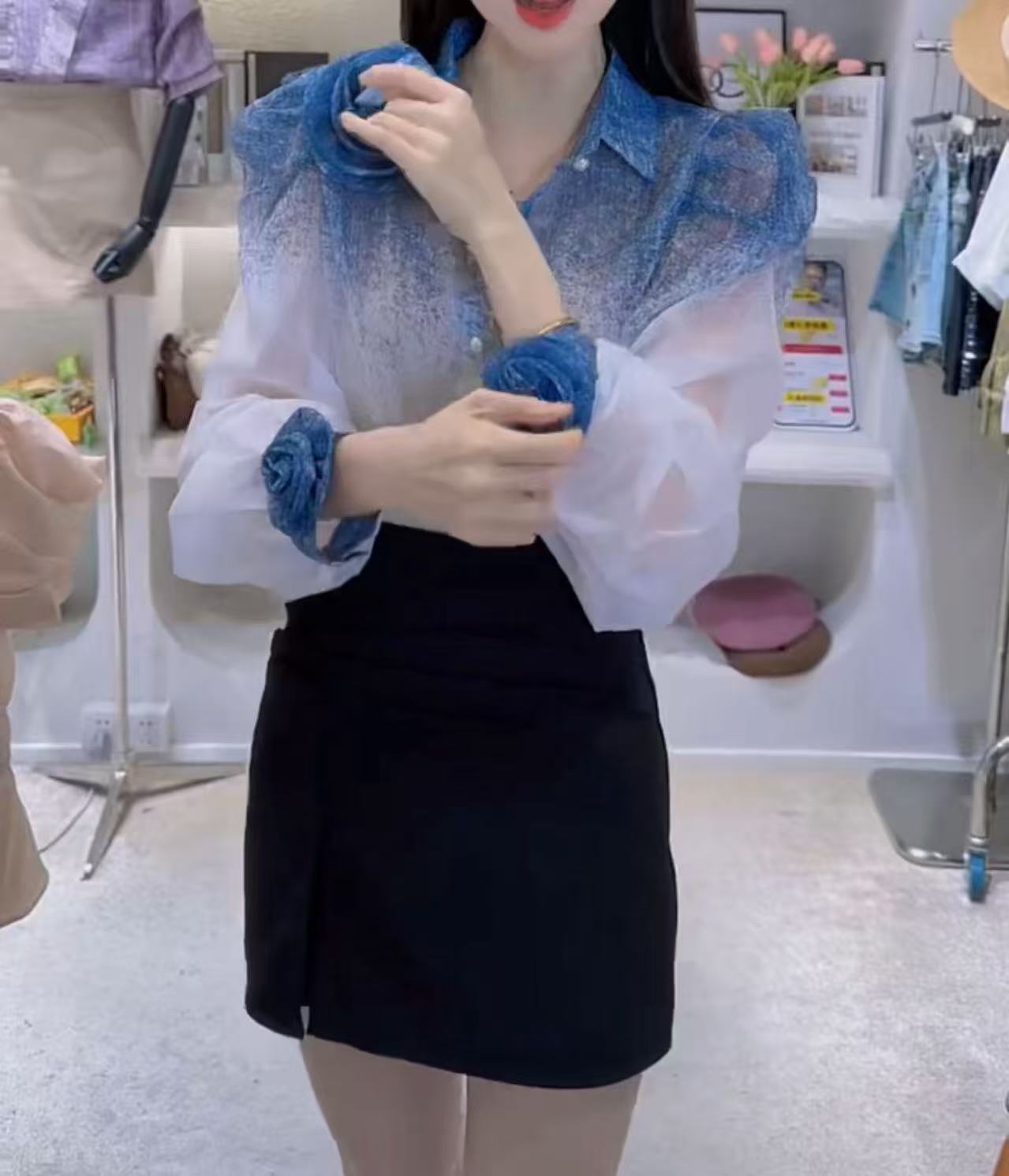 25785 Xin Da Aimei Yuan 2025 여름 새로운 스타일 입체 꽃 얇은 셔츠 + 여성용 힙 스커트스토어 가기