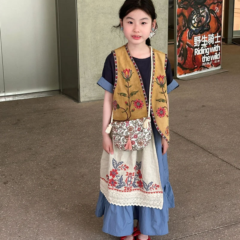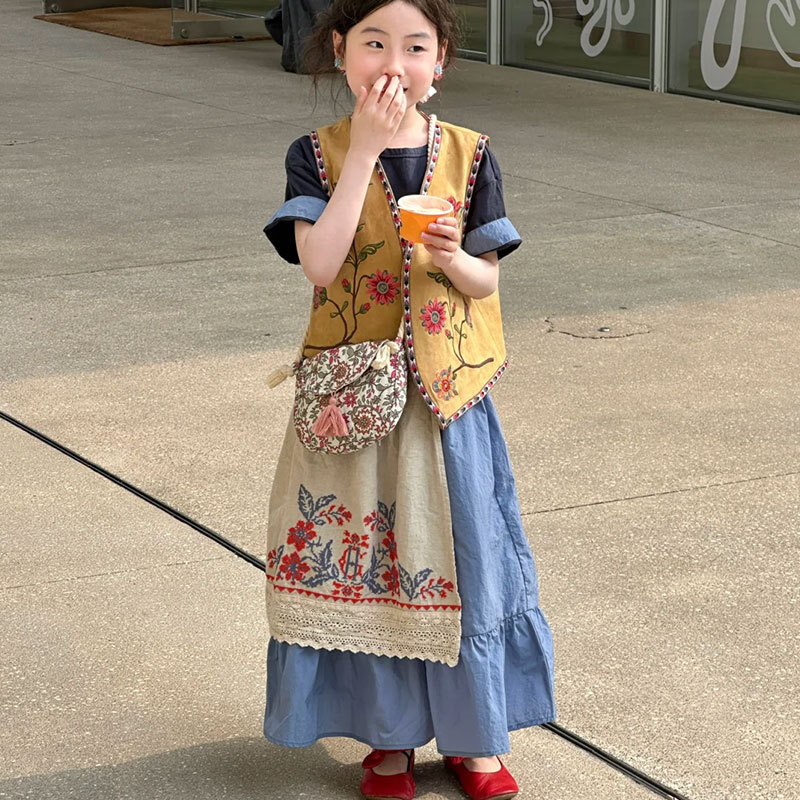 여아 조끼 아동 여름 정장 2025 새로운 큰 아동상의 복고풍 스타일 여아 드레스 반팔 얇은 스타일