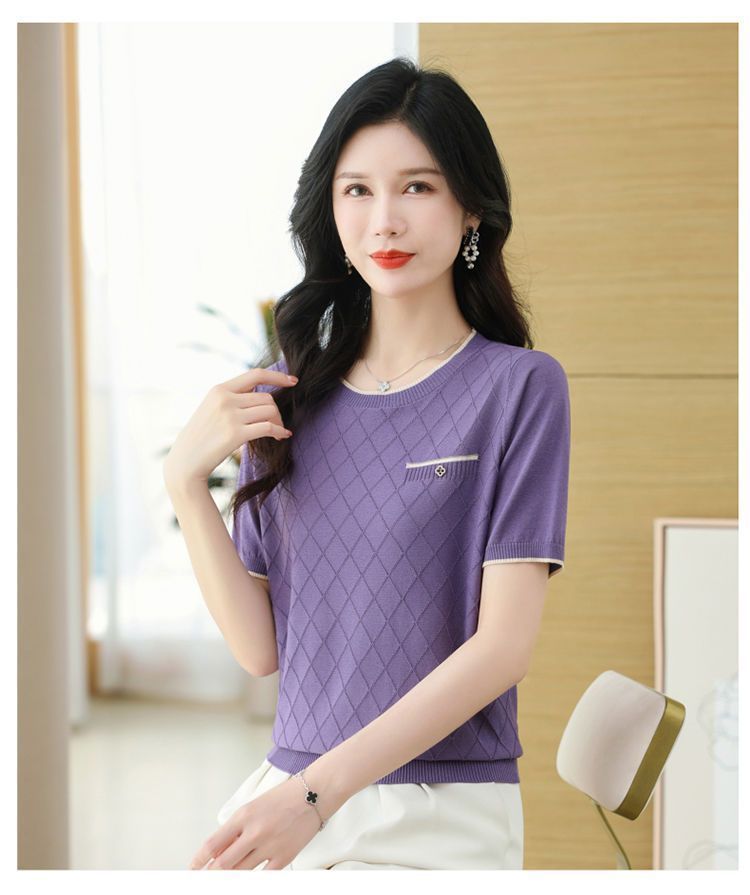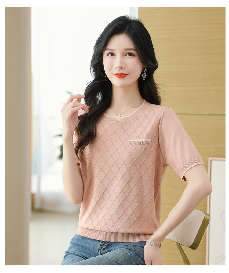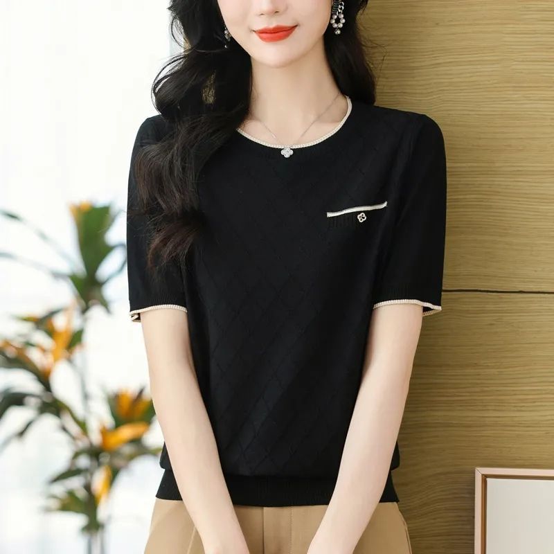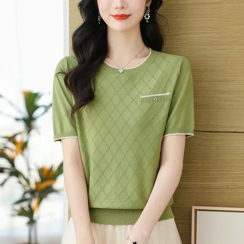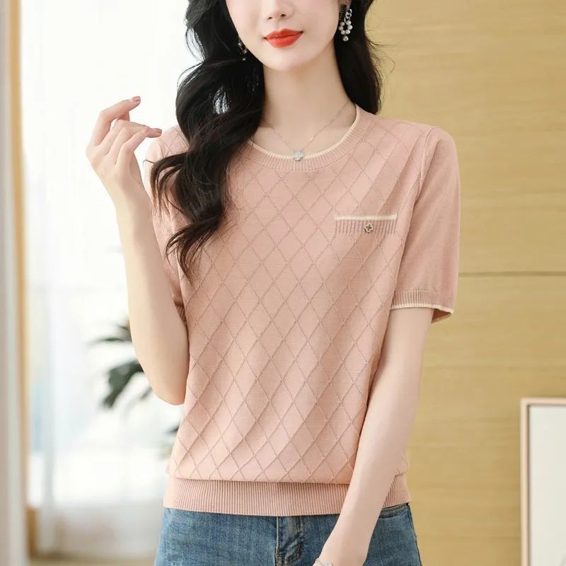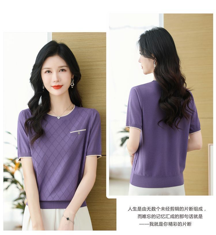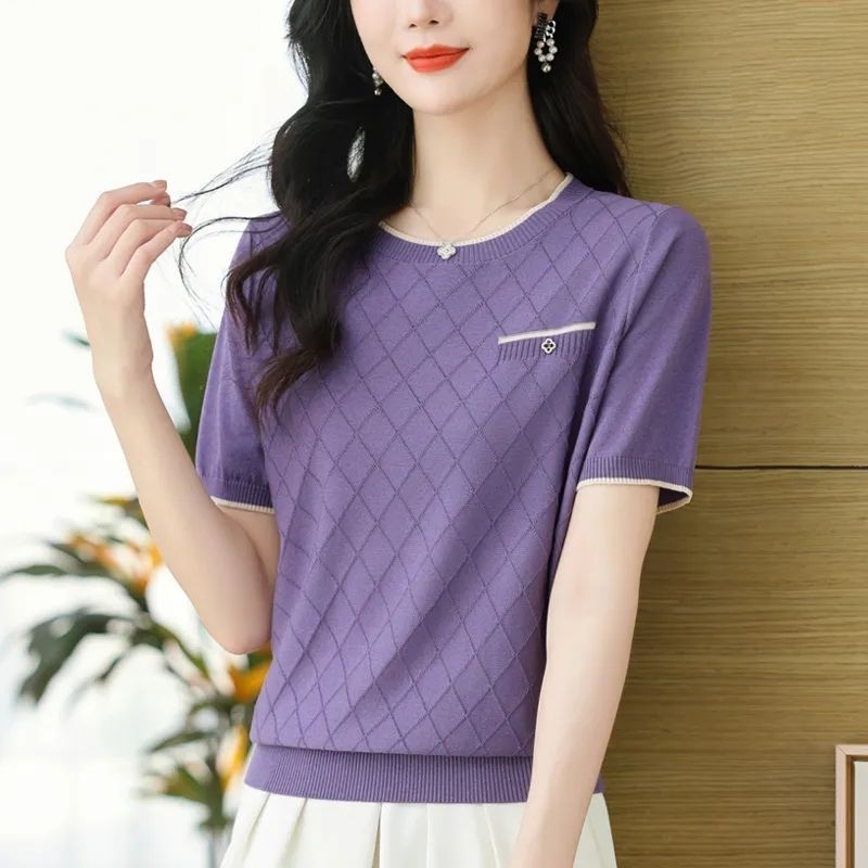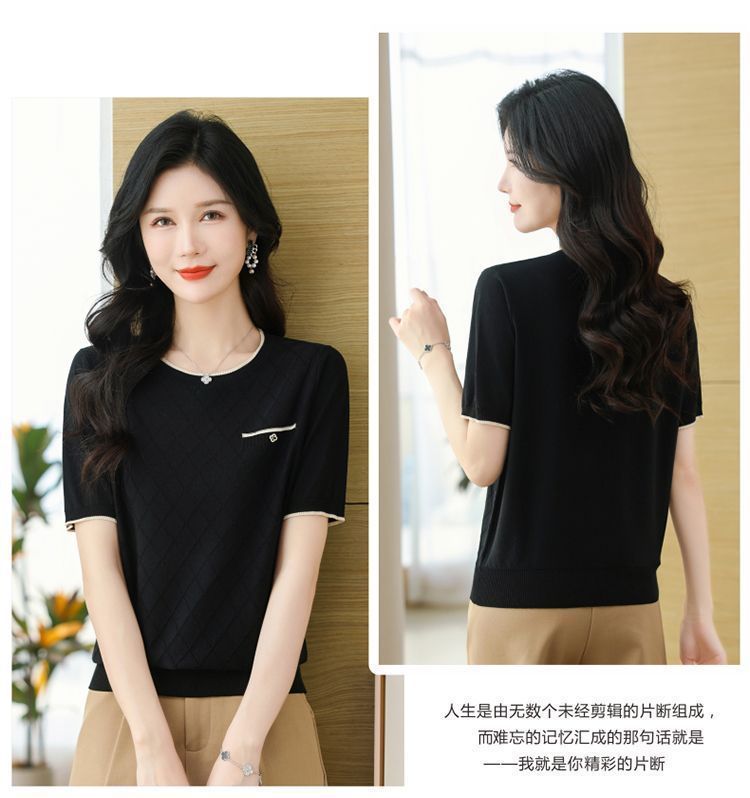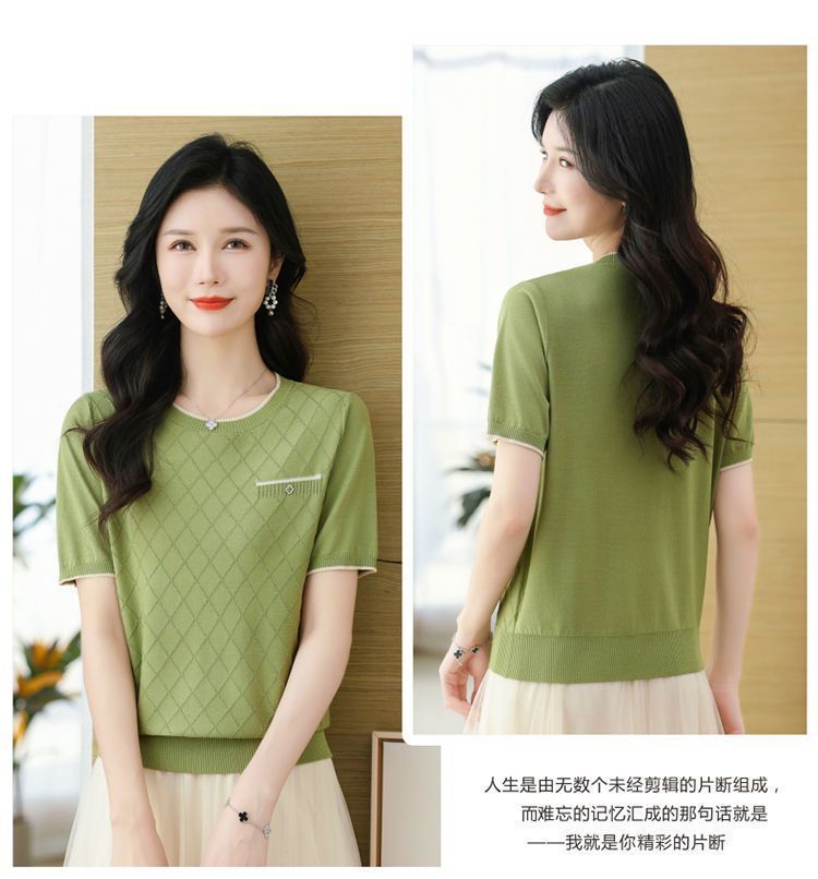 여름 새 스타일 라운드 넥 아이스 실크 솔리드 컬러 반팔 티셔츠 여성 루즈 슬리밍 패션 스웨터 캐주얼 얇은 탑