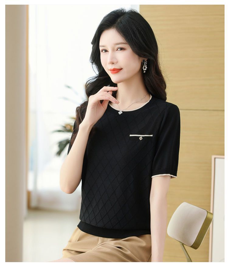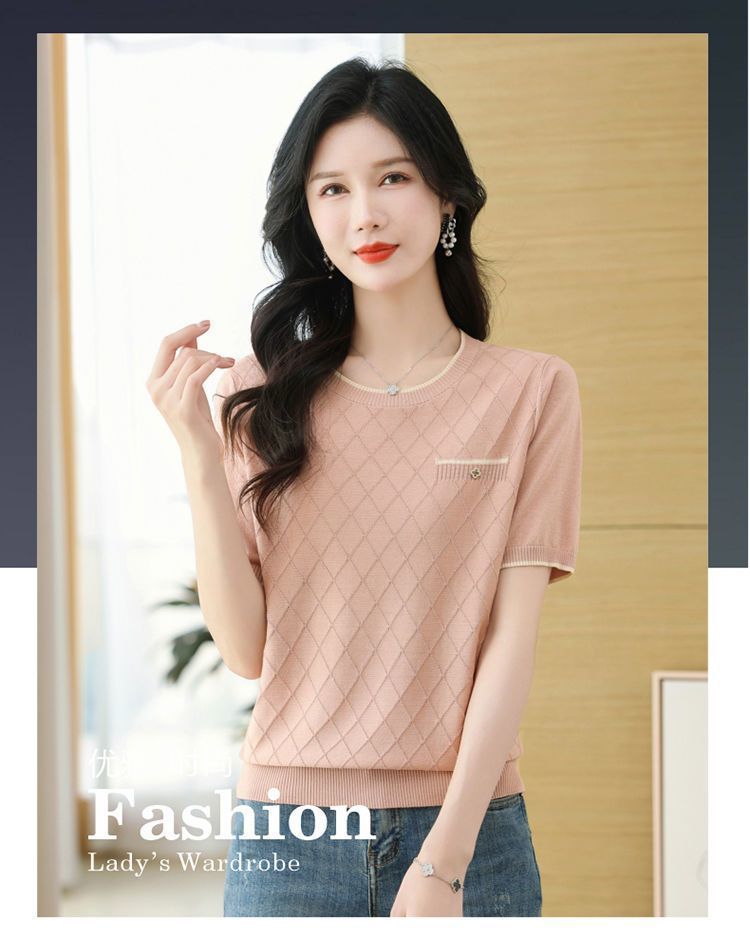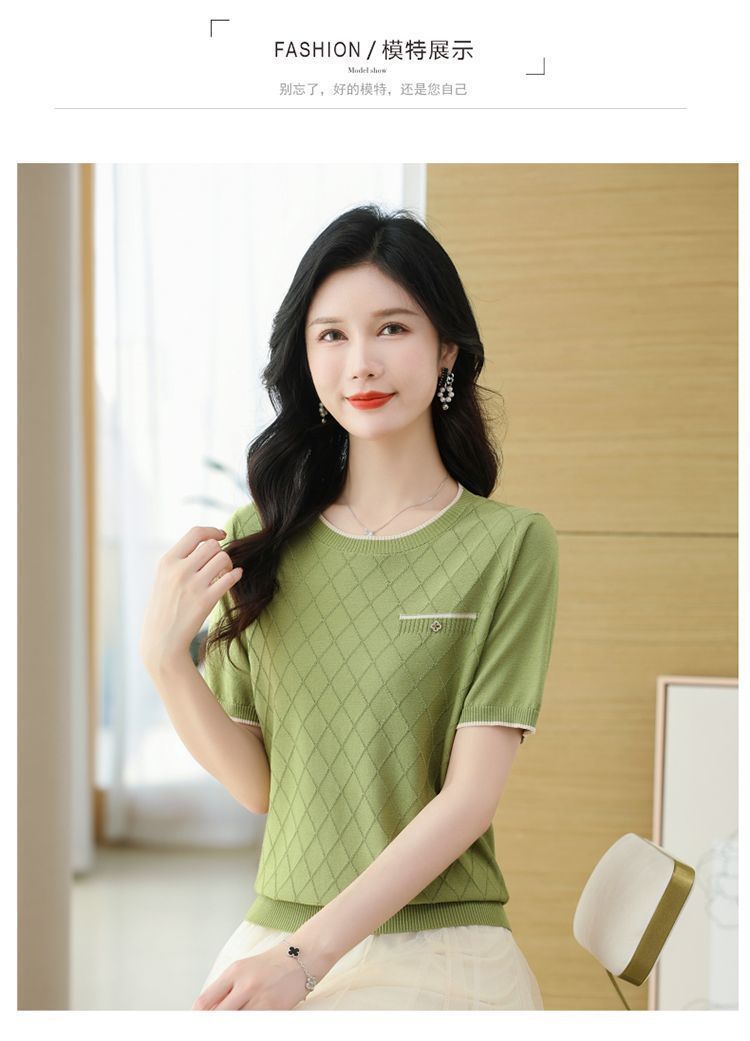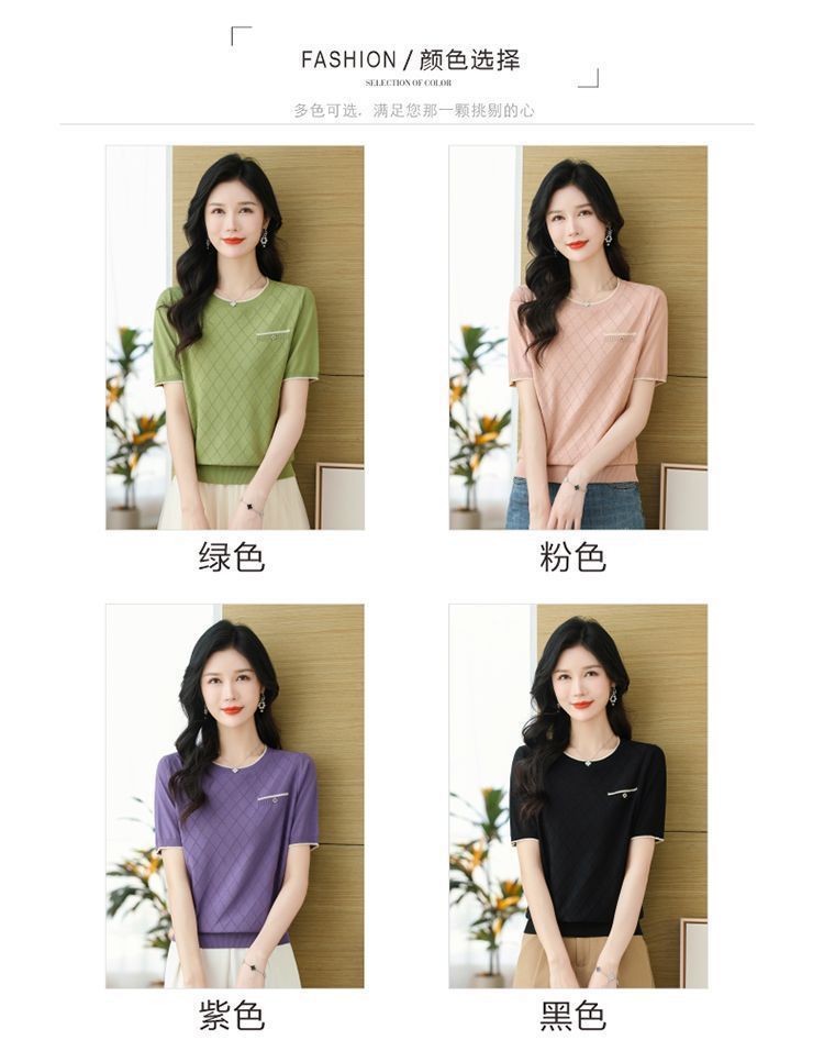 여름 새 스타일 라운드 넥 아이스 실크 솔리드 컬러 반팔 티셔츠 여성 루즈 슬리밍 패션 스웨터 캐주얼 얇은 탑스토어 가기
