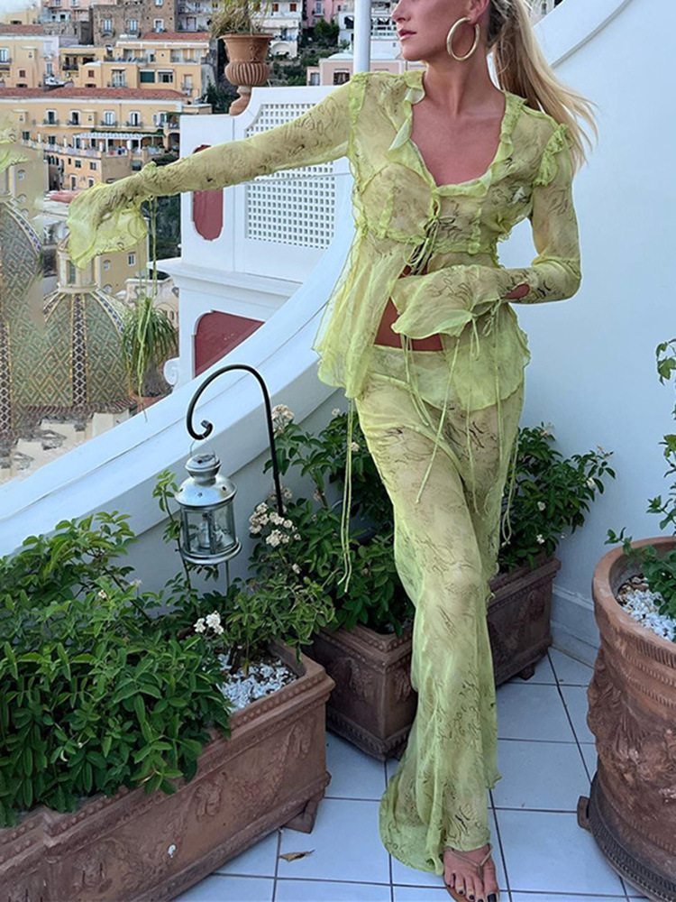 유럽과 미국의 국경 간 2025 새로운 섹시한 시스루 스트랩 프린트 탑 하이 웨이스트 타이 롱 스커트 여성 의류 도매