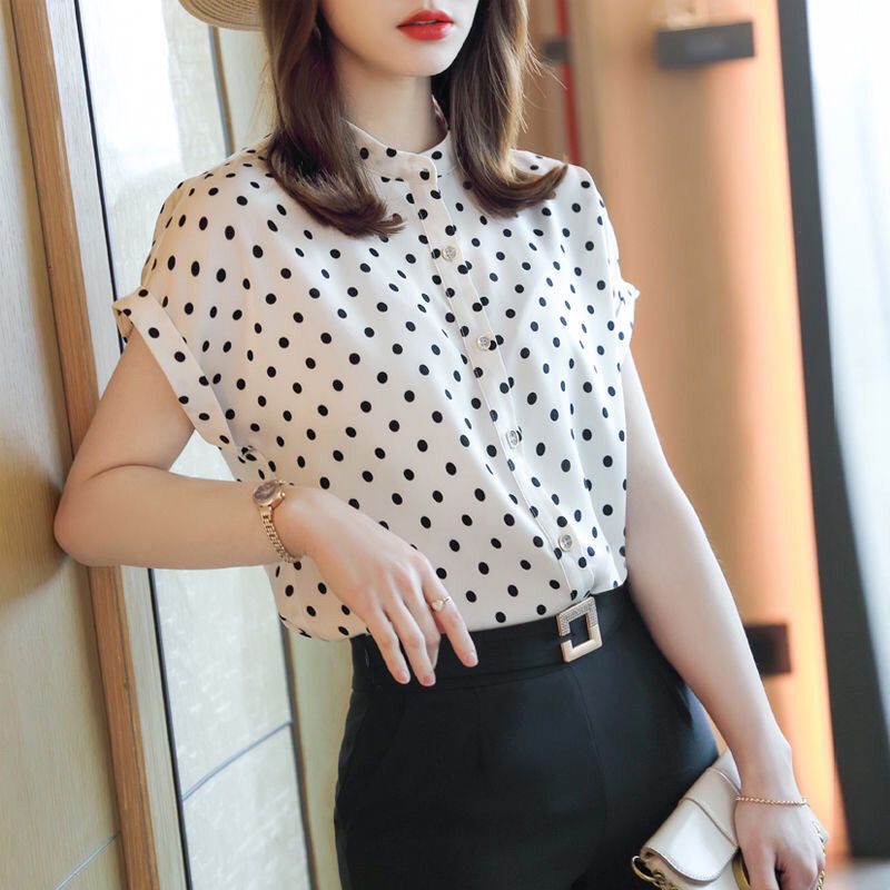 폴카 도트 탑 쉬폰 셔츠 스탠드 칼라 셔츠 여성 2025 새로운 여름 반팔 패션 여신 셔츠 반팔 여성스토어 가기