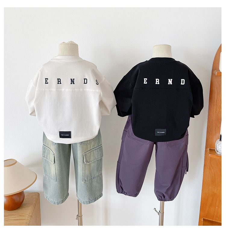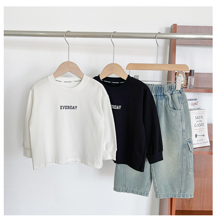 Xianao 2025 새로운 가을 아동복 아동 한국 스타일 잘 생긴 느슨한 바닥 소년과 소녀 다용도 편지 티셔츠