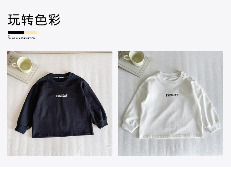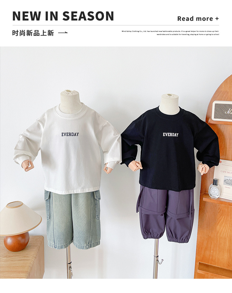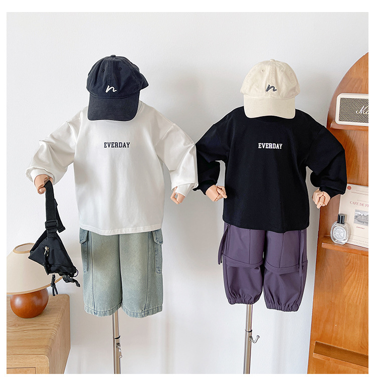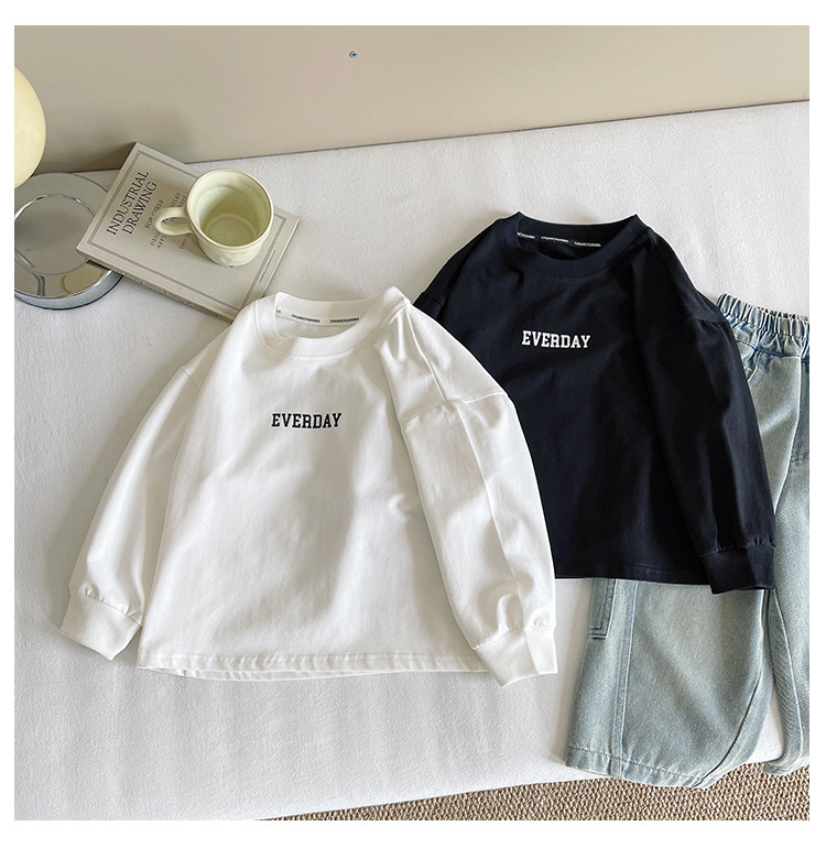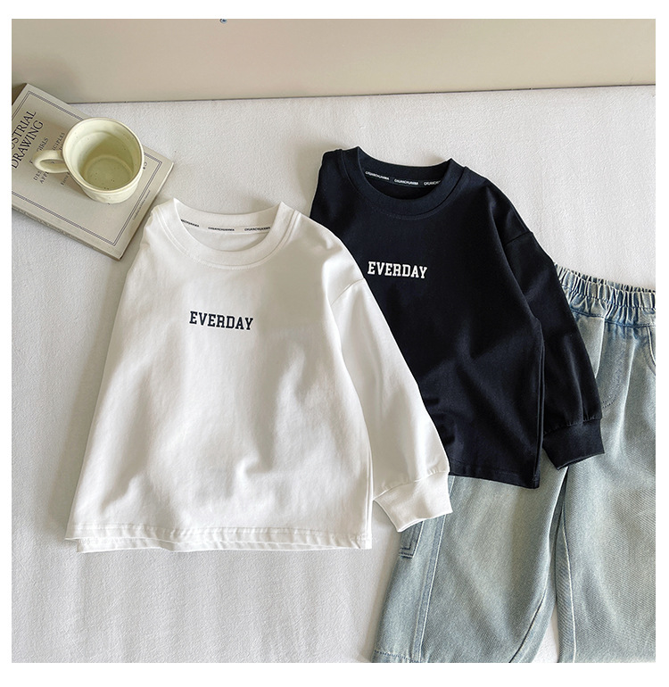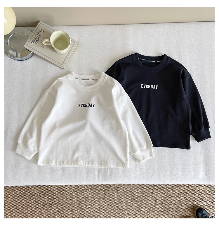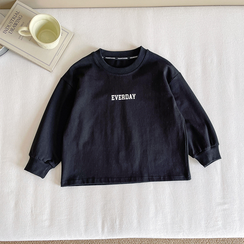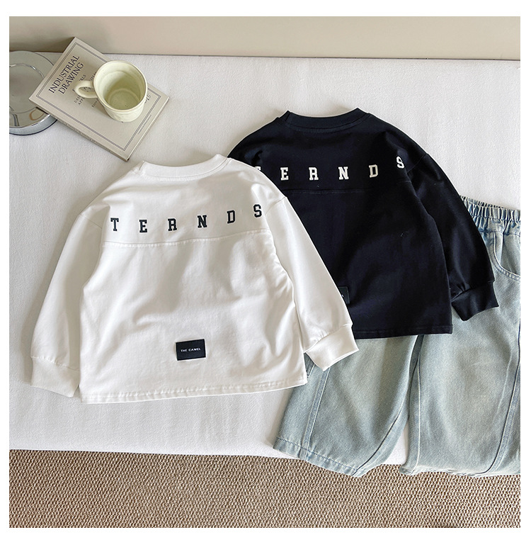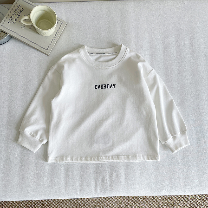 Xianao 2025 새로운 가을 아동복 아동 한국 스타일 잘 생긴 느슨한 바닥 소년과 소녀 다용도 편지 티셔츠스토어 가기