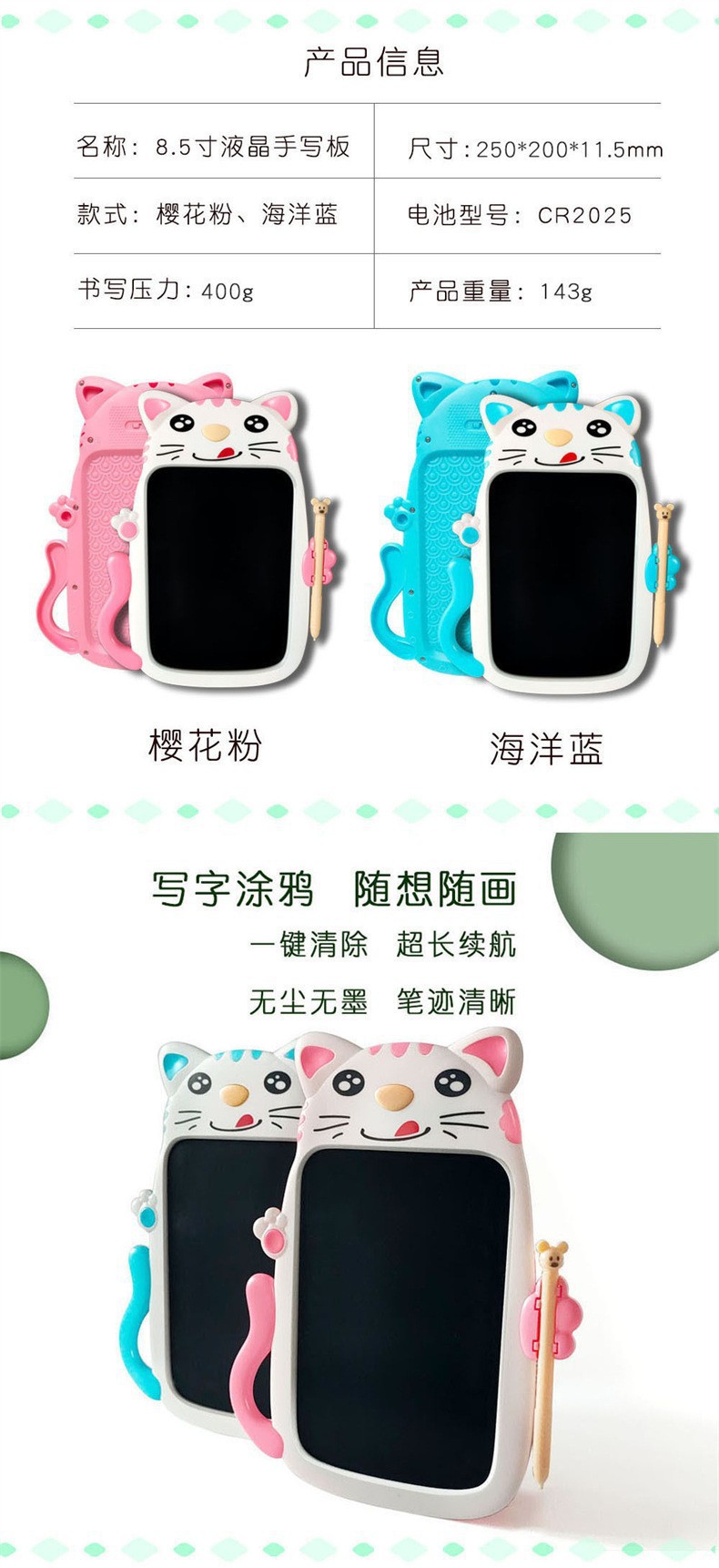 배터리 LCD 컬러 필기 보드 아기 쓰기 보드 전자 그림 고양이 그림 보드 필기 보드 지울 수있는 그림 보드