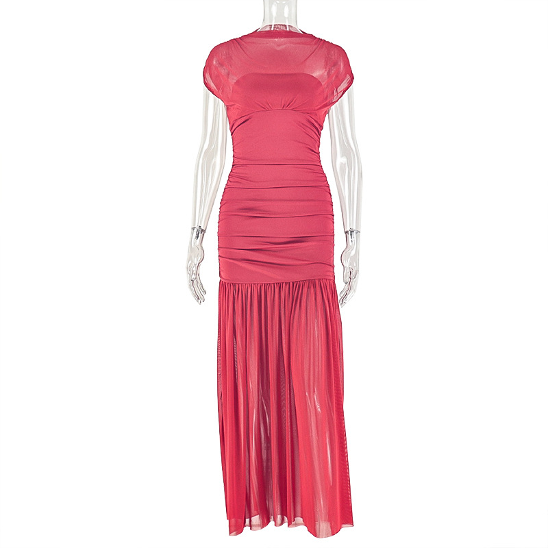 유럽과 미국 스타일의 크로스보더 스타일 슬림 여성 솔리드 컬러 스플라이싱 힙 스커트 민소매 하이 칼라 플리츠 통근 롱 드레스