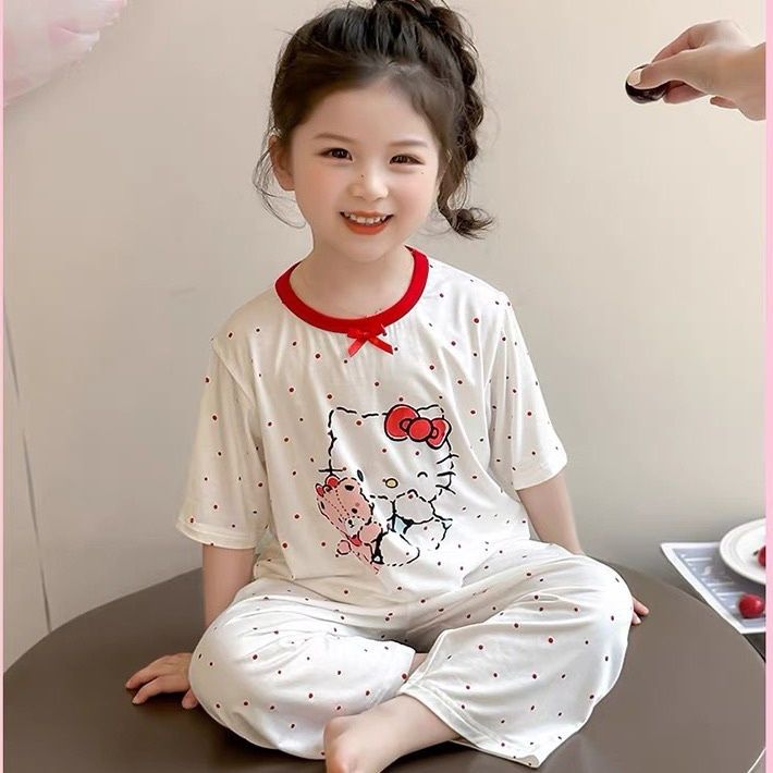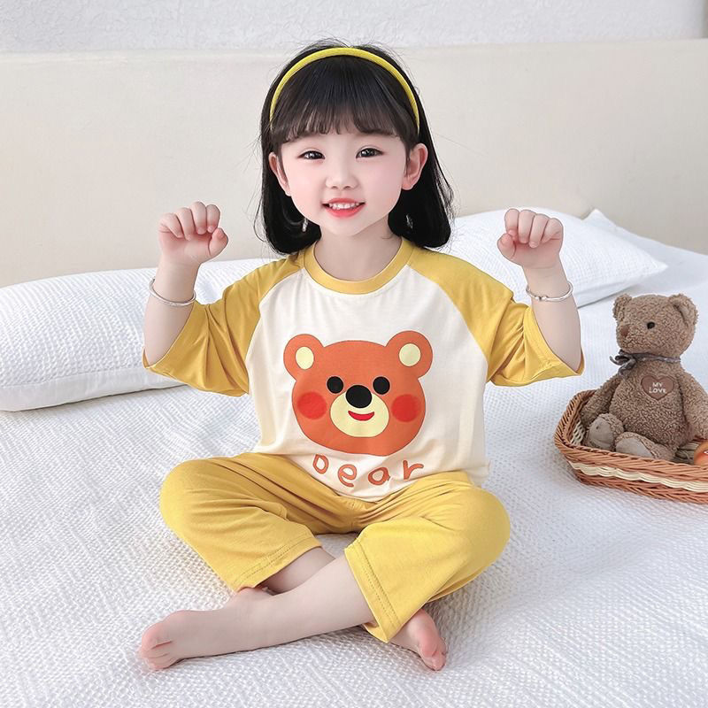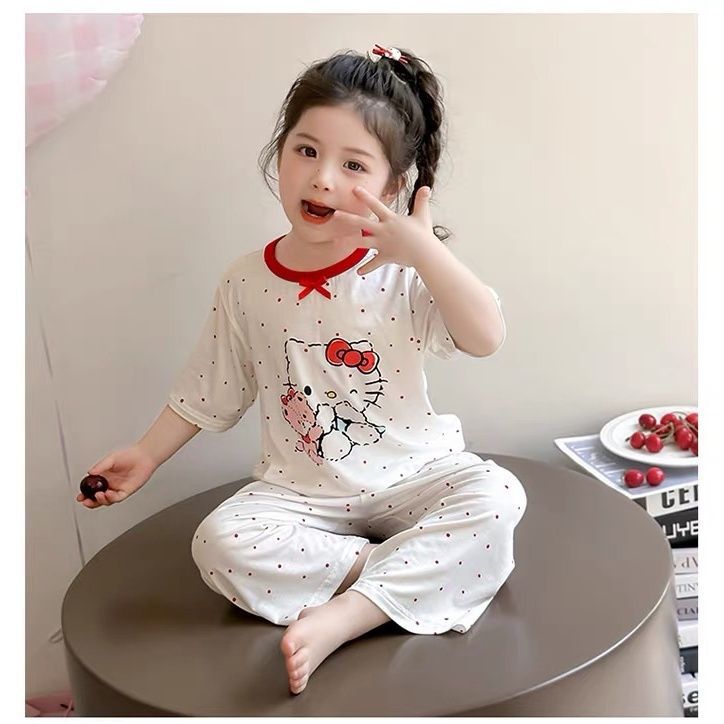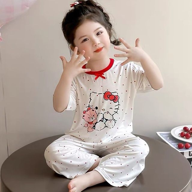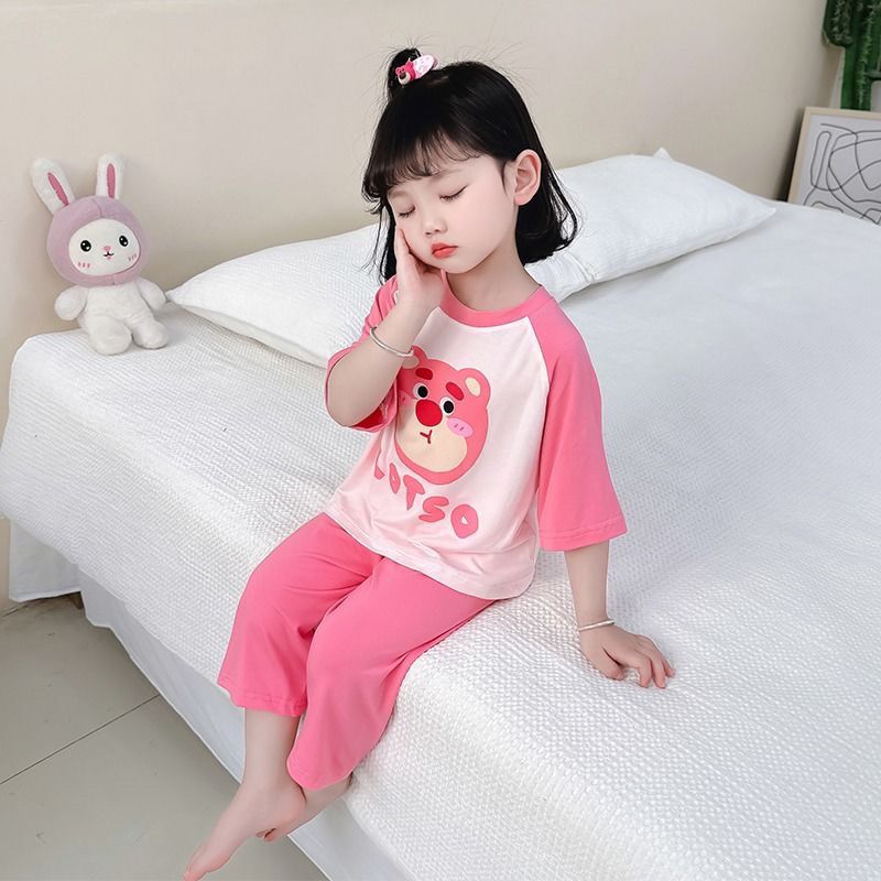 여자 잠옷 세트 여름 얇은 2025 새로운 아기 소녀 만화 7/4 소매 가정 의류 귀여운 에어컨 옷스토어 가기