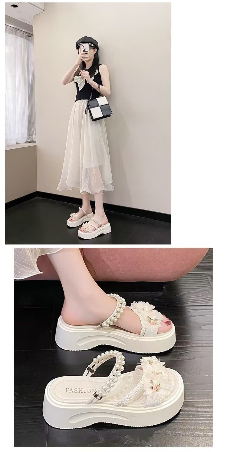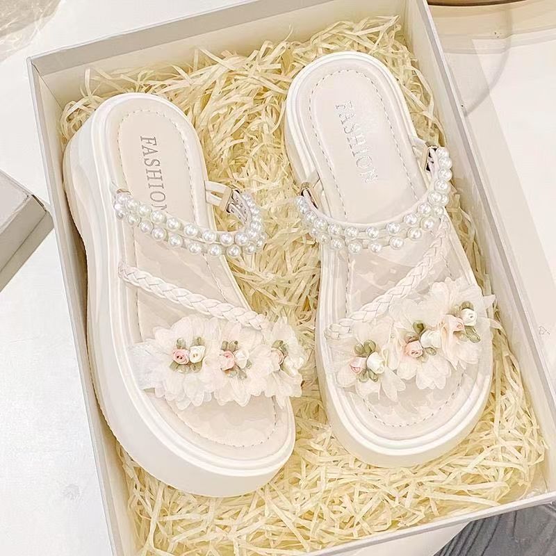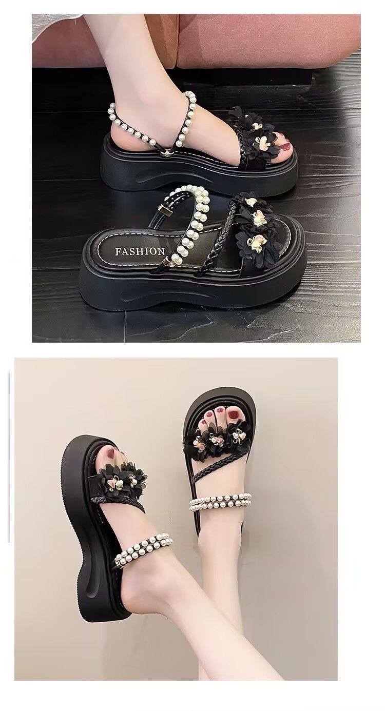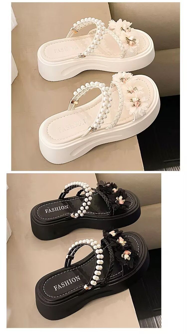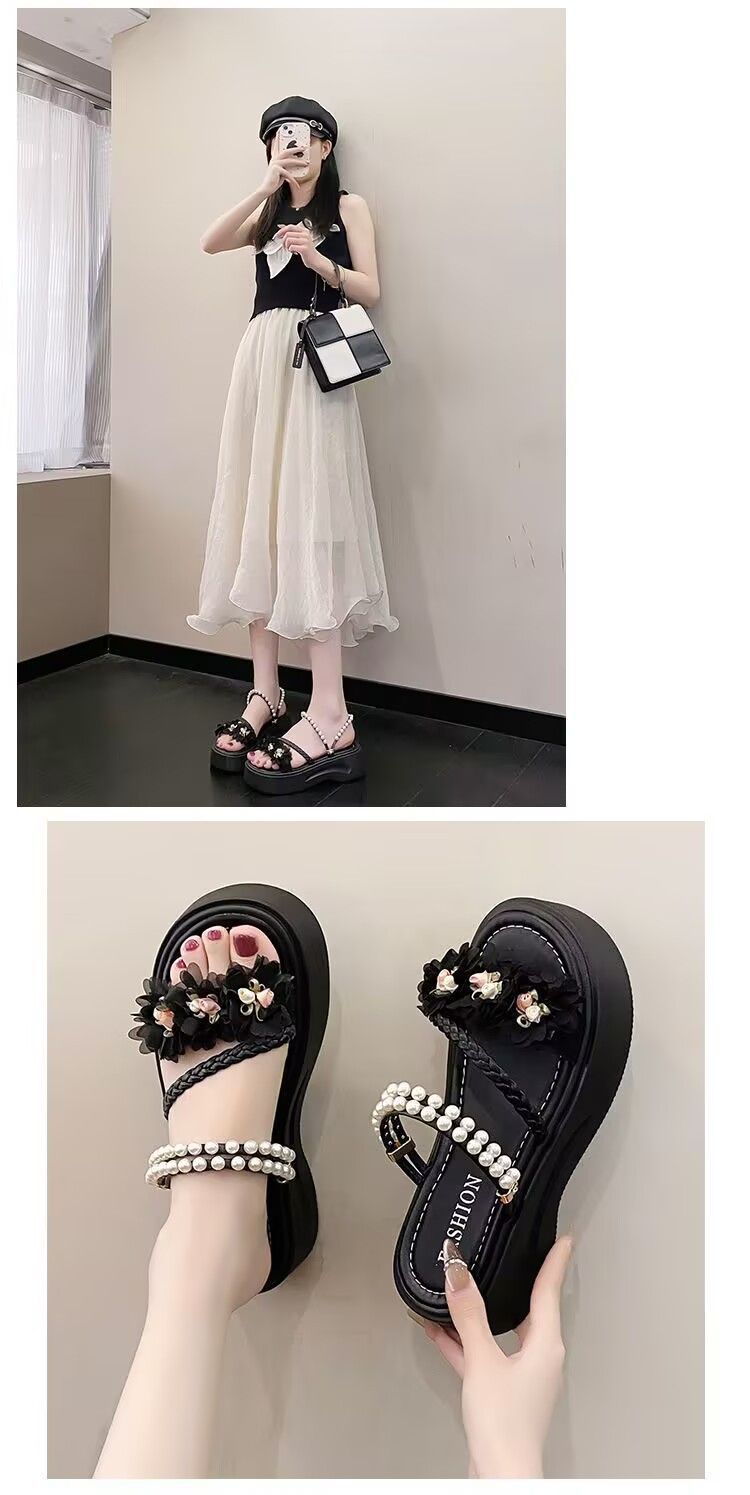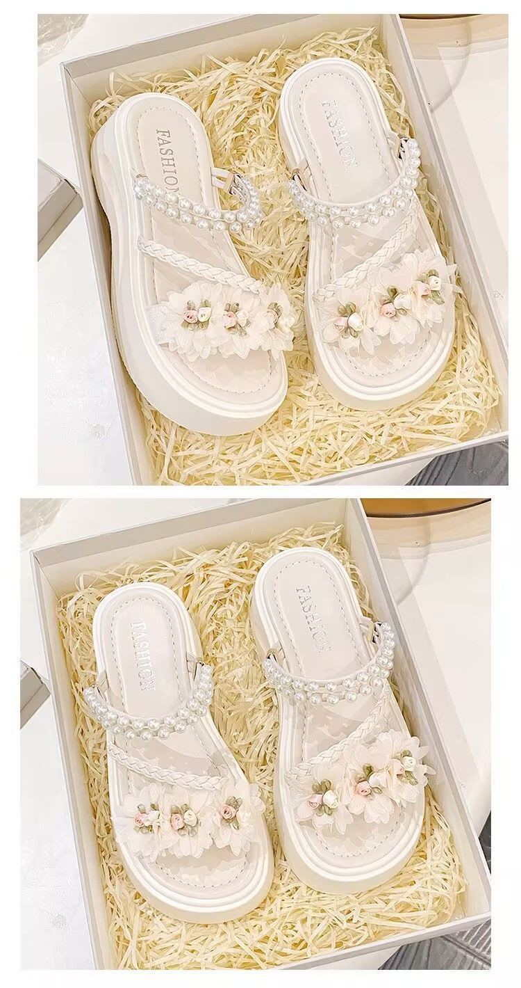 2025 여성을위한 새로운 작은 향기 꽃 슬리퍼 여름 겉옷 두꺼운 밑창 해변 휴가 스커트와 여성용 비치 샌들스토어 가기