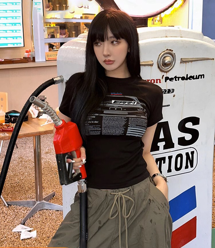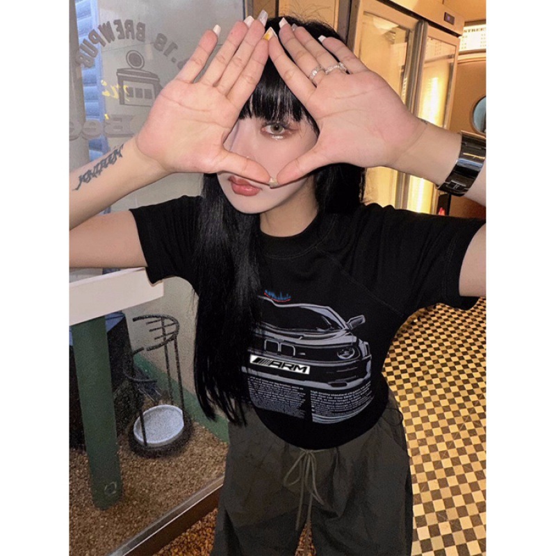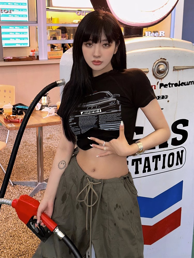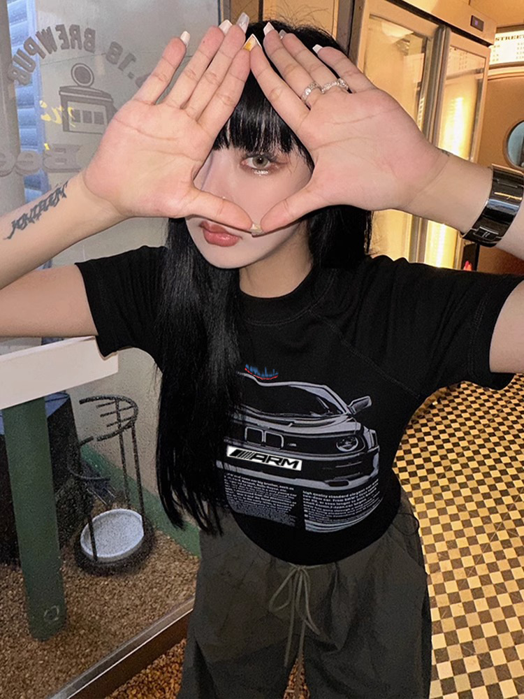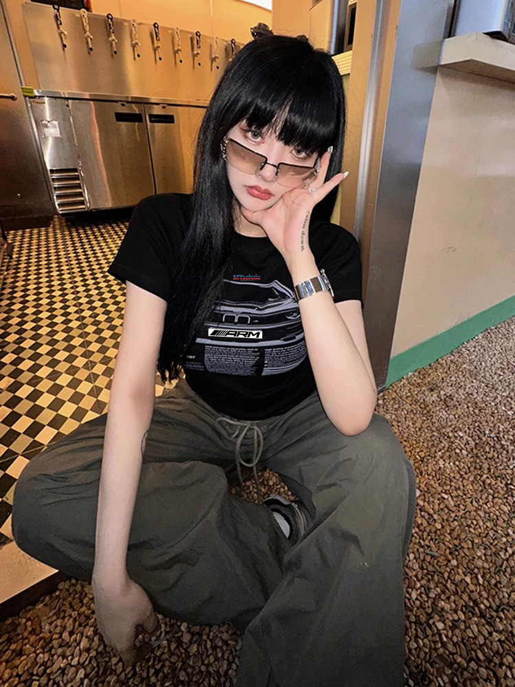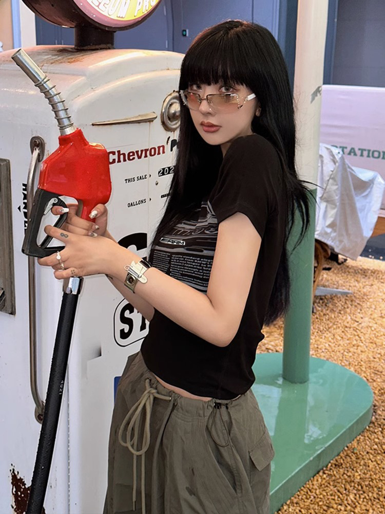 2024 라운드 넥 청소년 트렌디 패션 저렴한 다목적 슬리밍 순수한 욕망 스타일 슬림 짧은 티셔츠 여성 반팔스토어 가기