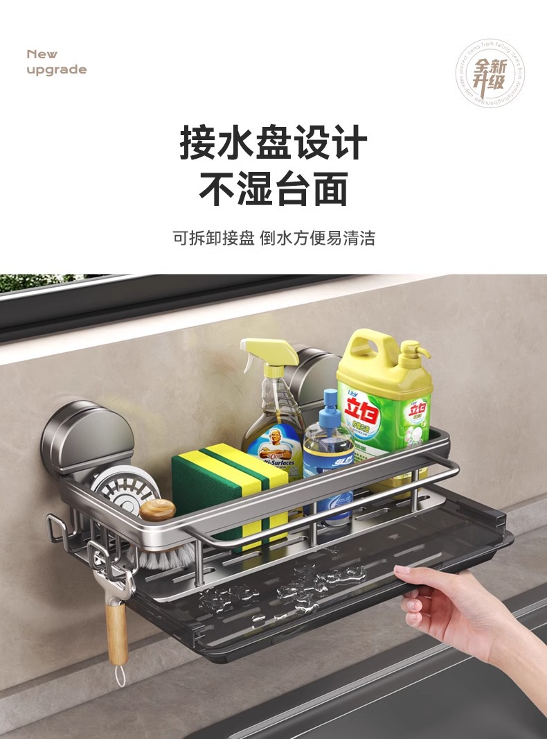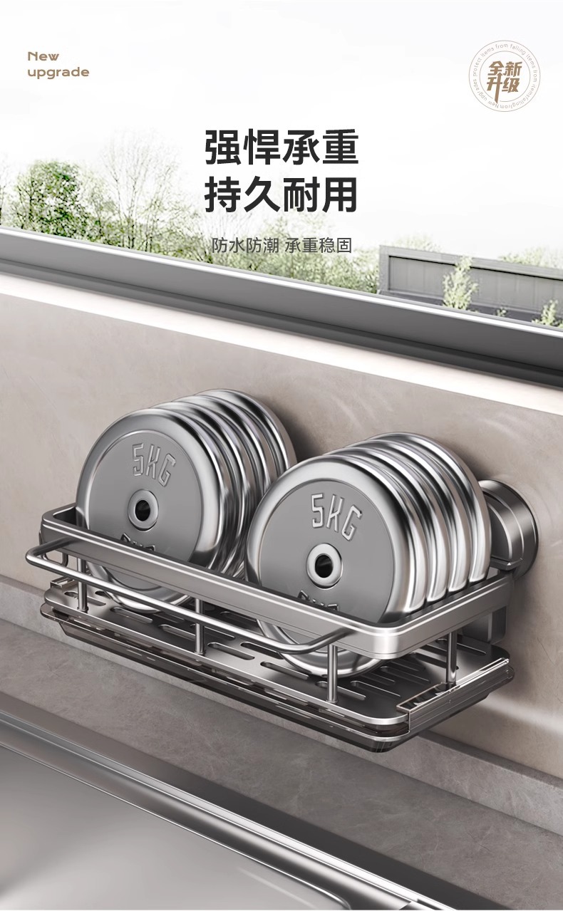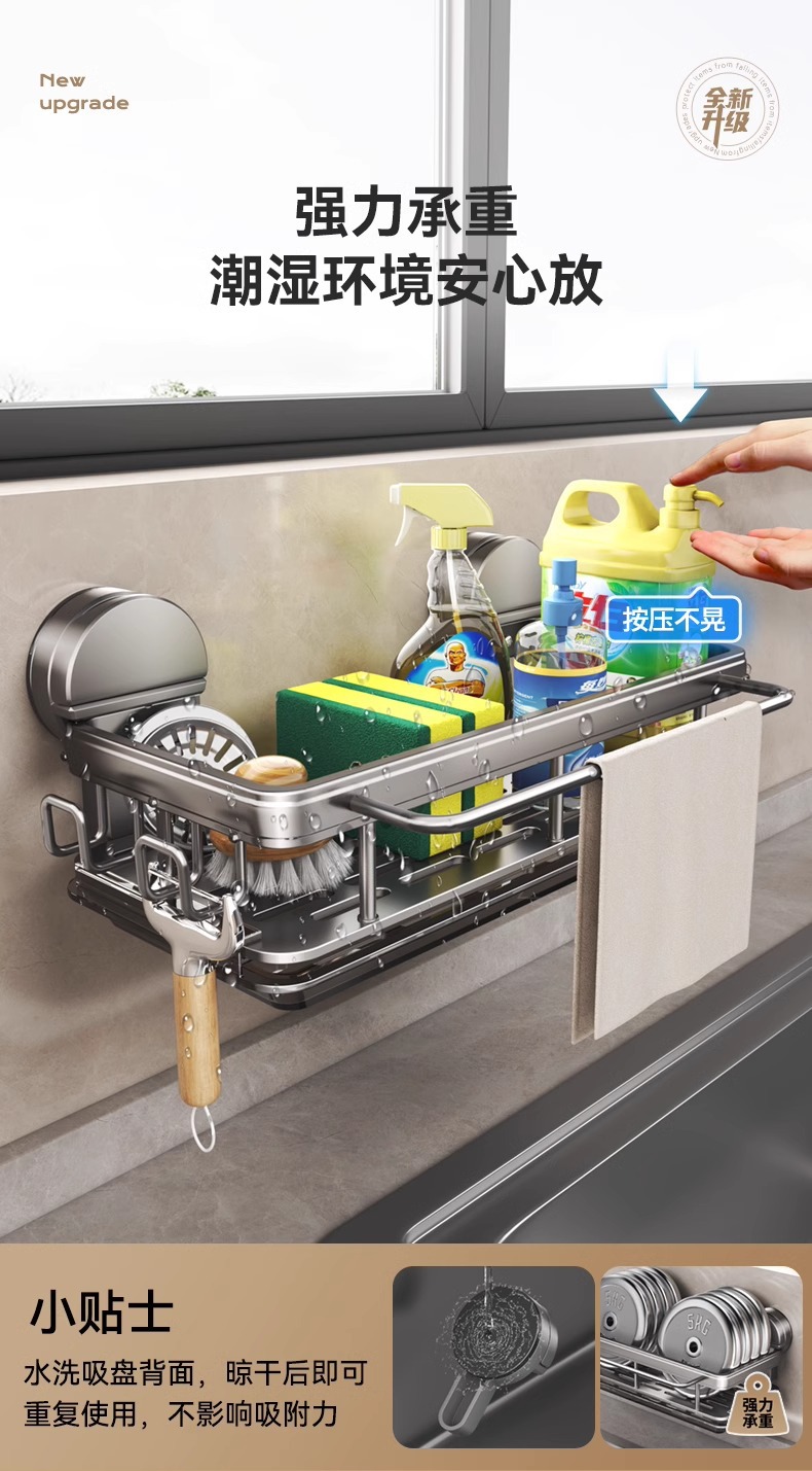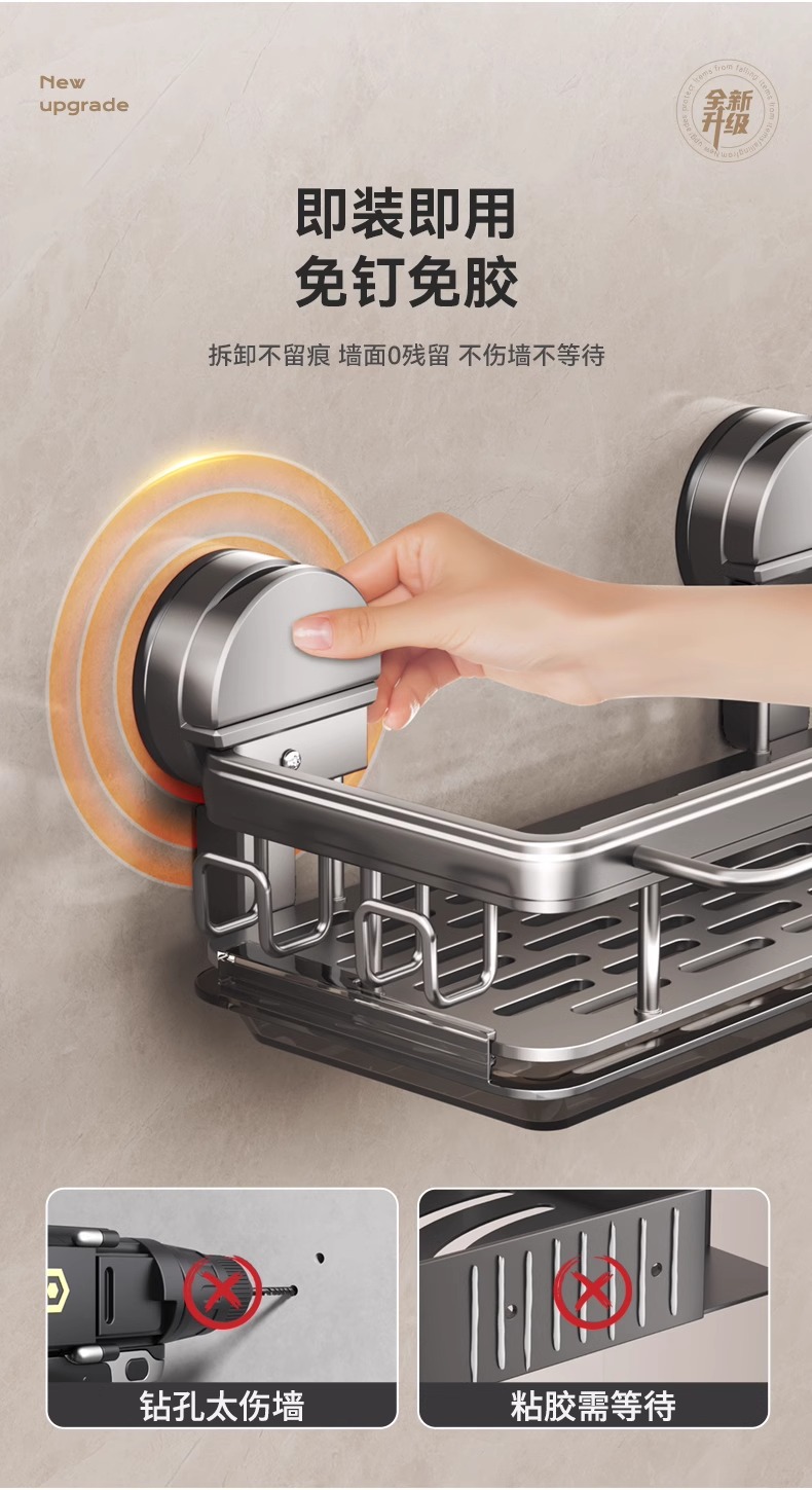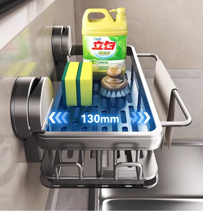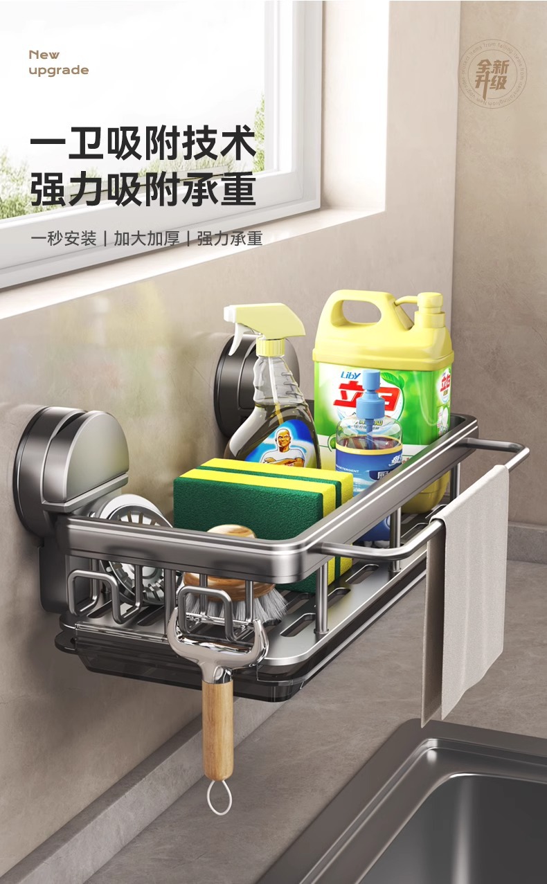 흡착컵 주방수납선반, 걸레수납 및 배수선반, 펀치프리 벽걸이 양념선반, 수도꼭지 싱크대용품