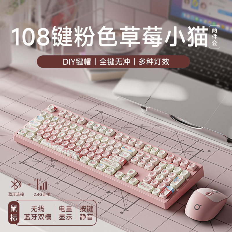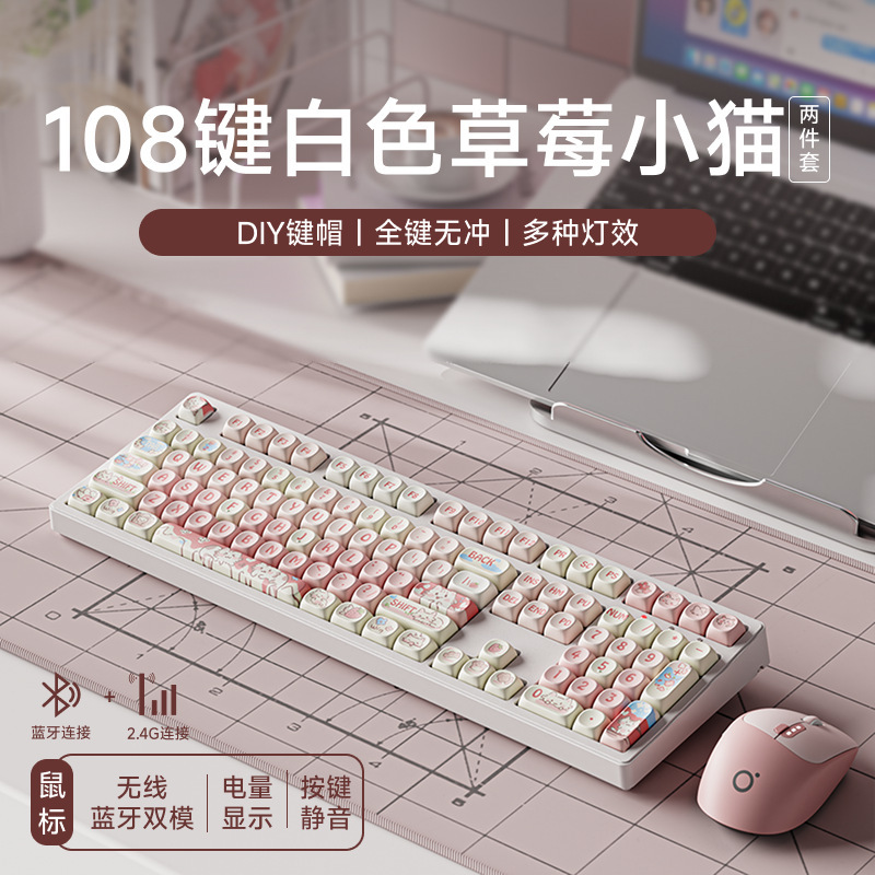 • 108키 핑크 딸기 고양이 [백색광] 무선 3모드 + 사일런트 마우스 - 레드 축 [가벼운 느낌]