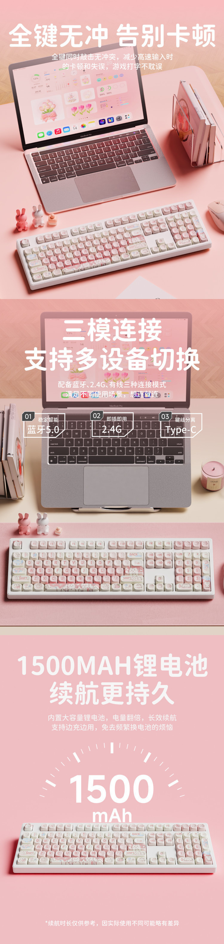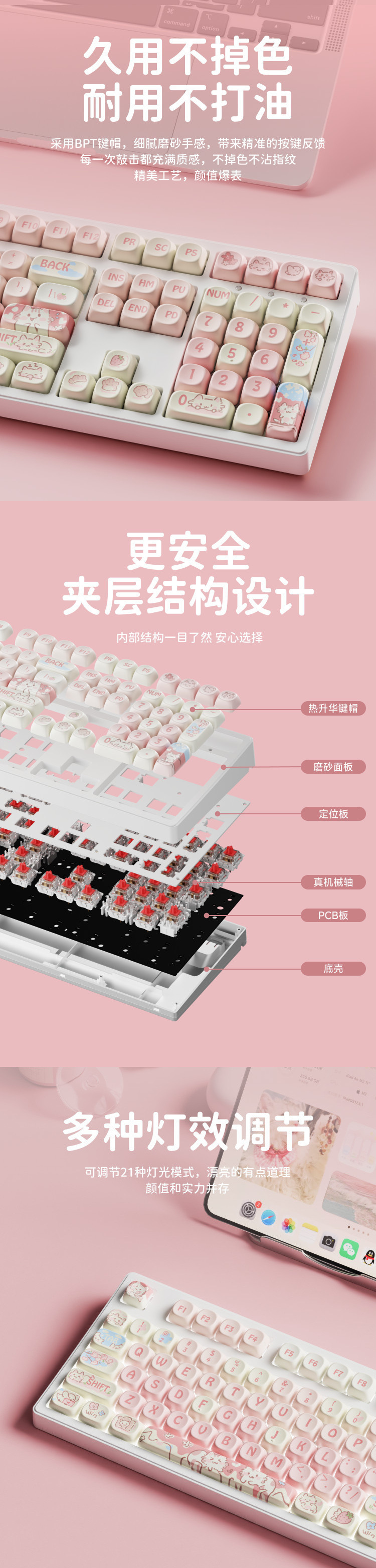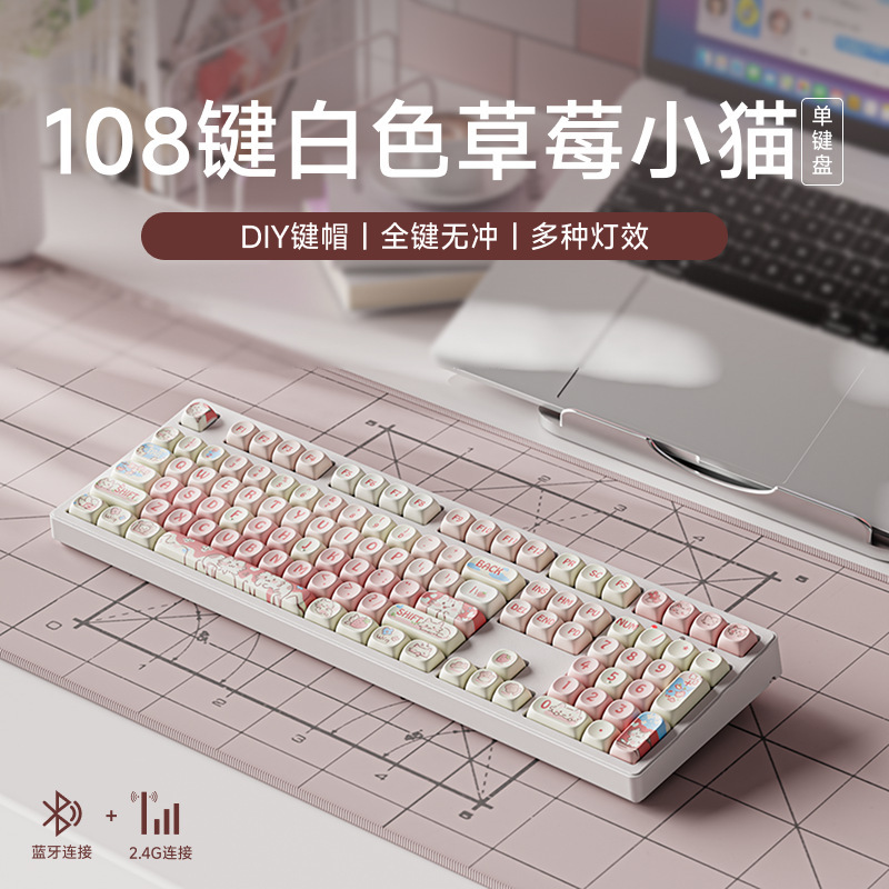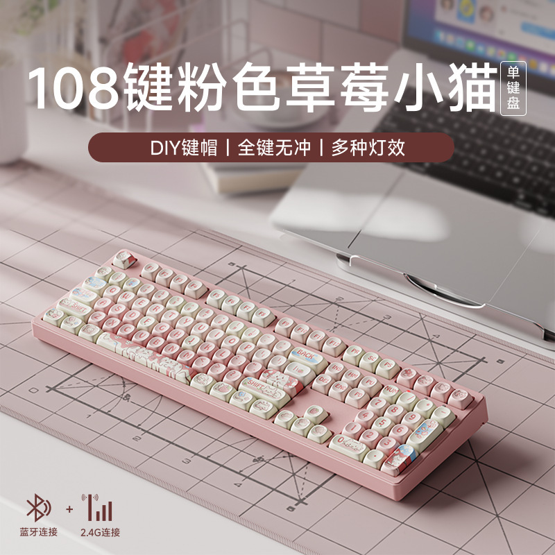 • 108키 핑크 딸기 고양이 [백색광] 무선 3모드 - 싱글 키보드 - 녹색 축 [선명한 느낌]