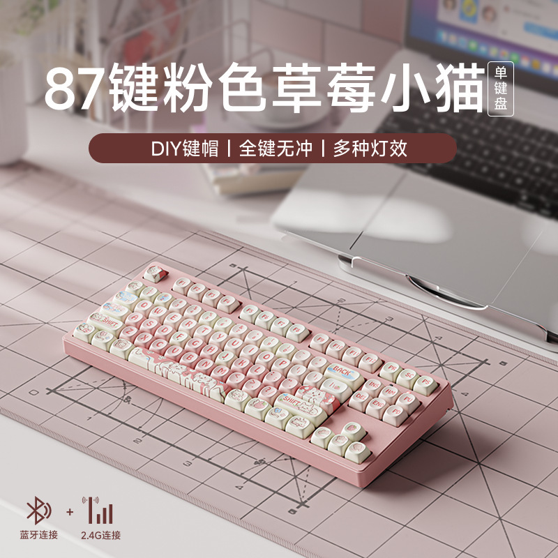 • 87키 핑크 딸기 고양이 [백색광] 무선 3모드 - 싱글 키보드 - 레드 샤프트 [가벼운 느낌]