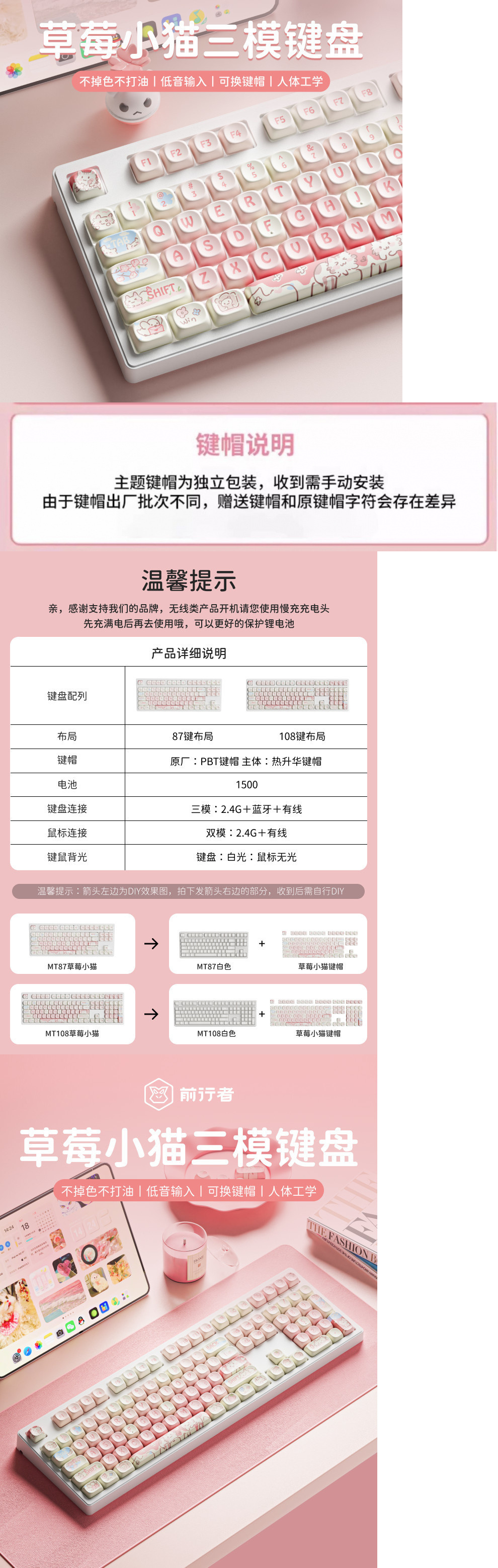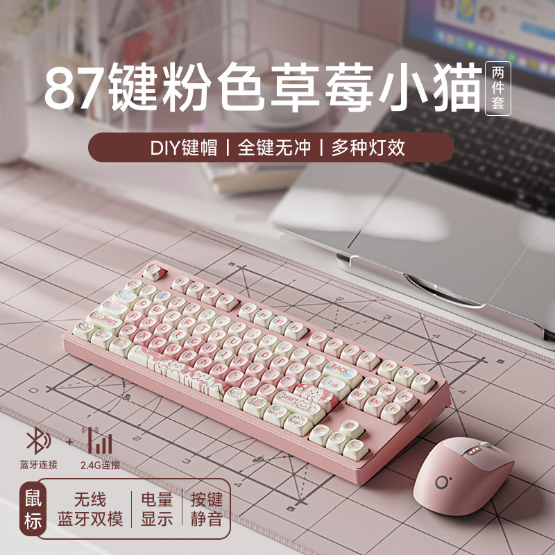 • 87키 핑크 딸기 고양이 [백색광] 무선 3모드 + 무음 마우스 - 빨간색 축 [가벼운 느낌]