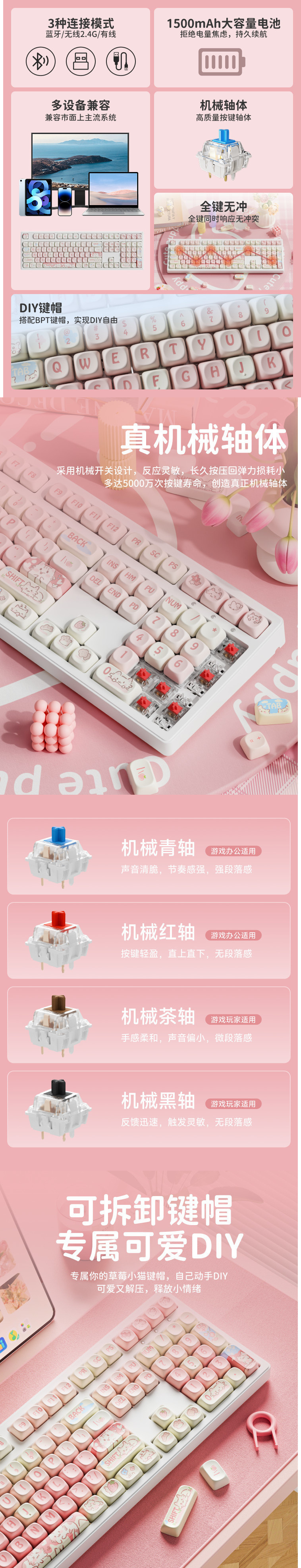 • 87키 핑크 딸기 고양이 [백색광] 무선 3모드 + 무음 마우스 - 녹색 축 [선명한 느낌]