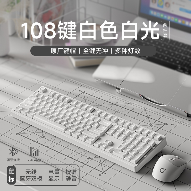 • 108키 흰색 [백색광] 무선 3모드 + 무음 마우스 - 녹색 축 [선명한 느낌]