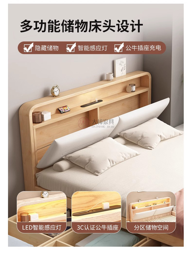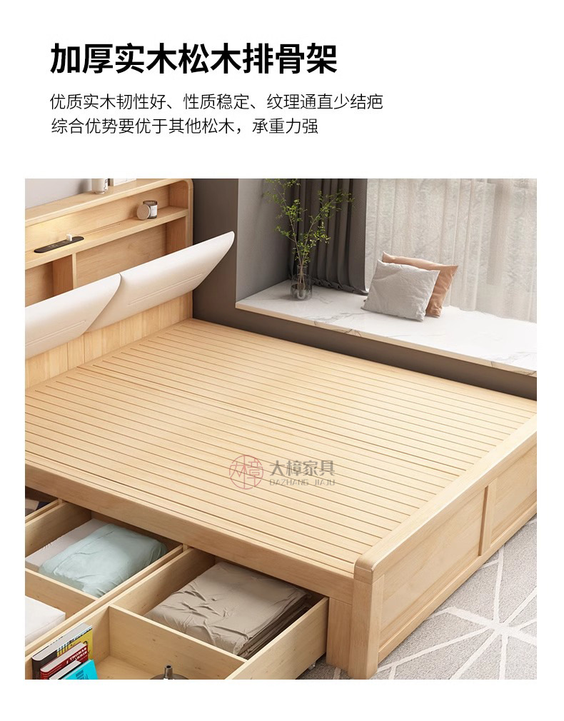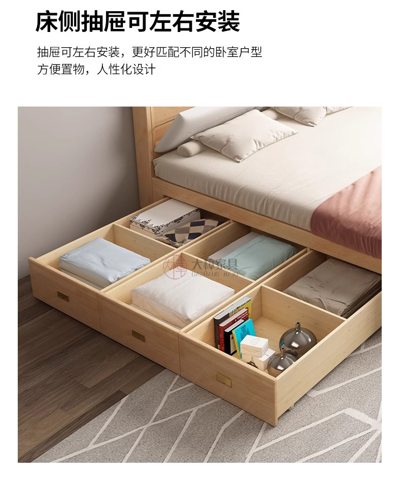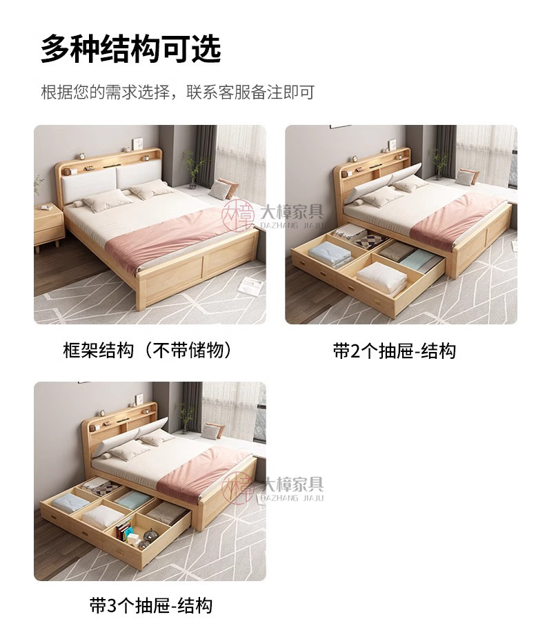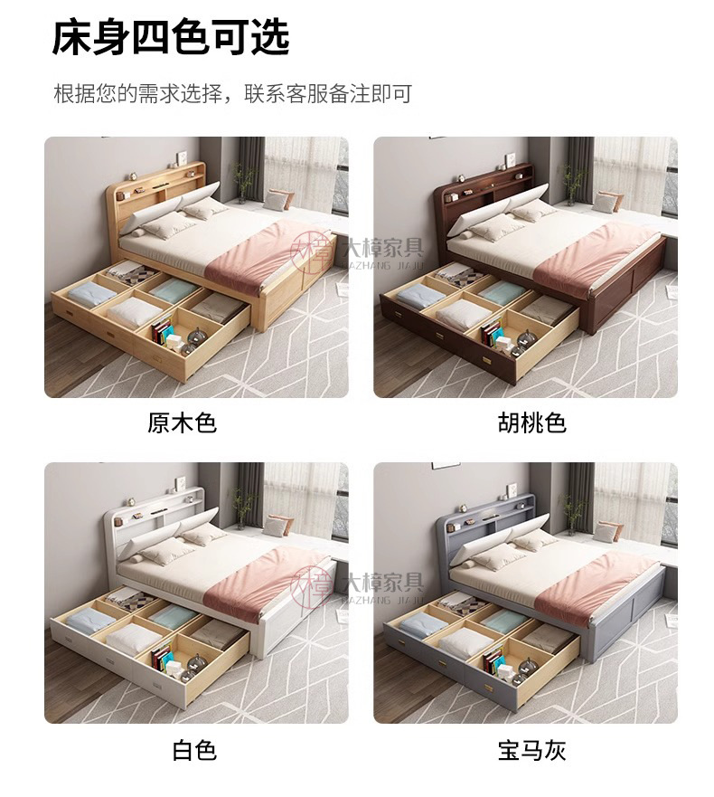 • 135*200CM [박스 프레임 구조(서랍 2개 또는 3개)] 기능성 원목 침대 + 침대 옆 탁자 1개, 로그/화이트/월넛/BMW 그레이