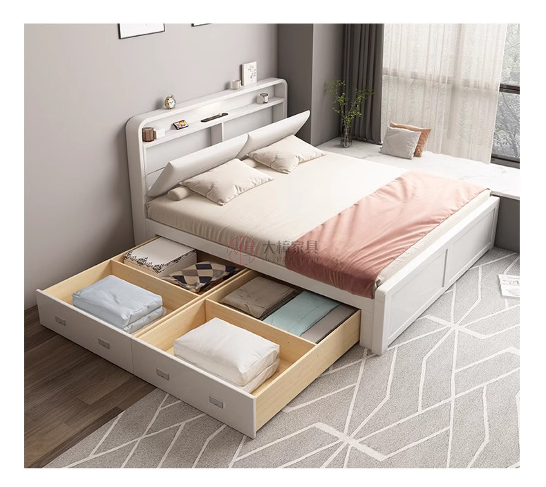 • 200*220CM [박스 프레임 구조(서랍 2개 또는 3개)] 기능성 원목 침대 + 침대 옆 탁자 1개 로그/화이트/월넛/BMW 그레이