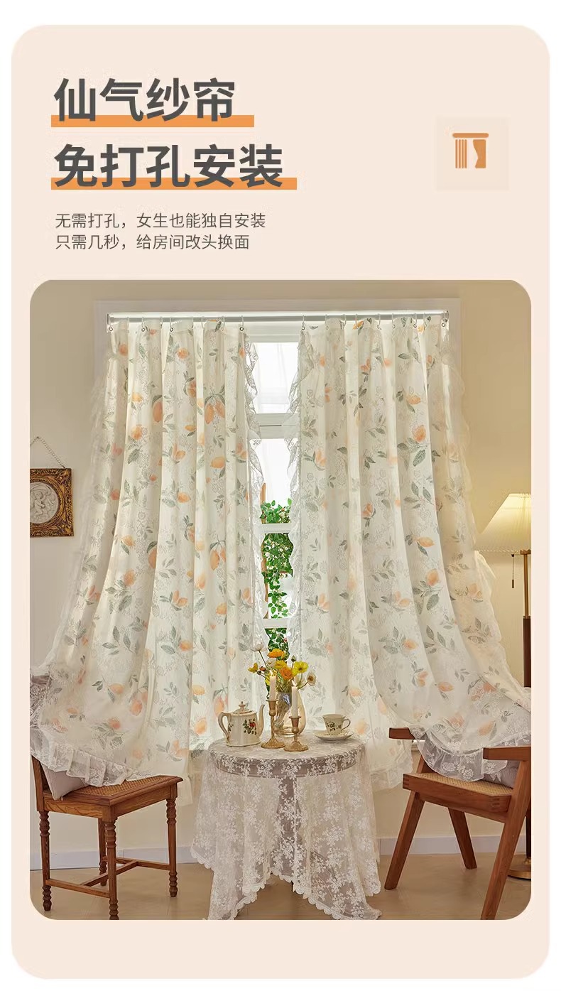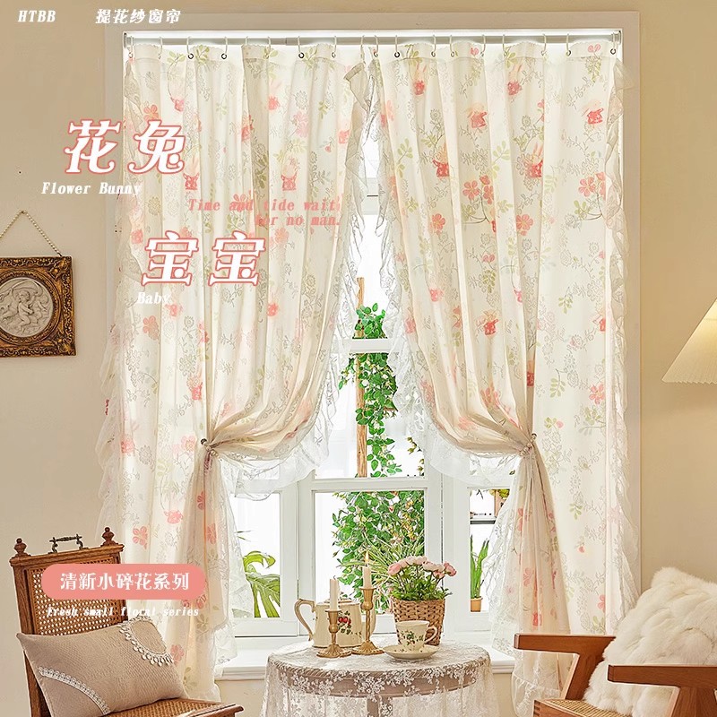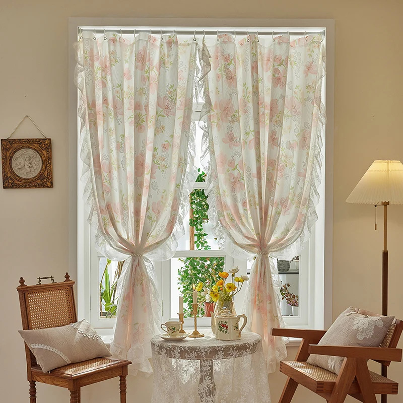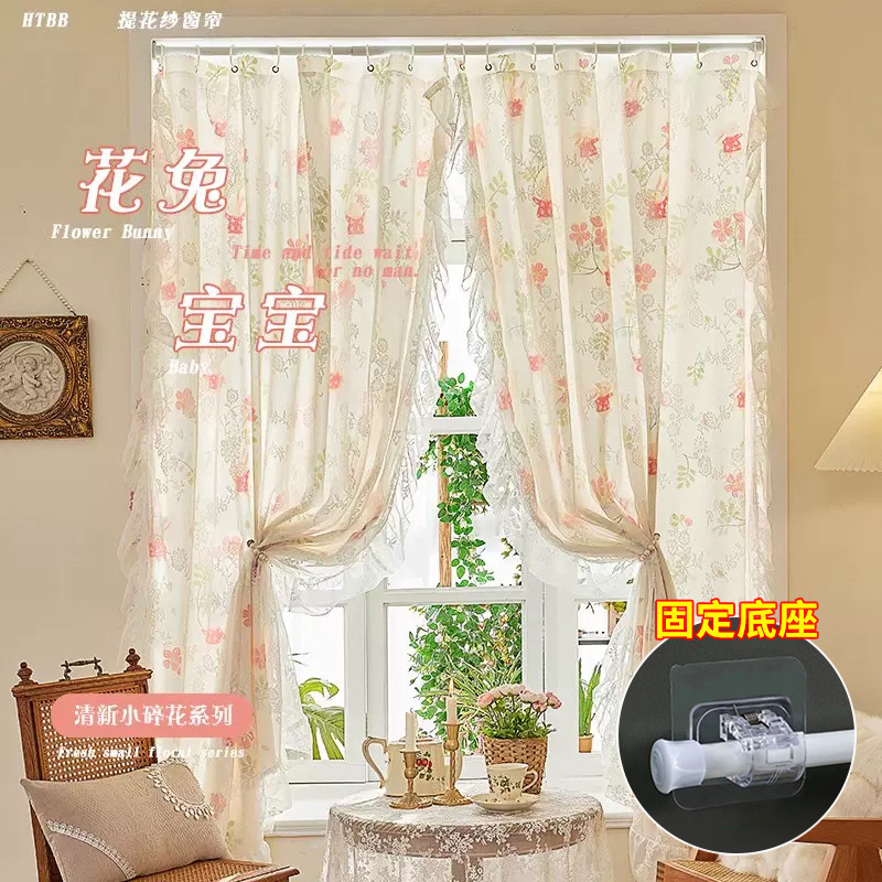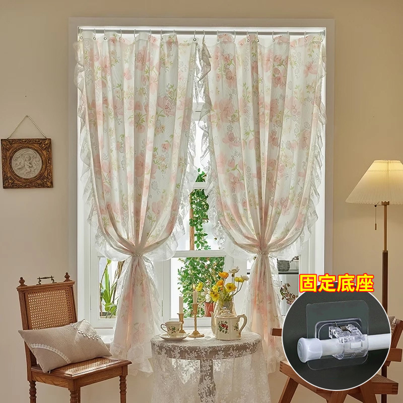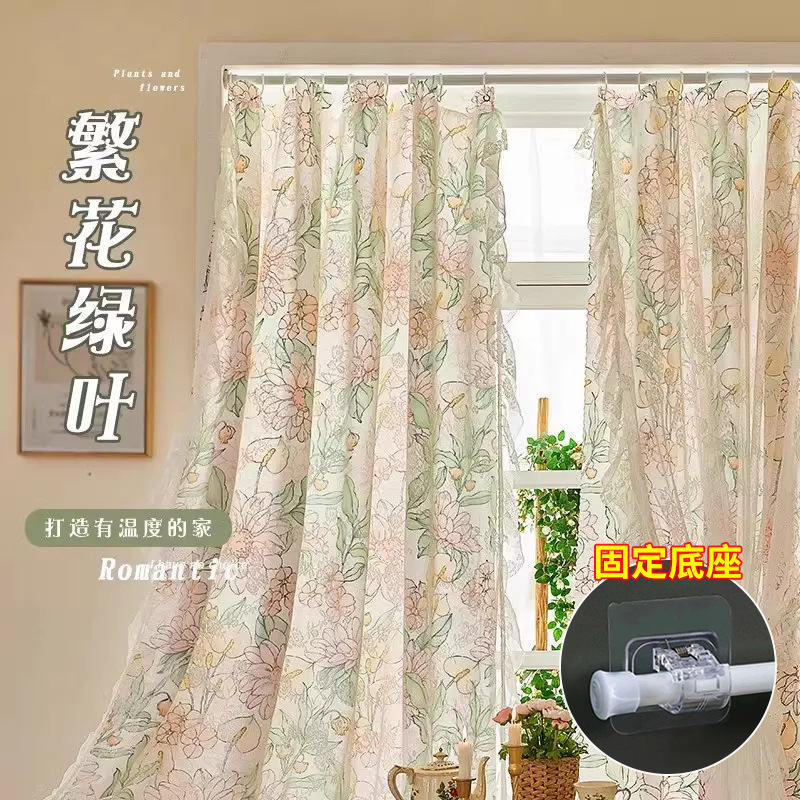 프랑스 복고풍 목가적 인 꽃 무늬 더블 레이어 레이스 커튼 빛 차단 2024 새로운 펀치없는 설치 천 침실 거즈 커튼