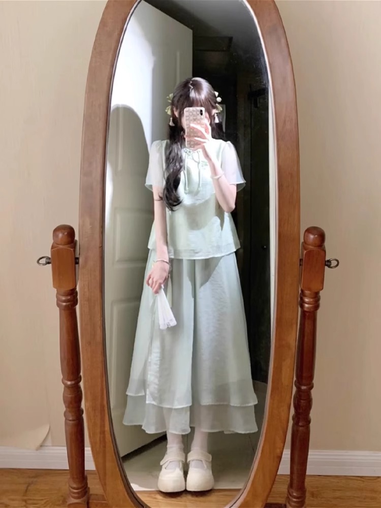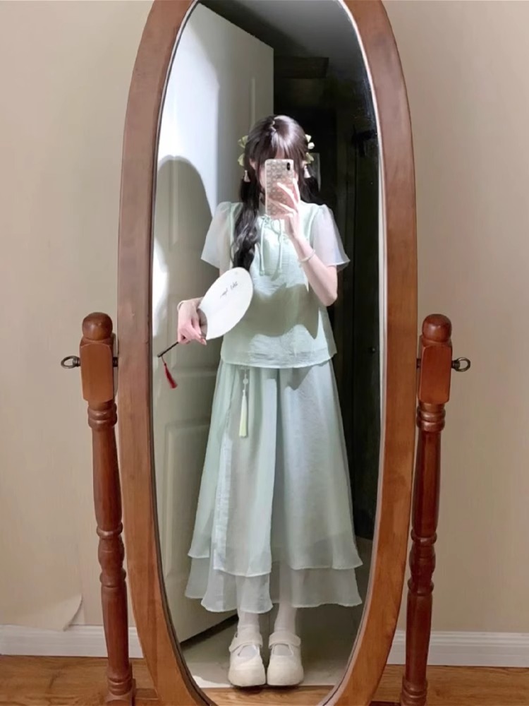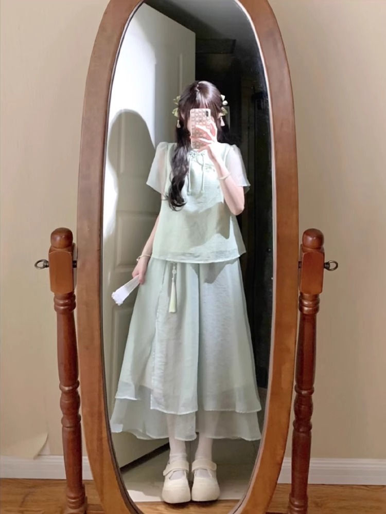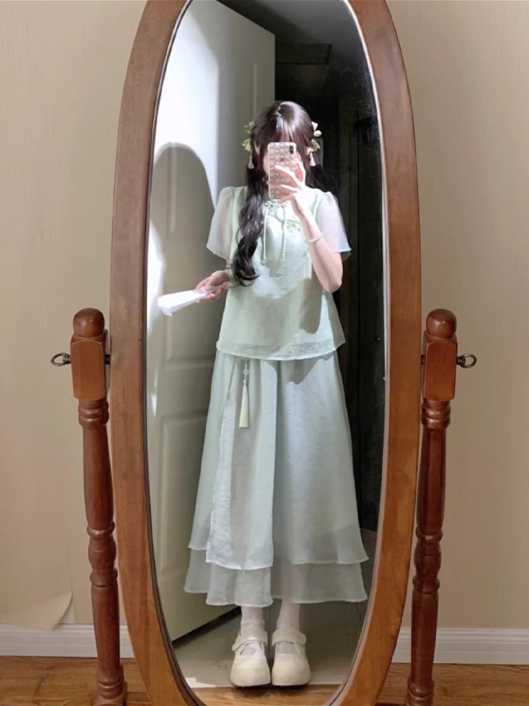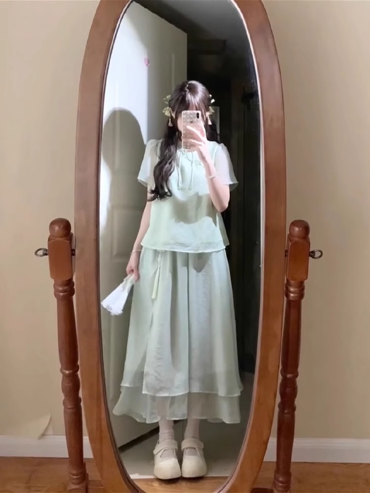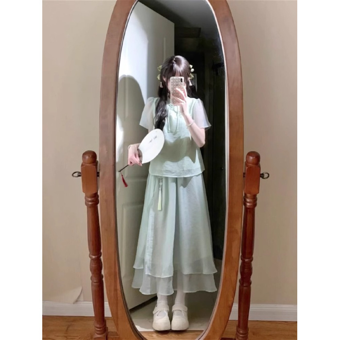 여성을 위한 새로운 중국 스타일 슈트, 여름, 작은 여성, 부드러운 스타일, 디자인 탑과 스커트 투피스 세트