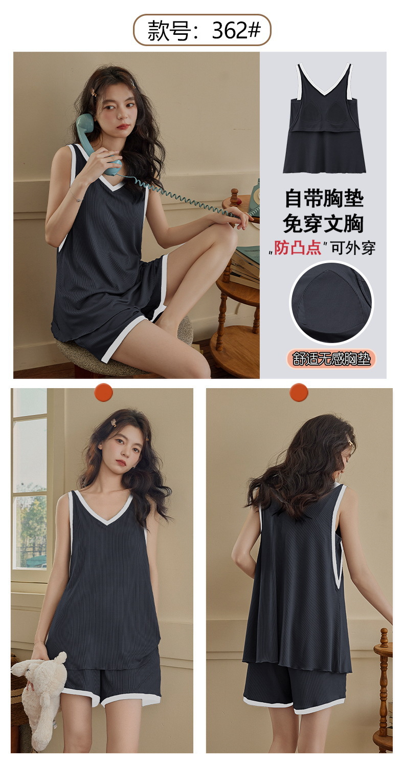 브래지어 잠옷 가슴 패드가있는 여름 새 스타일 솔리드 컬러 느슨한 시원한 얼음 실크 잠옷 여성 여름 홈웨어