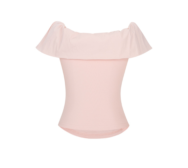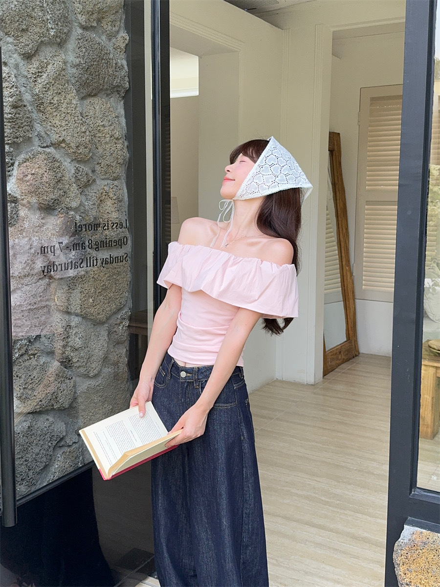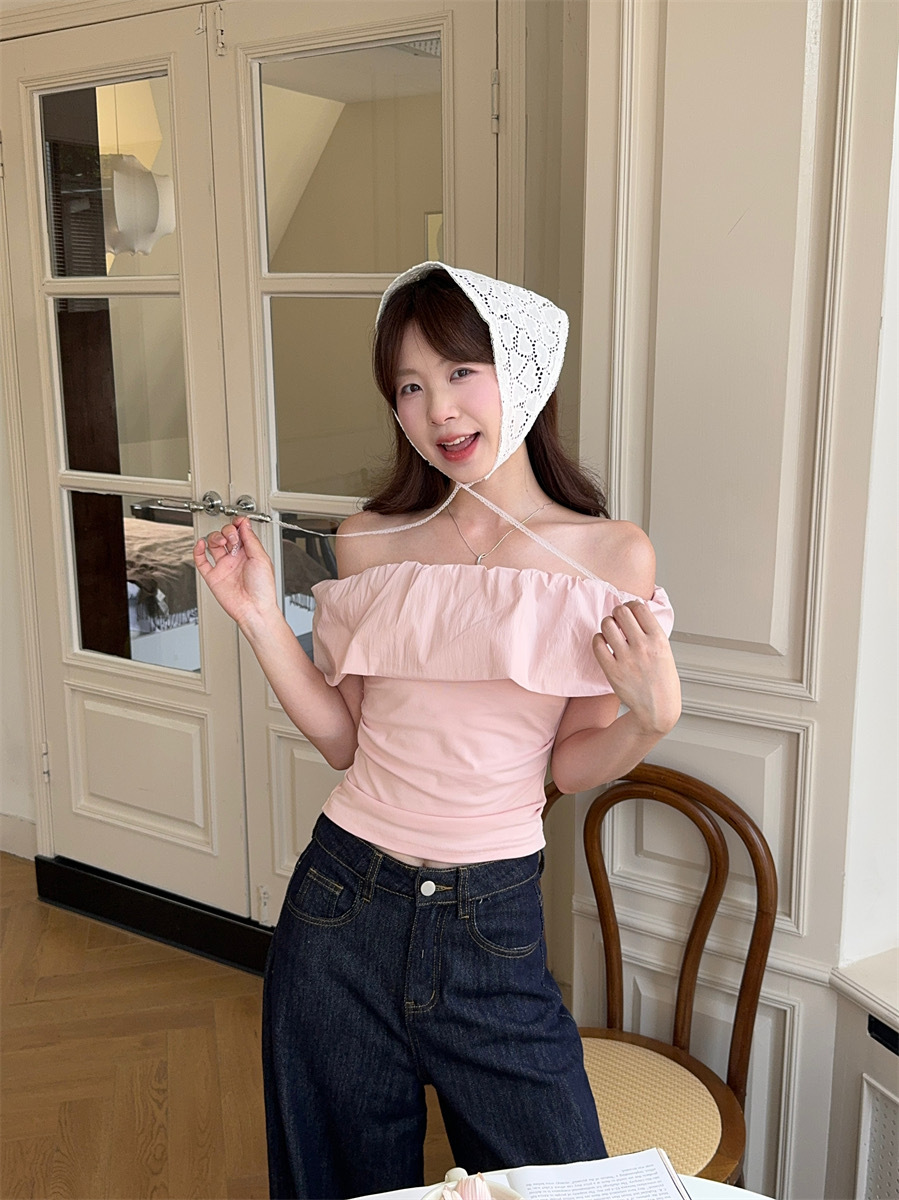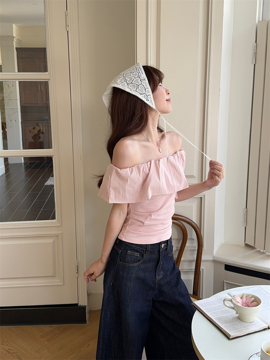 Moses Queen Moses 프렌치 원 숄더 반팔 티셔츠 여성 여름 분위기 러플 크롭 탑