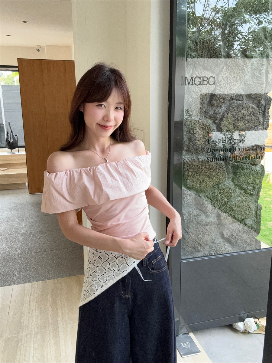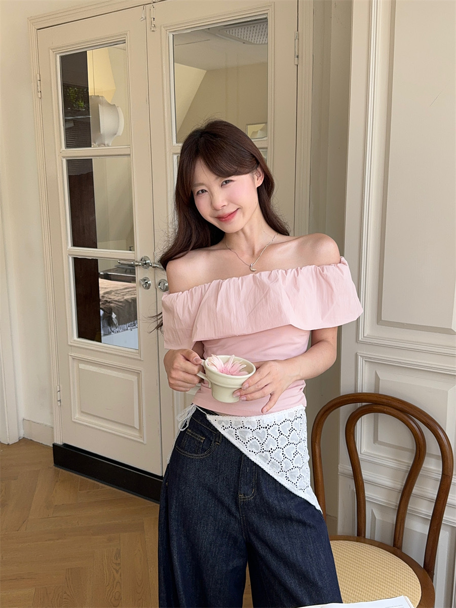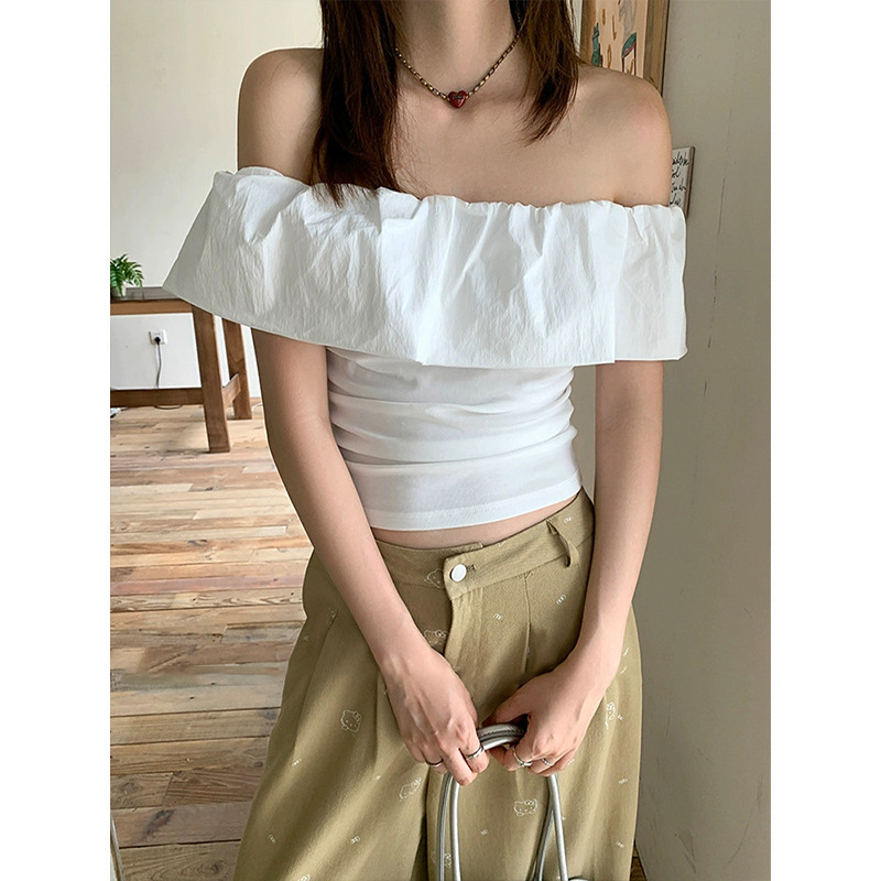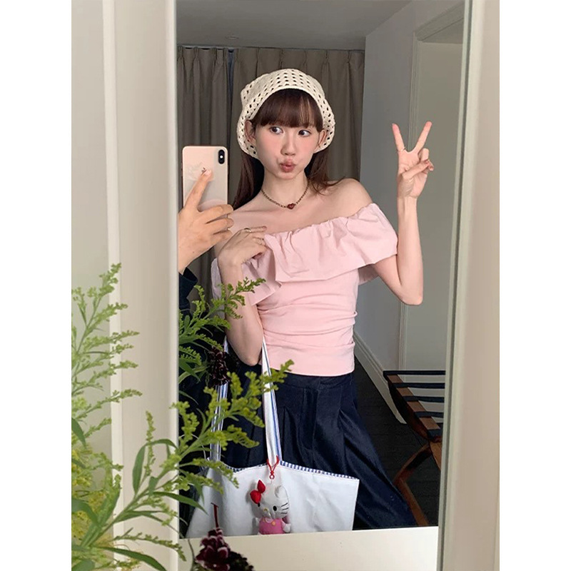 Moses Queen Moses 프렌치 원 숄더 반팔 티셔츠 여성 여름 분위기 러플 크롭 탑스토어 가기
