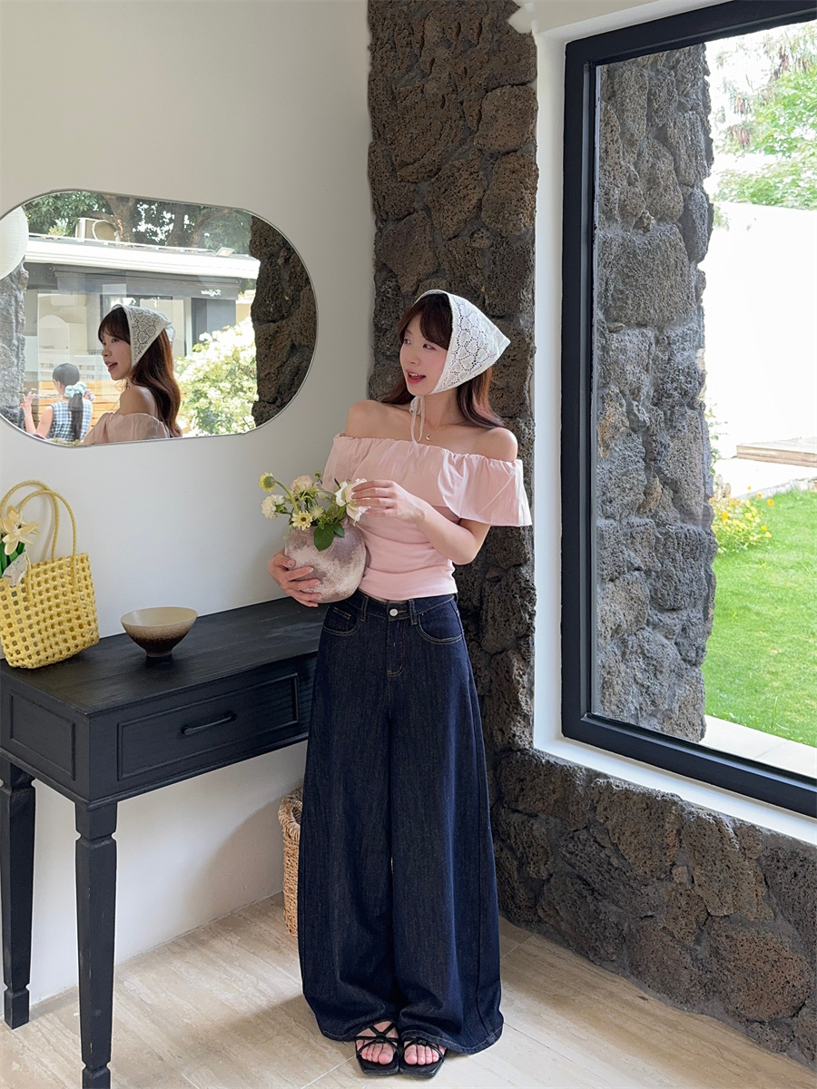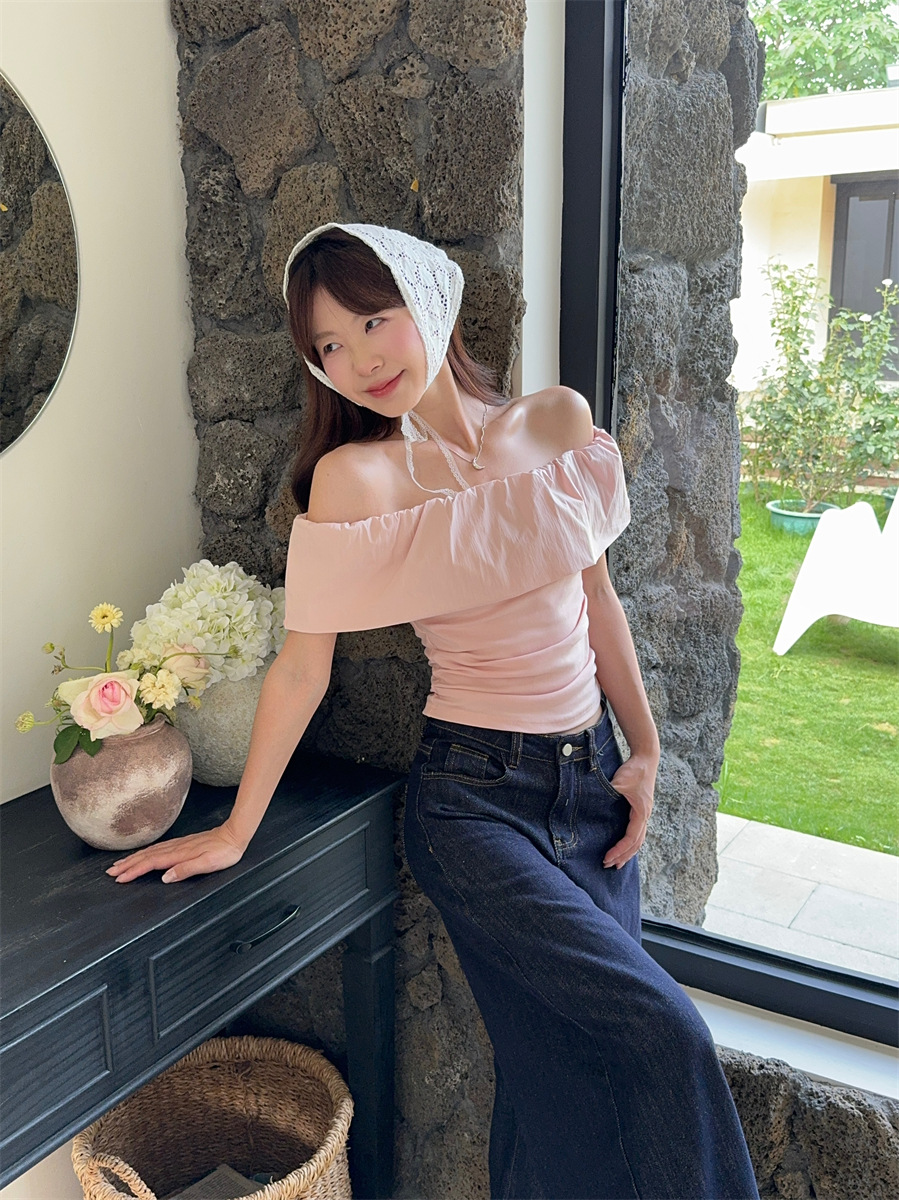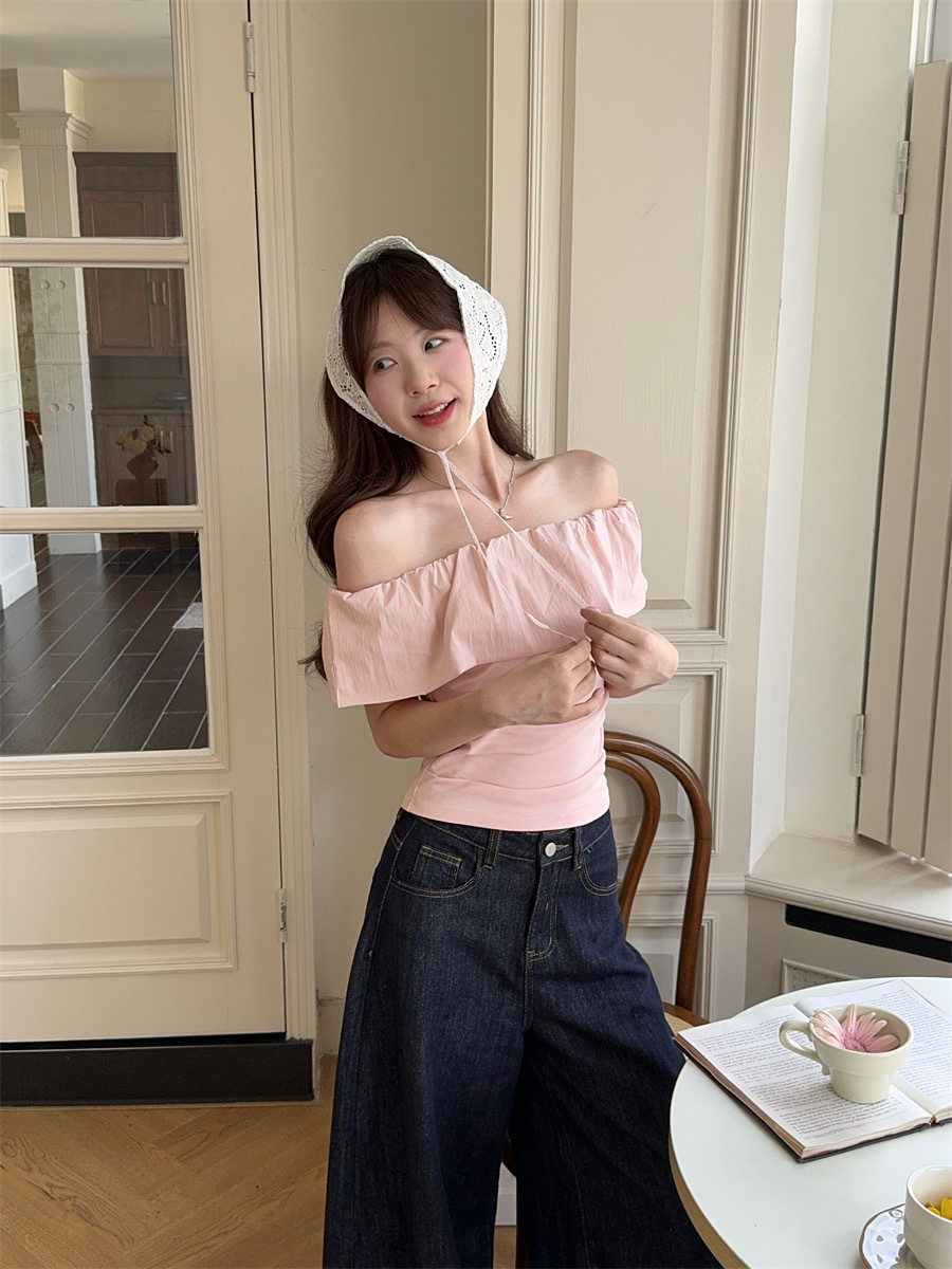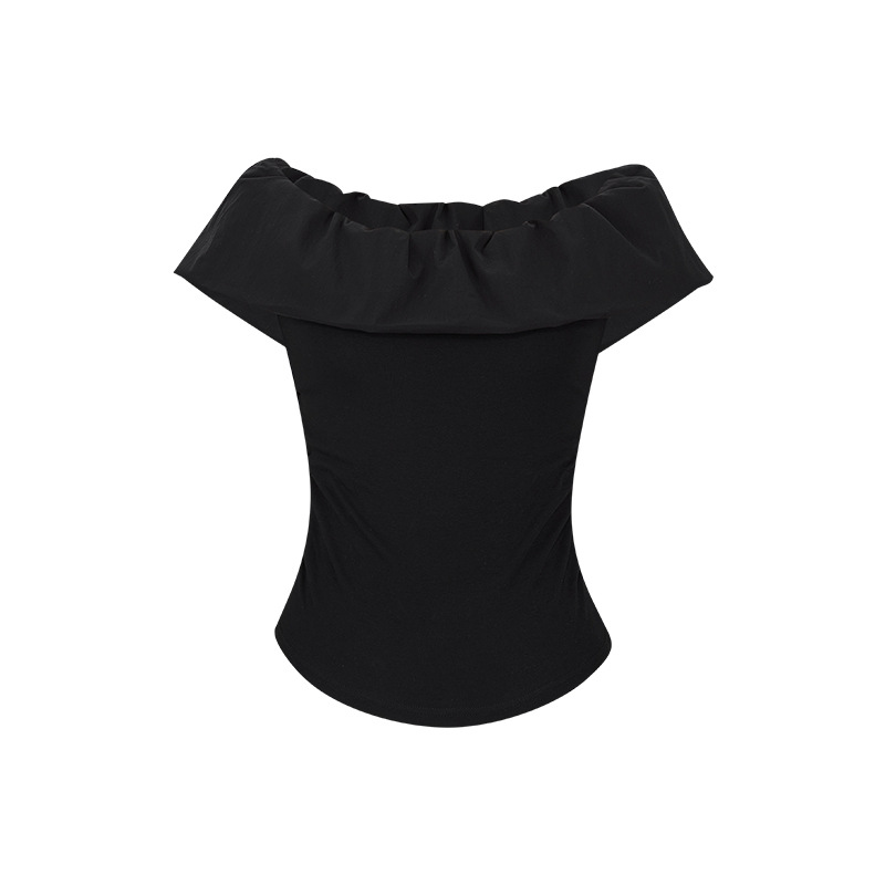 Moses Queen Moses 프렌치 원 숄더 반팔 티셔츠 여성 여름 분위기 러플 크롭 탑스토어 가기