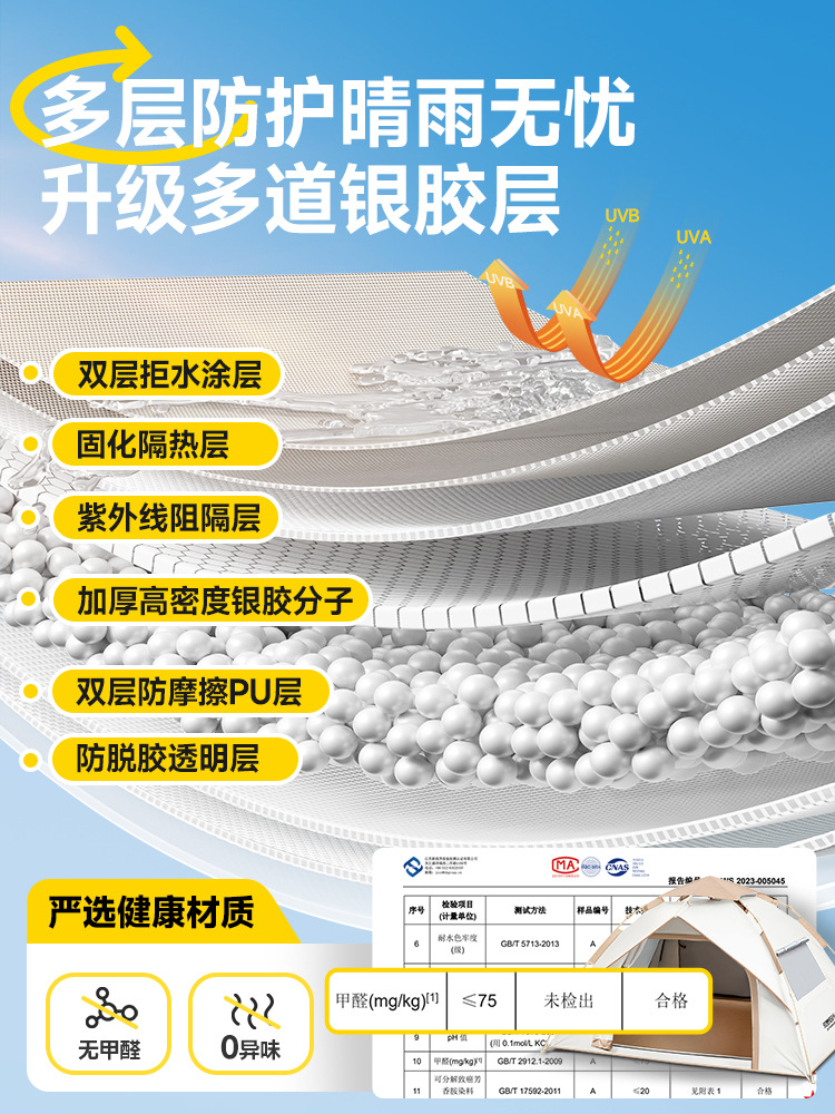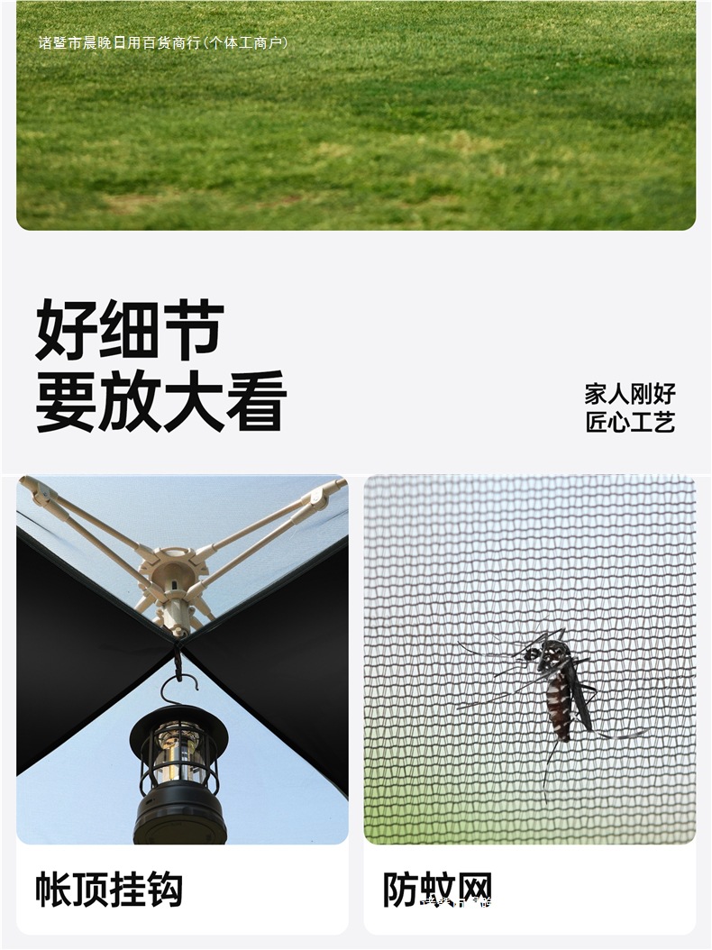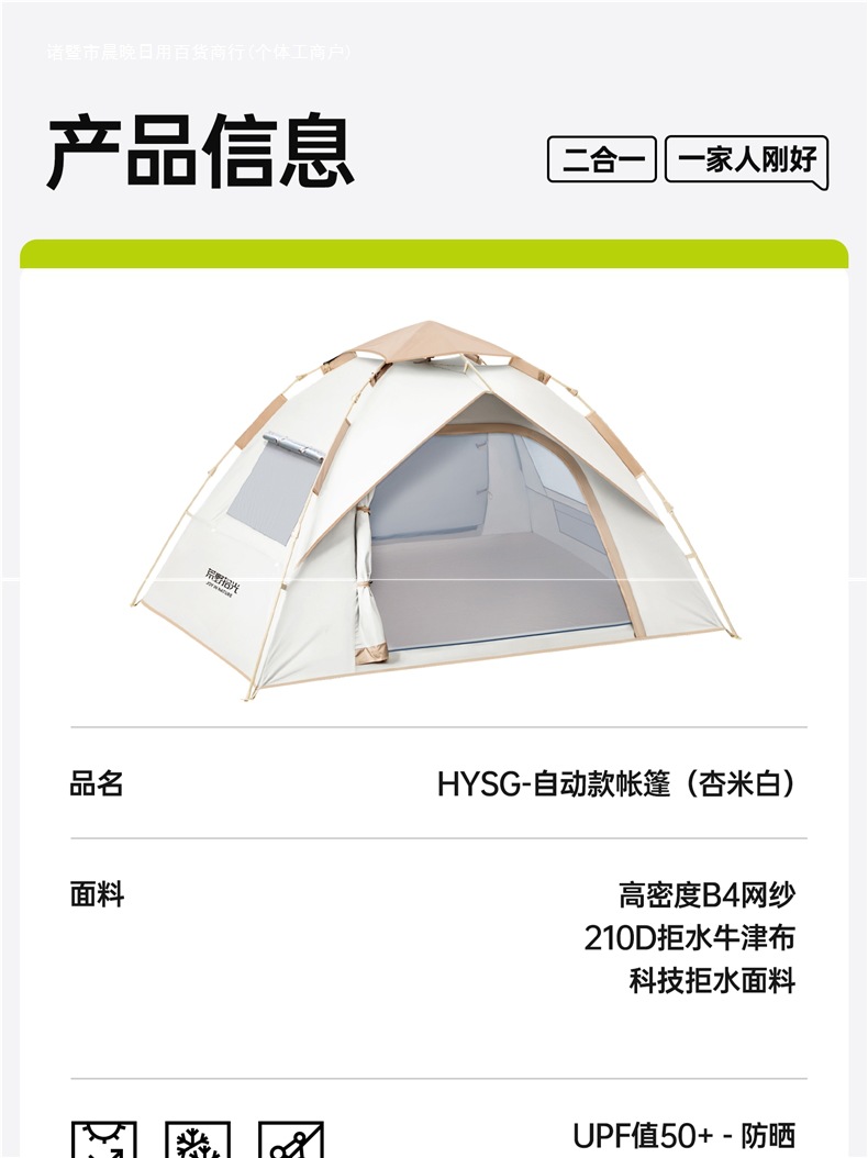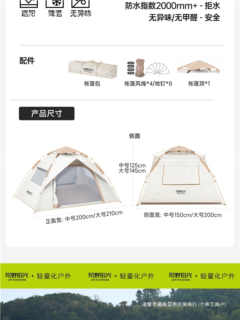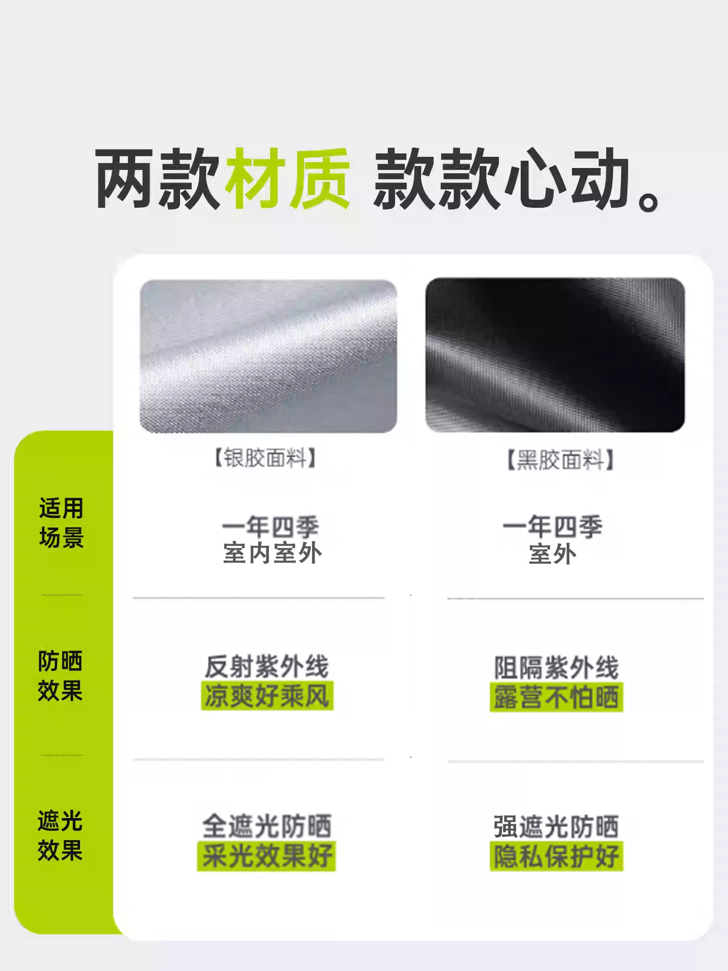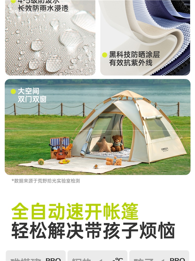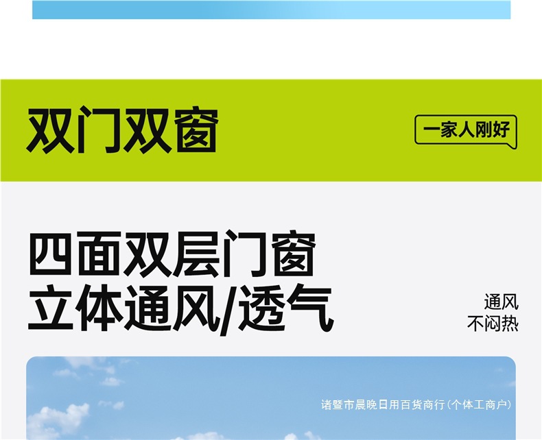 • 이중 레이어 레인 장벽은 자외선 차단을 강화하며, 문 2개와 창문 2개의 외부 텐트를 별도로 사용할 수 있습니다.
