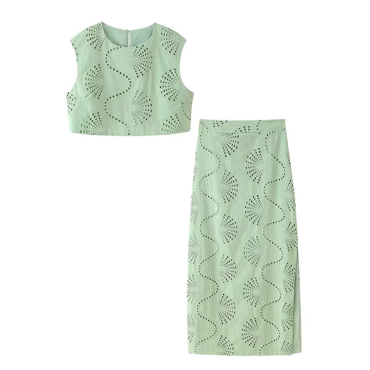 하프조끼 신상 스커트 슈트 기질 자수 패션 슬릿 유럽과 미국의 봄 여름 민소매 중공 크로스보더 여성