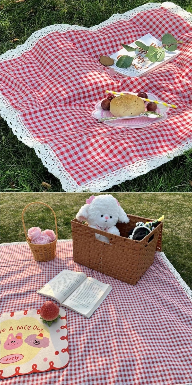 봄 나들이 야외 피크닉 매트 레이스 붉은 격자 무늬 두꺼운 방습 휴대용 바닥 매트 캠핑 사진 촬영 해변 매트스토어 가기